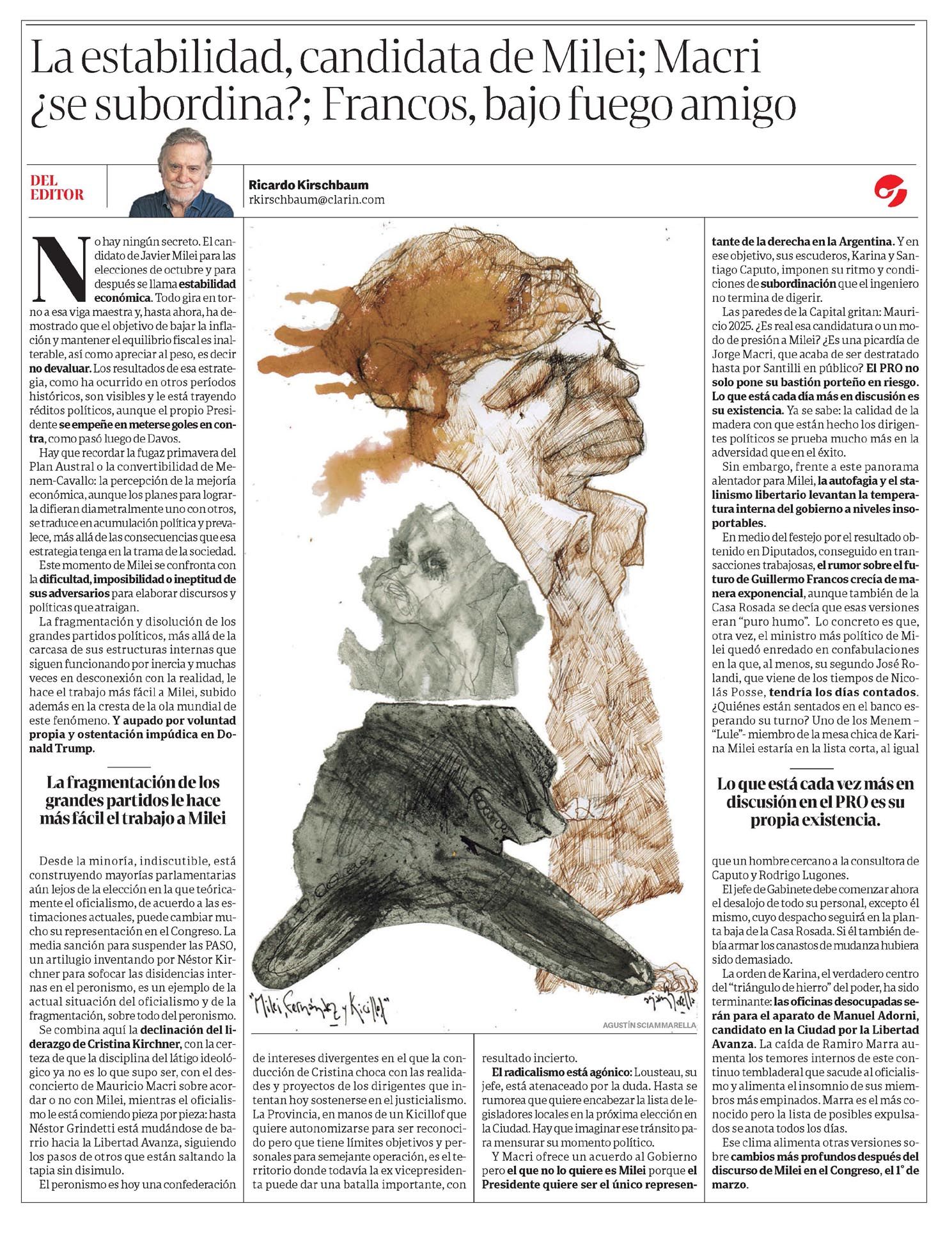 DEL EDITOR La estabilidad, candidata de Milei; Macri ¿se subordina?; Francos, bajo fuego amigo Ricardo Kirschbaum No hay ningún secreto. El candidato de Javier Milei para las elecciones de octubre y para después se llama estabilidad económica. Todo gira en torno a esa viga maestra y, hasta ahora, ha demostrado que el objetivo de bajar la inflación y mantener el equilibrio fiscal es inalterable, así como apreciar al peso, es decir no devaluar. Los resultados de esa estrategia, como ha ocurrido en otros períodos históricos, son visibles y le está trayendo réditos políticos, aunque el propio Presidente se empeñe en meterse goles en contra, como pasó luego de Davos. Hay que recordar la fugaz primavera del Plan Austral o la convertibilidad de Menem- Cavallo: la percepción de la mejoría económica, aunque los planes para lograrla difieran diametralmente uno con otros, se traduce en acumulación política y prevalece, más allá de las consecuencias que esa estrategia tenga en la trama de la sociedad. Este momento de Milei se confronta con la dificultad, imposibilidad o ineptitud de sus adversarios para elaborar discursos y políticas que atraigan. La fragmentación y disolución de los grandes partidos políticos, más allá de la carcasa de sus estructuras internas que siguen funcionando por inercia y muchas veces en desconexión con la realidad, le hace el trabajo más fácil a Milei, subido además en la cresta de la ola mundial de este fenómeno. Y aupado por voluntad propia y ostentación impúdica en Donald Trump. Desde la minoría, indiscutible, está construyendo mayorías parlamentarias aún lejos de la elección en la que teóricamente el oficialismo, de acuerdo a las estimaciones actuales, puede cambiar mucho su representación en el Congreso. La media sanción para suspender las PASO, un artilugio inventando por Néstor Kirchner para sofocar las disidencias internas en el peronismo, es un ejemplo de la actual situación del oficialismo y de la fragmentación, sobre todo del peronismo. Se combina aquí la declinación del liderazgo de Cristina Kirchner, con la certeza de que la disciplina del látigo ideológico ya no es lo que supo ser, con el desconcierto de Mauricio Macri sobre acordar o no con Milei, mientras el oficialismo le está comiendo pieza por pieza: hasta Néstor Grindetti está mudándose de barrio hacia la Libertad Avanza, siguiendo los pasos de otros que están saltando la tapia sin disimulo. El peronismo es hoy una confederación de intereses divergentes en el que la conducción de Cristina choca con las realidades y proyectos de los dirigentes que intentan hoy sostenerse en el justicialismo. La Provincia, en manos de un Kicillof que quiere autonomizarse para ser reconocido pero que tiene límites objetivos y personales para semejante operación, es el territorio donde todavía la ex vicepresidenta puede dar una batalla importante, con resultado incierto. El radicalismo está agónico: Lousteau, su jefe, está atenaceado por la duda. Hasta se rumorea que quiere encabezar la lista de legisladores locales en la próxima elección en la Ciudad. Hay que imaginar ese tránsito para mensurar su momento político. Y Macri ofrece un acuerdo al Gobierno pero el que no lo quiere es Milei porque el Presidente quiere ser el único representante de la derecha en la Argentina. Y en ese objetivo, sus escuderos, Karina y Santiago Caputo, imponen su ritmo y condiciones de subordinación que el ingeniero no termina de digerir. Las paredes de la Capital gritan: Mauricio 2025. ¿Es real esa candidatura o un modo de presión a Milei? ¿Es una picardía de Jorge Macri, que acaba de ser destratado hasta por Santilli en público? El PRO no solo pone su bastión porteño en riesgo. Lo que está cada día más en discusión es su existencia. Ya se sabe: la calidad de la madera con que están hecho los dirigentes políticos se prueba mucho más en la adversidad que en el éxito. Sin embargo, frente a este panorama alentador para Milei, la autofagia y el stalinismo libertario levantan la temperatura interna del gobierno a niveles insoportables. En medio del festejo por el resultado obtenido en Diputados, conseguido en transacciones trabajosas, el rumor sobre el futuro de Guillermo Francos crecía de manera exponencial, aunque también de la Casa Rosada se decía que esas versiones eran "puro humo". Lo concreto es que, otra vez, el ministro más político de Milei quedó enredado en confabulaciones en la que, al menos, su segundo José Rolandi, que viene de los tiempos de Nicolás Posse, tendría los días contados. ¿Quiénes están sentados en el banco esperando su turno? Uno de los Menem – "Lule"- miembro de la mesa chica de Karina Milei estaría en la lista corta, al igual que un hombre cercano a la consultora de Caputo y Rodrigo Lugones. El jefe de Gabinete debe comenzar ahora el desalojo de todo su personal, excepto él mismo, cuyo despacho seguirá en la planta baja de la Casa Rosada. Si él también debía armar los canastos de mudanza hubiera sido demasiado. La orden de Karina, el verdadero centro del "triángulo de hierro" del poder, ha sido terminante: las oficinas desocupadas serán para el aparato de Manuel Adorni, candidato en la Ciudad por la Libertad Avanza. La caída de Ramiro Marra aumenta los temores internos de este continuo tembladeral que sacude al oficialismo y alimenta el insomnio de sus miembros más empinados. Marra es el más conocido pero la lista de posibles expulsados se anota todos los días. Ese clima alimenta otras versiones sobre cambios más profundos después del discurso de Milei en el Congreso, el 1° de marzo. La fragmentación de los grandes partidos le hace más fácil el trabajo a Milei Lo que está cada vez más en discusión en el PRO es su propia existencia. Menciones: c2028op