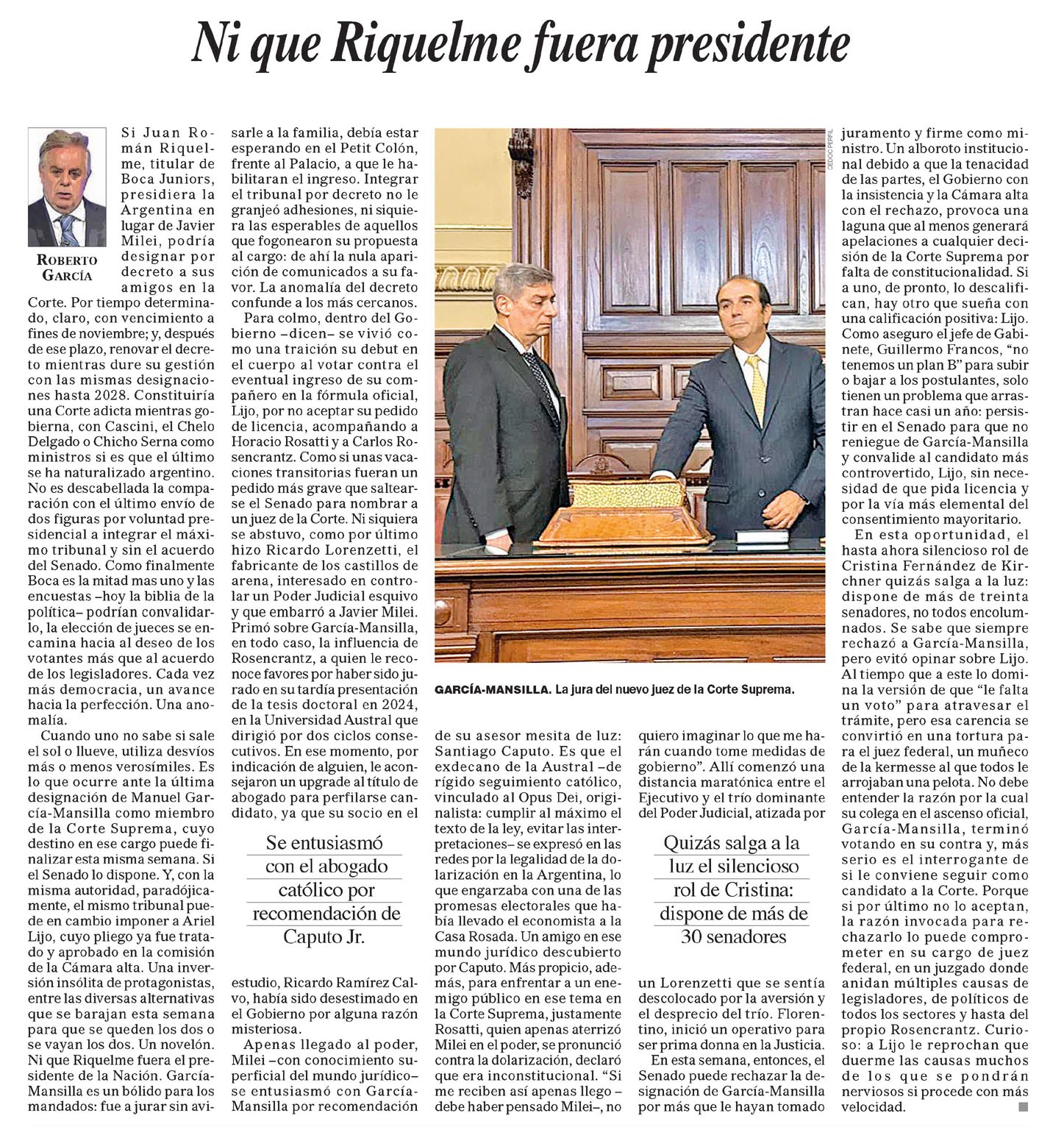 Ni que Riquelme fuera presidente Roberto García Si Juan Román Riquel - me, titular de Boca Juniors, presidiera la Argentina en lugar de Javier Milei, podría designar por decreto a sus amigos en la Corte. Por tiempo determinado, claro, con vencimiento a fines de noviembre; y, después de ese plazo, renovar el decreto mientras dure su gestión con las mismas designaciones hasta 2028. Constituiría una Corte adicta mientras gobierna, con Cascini, el Chelo Delgado o Chicho Serna como ministros si es que el último se ha naturalizado argentino. No es descabellada la comparación con el último envío de dos figuras por voluntad presidencial a integrar el máximo tribunal y sin el acuerdo del Senado. Como finalmente Boca es la mitad mas uno y las encuestas –hoy la biblia de la política– podrían convalidarlo, la elección de jueces se encamina hacia al deseo de los votantes más que al acuerdo de los legisladores. Cada vez más democracia, un avance hacia la perfección. Una anomalía. Cuando uno no sabe si sale el sol o llueve, utiliza desvíos más o menos verosímiles. Es lo que ocurre ante la última designación de Manuel García- Mansilla como miembro de la Corte Suprema, cuyo destino en ese cargo puede finalizar esta misma semana. Si el Senado lo dispone. Y, con la misma autoridad, paradójicamente, el mismo tribunal puede en cambio imponer a Ariel Lijo, cuyo pliego ya fue tratado y aprobado en la comisión de la Cámara alta. Una inversión insólita de protagonistas, entre las diversas alternativas que se barajan esta semana para que se queden los dos o se vayan los dos. Un novelón. Ni que Riquelme fuera el presidente de la Nación. García- Mansilla es un bólido para los mandados: fue a jurar sin avi-sarle a la familia, debía estar esperando en el Petit Colón, frente al Palacio, a que le habilitaran el ingreso. Integrar el tribunal por decreto no le granjeó adhesiones, ni siquiera las esperables de aquellos que fogonearon su propuesta al cargo: de ahí la nula aparición de comunicados a su favor. La anomalía del decreto confunde a los más cercanos. Para colmo, dentro del Gobierno –dicen– se vivió como una traición su debut en el cuerpo al votar contra el eventual ingreso de su compañero en la fórmula oficial, Lijo, por no aceptar su pedido de licencia, acompañando a Horacio Rosatti y a Carlos Rosencrantz. Como si unas vacaciones transitorias fueran un pedido más grave que saltearse el Senado para nombrar a un juez de la Corte. Ni siquiera se abstuvo, como por último hizo Ricardo Lorenzetti, el fabricante de los castillos de arena, interesado en controlar un Poder Judicial esquivo y que embarró a Javier Milei. Primó sobre García-Mansilla, en todo caso, la influencia de Rosencrantz, a quien le reconoce favores por haber sido jurado en su tardía presentación de la tesis doctoral en 2024, en la Universidad Austral que dirigió por dos ciclos consecutivos. En ese momento, por indicación de alguien, le aconsejaron un upgrade al título de abogado para perfilarse candidato, ya que su socio en el estudio, Ricardo Ramírez Calvo, había sido desestimado en el Gobierno por alguna razón misteriosa. Apenas llegado al poder, Milei –con conocimiento superficial del mundo jurídico– se entusiasmó con García- Mansilla por recomendación de su asesor mesita de luz: Santiago Caputo. Es que el exdecano de la Austral –de rígido seguimiento católico, vinculado al Opus Dei, originalista: cumplir al máximo el texto de la ley, evitar las interpretaciones– se expresó en las redes por la legalidad de la dolarización en la Argentina, lo que engarzaba con una de las promesas electorales que había llevado el economista a la Casa Rosada. Un amigo en ese mundo jurídico descubierto por Caputo. Más propicio, además, para enfrentar a un enemigo público en ese tema en la Corte Suprema, justamente Rosatti, quien apenas aterrizó Milei en el poder, se pronunció contra la dolarización, declaró que era inconstitucional. "Si me reciben así apenas llego – debe haber pensado Milei–, no quiero imaginar lo que me harán cuando tome medidas de gobierno". Allí comenzó una distancia maratónica entre el Ejecutivo y el trío dominante del Poder Judicial, atizada por un Lorenzetti que se sentía descolocado por la aversión y el desprecio del trío. Florentino, inició un operativo para ser prima donna en la Justicia. En esta semana, entonces, el Senado puede rechazar la designación de García-Mansilla por más que le hayan tomado juramento y firme como ministro. Un alboroto institucional debido a que la tenacidad de las partes, el Gobierno con la insistencia y la Cámara alta con el rechazo, provoca una laguna que al menos generará apelaciones a cualquier decisión de la Corte Suprema por falta de constitucionalidad. Si a uno, de pronto, lo descalifican, hay otro que sueña con una calificación positiva: Lijo. Como aseguro el jefe de Gabinete, Guillermo Francos, "no tenemos un plan B" para subir o bajar a los postulantes, solo tienen un problema que arrastran hace casi un año: persistir en el Senado para que no reniegue de García-Mansilla y convalide al candidato más controvertido, Lijo, sin necesidad de que pida licencia y por la vía más elemental del consentimiento mayoritario. En esta oportunidad, el hasta ahora silencioso rol de Cristina Fernández de Kirchner quizás salga a la luz: dispone de más de treinta senadores, no todos encolumnados. Se sabe que siempre rechazó a García-Mansilla, pero evitó opinar sobre Lijo. Al tiempo que a este lo domina la versión de que "le falta un voto" para atravesar el trámite, pero esa carencia se convirtió en una tortura para el juez federal, un muñeco de la kermesse al que todos le arrojaban una pelota. No debe entender la razón por la cual su colega en el ascenso oficial, García-Mansil la, terminó votando en su contra y, más serio es el interrogante de si le conviene seguir como candidato a la Corte. Porque