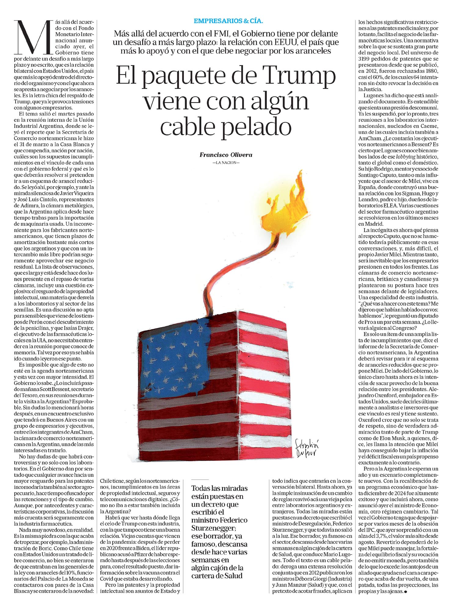 EMPRESARIOS & CÍA. El paquete de Trump viene con algún cable pelado Francisco Olivera —LA NACION— Más allá del acuerdo con el FMI, el Gobierno tiene por delante un desafío a más largo plazo: la relación con EEUU, el país que más lo apoyó y con el que debe negociar por los aranceles Más allá del acuerdo con el Fondo Monetario Internacional anunciado ayer, el Gobierno tiene por delante un desafío a más largo plazo y no escrito, que es la relación bilateral con Estados Unidos, el país que más lo apoyó dentro del directorio del organismo y con el que ahora se apresta a negociar por los aranceles. Es la letra chica del respaldo de Trump, que ya le provoca tensiones con algunos empresarios. El tema salió el martes pasado en la reunión interna de la Unión Industrial Argentina, donde se leyó el reporte que la Secretaría de Comercio norteamericana le hizo el 31 de marzo a la Casa Blanca y que compendia, nación por nación, cuáles son los supuestos incumplimientos en el vínculo de cada una con el gobierno federal y qué es lo que deberán resolver si pretenden ir a un esquema de arancel reducido. Se leyó ahí, por ejemplo, y ante la mirada silenciosa de Javier Viqueira y José Luis Cintolo, representantes de Adimra, la cámara metalúrgica, que la Argentina aplica desde hace tiempo trabas para la importación de maquinaria usada. Un inconveniente para los fabricantes norteamericanos, que tienen plazos de amortización bastante más cortos que los argentinos y que con un intercambio más libre podrían seguramente aprovechar ese negocio residual. La lista de observaciones, que es larga y está desde hace dos lunes presente en el repaso de varias cámaras, incluye una cuestión explosiva: el resguardo de la propiedad intelectual, una materia que desvela a los laboratorios y al sector de las semillas. Es una discusión no apta para sensibles que viene de los tiempos de Perón con el descubrimiento de la penicilina, y que Isaías Drajer, el ejecutivo de las farmacéuticas locales en la UIA, no necesitaba entender en la reunión porque conoce de memoria. Tal vez por eso ya se había ido cuando leyeron ese punto. Es imposible que algo de esto no esté en la agenda norteamericana y esta vez con mayor intensidad. El Gobierno lo sabe. ¿Lo incluirá pasado mañana Scott Bessent, secretario del Tesoro, en sus reuniones durante la visita a la Argentina? Es probable. Sin dudas lo mencionará horas después, en un encuentro exclusivo que tendrá en Buenos Aires con un grupo de empresarios y ejecutivos, entre ellos integrantes de AmCham, la cámara de comercio norteamericana en la Argentina, una de las más interesadas en tratarlo. No hay dudas de que habrá controversias y no solo con los laboratorios. En el Gobierno dan por sentado que cualquier avance hacia un mayor resguardo para las patentes incomodaría también al sector agropecuario, hace tiempo ofuscado por las retenciones y el tipo de cambio. Aunque, por antecedentes y características corporativas, la discusión más cruenta será seguramente con la industria farmacéutica. Nada muy novedoso, en realidad. Es la misma piedra con la que acaba de tropezar, por ejemplo, la administración de Boric. Como Chile tiene con Estados Unidos un tratado de libre comercio, no bien se enteraron de que entraban en las generales de la ley con aranceles del 10%, funcionarios del Palacio de La Moneda se contactaron con pares de la Casa Blanca y se enteraron de la novedad: Chile tiene, según los norteamericanos, incumplimientos en las áreas de propiedad intelectual, seguros y telecomunicaciones digitales. ¿Cómo no iba a estar también incluida la Argentina? Habrá que ver hasta dónde llega el celo de Trump con esta industria, con la que tampoco tiene una buena relación. Viejas cuentas que vienen de la pandemia: después de perder en 2020frente a Biden, el líder republicano acusó a Pfizer de haber esperado hasta después de las elecciones para, con el resultado puesto, dar información sobre la vacuna contra el Covid que estaba desarrollando. Pero las patentes y la propiedad intelectual son asuntos de Estado y todo indica que entrarán en la conversación bilateral. Hasta ahora, ya la simple insinuación de un cambio de reglas reavivó acá una vieja pelea entre laboratorios argentinos y extranjeros. Todas las miradas están puestas en un decreto que escribió el ministro de Desregulación, Federico Sturzenegger, y que todavía no salió a la luz. Ese borrador, ya famoso en el sector, descansa desde hace varias semanas en algún cajón de la cartera de Salud, que conduce Mario Lugo- nes. Todo el texto es un cable pelado: deroga una extensa resolución conjunta que en 2012 publicaron los ministros Débora Giorgi (Industria) y Juan Manzur (Salud) y que, con el pretexto de acotar fraudes, aplica en los hechos significativas restricciones a las patentes medicinales y, por lo tanto, facilita el negocio de las farmacéuticas locales. Una normativa sobre la que se sustenta gran parte del negocio local. Del universo de 3199 pedidos de patentes que se presentaron desde que se publicó, en 2012, fueron rechazadas 1880, casi el 60%, de los cuales 64 intentaron sin éxito revocar la decisión en la Justicia. Lugones ha dicho que está analizando el documento. Es entendible que sienta una presión descomunal. Ya les suspendió, por lo pronto, tres reuniones a los laboratorios internacionales, nucleados en Caeme, una de las cuales incluía también a AmCham. ¿Le contarán los ejecutivos norteamericanos a Bessent? Es cierto que Lugones conoce bien ambos lados de ese lobbying histórico, tanto el global como el doméstico. Su hijo Rodrigo, mentor y exsocio de Santiago Caputo, tanto o más influyente que el asesor de Milei, vive en España, donde construyó una buena relación con los Sigman, Hugo y Leandro, padre e hijo, dueños de laboratorios ELEA. Varias cuestiones del sector farmacéutico argentino se resolvieron en los últimos meses en Madri