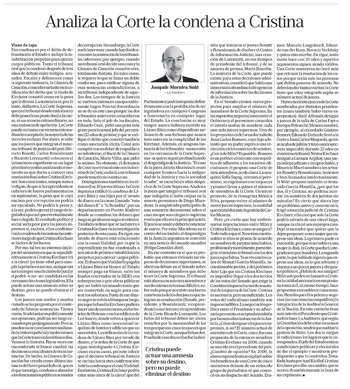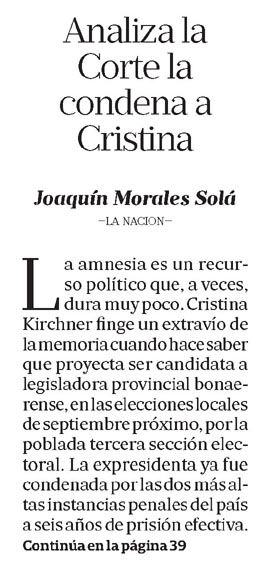 Analiza la Corte la condena a Cristina Joaquín Morales Solá -LANACION- La amnesia es un recurso político que, a veces, dura muy poco. Cristina Kirchner finge un extravío de la memoria cuando hace saber que proyecta ser candidata a legisladora provincial bonaerense, en las elecciones locales de septiembre próximo, por la poblada tercera sección electoral. La expresidenta ya fue condenada por las dos más altas instancias penales del país a seis años de prisión efectiva. Esa condena es por el delito de defraudación al Estado e incluye la inhabilitación perpetua para ejercer cargos públicos. Tanto el tribunal oral que la condenó después de tres años de debate entre testigos, acusados, fiscales y defensores como la siguiente instancia, la Cámara de Casación, coincidieron tanto en la calificación del delito que la viuda de Kirchner cometió como en la pena que le dieron. La sentencia es, por lo tanto, definitiva. La Corte Suprema, que es el tribunal donde está ahora y debe ponerle un punto final a la causa, es un recurso extraordinario, no una instancia de apelación. La Corte puede rechazar ese recurso extraordinario o aceptarlo; la mayoría de las veces los rechaza. Por ahora, se sabe que los jueces que integran el máximo tribunal de justicia del país (Horacio Rosatti, Carlos Rosenkrantz y Ricardo Lorenzetti) colocaron el voluminoso expediente en un lugar prioritario y están analizando el momento en que darán a conocer una resolución final sobre Cristina Kirch- ner. Son conscientes, aunque nunca lo digan, de que si la expresidenta se cubriera de fueros parlamentarios en septiembre, la pena que le cayó encima por corrupción no podría ser ejecutada. No podría ir presa y, a la vez, podría ejercer el cargo de legisladora para el que eventualmente fuera elegida. El resultado político y social sería peor para los jueces supremos si, encima, ellos confirmaran la condena de las instancias anteriores luego de que Cristina Kirchner se hiciera de los fueros. Por eso, tal vez no estemos tan lejos del momento en que se sepa definitivamente si Cristina Kirchner irá a la cárcel (ya tiene edad para cumplir la prisión en su casa, aunque esa será siempre una decisión del juez) y si podrá -o no- ser candidata en las cercanas elecciones legislativas. Ella puede actuar una amnesia sobre su destino, pero no puede eliminar el destino. Los jueces son sordos y mudos cuando se les pregunta por el contenido de futuras sentencias. Tienen razón. Si adelantaran públicamente sus opiniones, podrían ser luego recusados por prejuzgamiento. Pero se pueden sacar conclusiones analizando la historiajudicial y las decisiones que la Corte tomó en los últimos días. Veamos la historia. Raras veces ese encumbrado tribunal cambió las decisiones coincidentes de otras instancias. De hecho, la Cámara de Casación fue creada como última instancia del fuero penal federal, que es el que investiga, condena o absuelve a los funcionarios públicos acusados de corrupción. Sin embargo, la Corte suele intervenir cuando hay disidencia entre la sentencias de los tribunales inferiores; por ejemplo, cuando un tribunal oral decide una cosa y la Cámara de Casación resuelve otra, totalmente distinta. En tales casos, le requiere lo que se llama un doble conforme, para ratificar alguna de esas sentencias contradictorias, a un tribunal independiente de aquellos dos. Los tiempos de la Justicia se vuelven entonces insoportablemente largos. Pero tal discordancia no se da en este caso porque los dos tribunales anteriores coincidieron en todo. Solo el jefe de los fiscales, Eduardo Casal, pidió una pena más grave para la actual jefa del peronismo (12 años de prisión) y que se califique el delito que cometió también como asociación ilícita. Casal solo cumplió con su deber de respaldar a su subalterno, el fiscal de la Cámara de Casación, Mario Villar, que pidió lo mismo. No obstante, el dictamen de Casal no es vinculante con la decisión de la Corte; es decir, este tribunal puede tenerlo en cuenta o no. Detengámonos también en los últimos días. El jueves último, la Corte Suprema ratificó la condena de Lázaro Báez y sus hijos por el lavado de dinero en la causa llamada "ruta del dinero K" o "la Rosadita", por un departamento en Puerto Madero donde se contaban los dólares que luego se giraban en negro al exterior. También ordenó que se incluyera a Cristina Kirchner en la investigación posterior de esta causa. En rigor, ese lavado de dinero está relacionado con la causa Vialidad, por la que la expresidenta ya fue condenada a seis años de prisión e inhabilitación perpetua para ejercer cargos públicos. El dinero que Vialidad le pagaba a Lázaro Báez en blanco (el Estado siempre paga en blanco, salvo los fondos reservados de la SIDE) con sobreprecios o por obras públicas que no había terminado tenía que ser convertido en negro para costear los sobornos. Parte de ese dinero negro se volvía a blanquear luego, para que la familia Kirchner pudiera hacer uso de esos recursos, en los hoteles de Hotesur o en los edificios de Los Sauces, donde volvía a aparecer Lázaro Báez como inverosímil inquilino de hoteles y edificios que no necesitaba. La ratificación de la condena de Lázaro Báez por lavado de dinero, y la orden de la Corte de que sigan investigando a Cristina Kirchner en esa causa, permite inferir que el decisivo tribunal de Justicia se inclina hacia otra confirmación: la de la condena por el caso Vialidad. En síntesis, Cristina Kirchner podría estar más cerca de la cárcel que del Parlamento y podría tropezar definitivamente con la prohibición de ser legisladora en cualquier Congreso o funcionaría en cualquier lugar del Estado. La conclusión es muy simple: nunca hubiera existido un Lázaro Báez como dispendioso millonario de una fortuna que nunca tuvo antes sin la complicidad de los Kirchner. Además, en ninguna instancia de los tribunales -menos aún en las cercanías de 