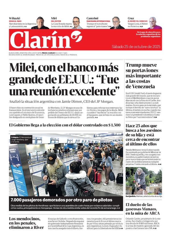 Clarín Tapa Wiñazki IDEAS AL PASO Narcofascismo en la Argentina y Latinoamérica. P. 2 Miri DEL EDITOR La Casa Rosada espera la reacción de Milei. P. 3 Cantelmi PANORAMA INTERNACIONAL Trump y el tumultuoso regreso al "patio trasero". P. 26 Cruz EL REVÉS Y EL DERECHO Vargas Llosa, el Nobel en Palestina. P. 27 Milei, con el banco más grande de EE.UU.: "Fue una reunión excelente" Analizó la situación argentina con Jamie Dimon, CEO del JP Morgan. El banco hizo su convención anual en Buenos Aires. En el encuentro estuvieron también el ministro de Economía, Luis Caputo, y Pablo Quirno, el canciller designado en reemplazo de Gerardo Werthein. El JP Morgan es uno de los bancos estadounidenses que por pedido del Tesoro de EE.UU. están negociando un préstamo de 20.000 millones de dólares que le sirva al Gobierno para reforzar sus reservas y hacer frente a los pagos de la deuda. Milei consideró "excelente" la reunión con el banquero, que se hizo en un museo porteño. P. 4 El Gobierno llega a la elección con el dólar controlado en $ 1.500 7.000 pasajeros demorados por otro paro de pilotos Otra medida de los pilotos de Aerolíneas -que hicieron una asamblea de cuatro horas por reclamos salariales- complicó los vuelos, principalmente en Aeroparque. Venían de otra medida similar antes del reciente fin de semana largo. P. 37 Colapso. El Aeroparque Jorge Newbery, ayer a la tarde. Los mendocinos, en los penales, eliminaron a River El equipo de Gallardo y otra frustración, anoche en Córdoba. Después de empatar sin goles ante Independiente Rivadavia por la semifinal de la Copa Argentina, en una cancha anegada tras el diluvio, fueron a los penales. Allí prevalecieron los mendocinos (4-3) con el último marcado por Villa y ahora pelearán por el título ante Argentinos Juniors. El ganador clasificará para la Libertadores del 2026.P. 50 Trump mueve su portaviones más importante a las costas de Venezuela Es el USS Gerald Ford, el navío de guerra más grande del mundo, que se encuentra en el Mediterráneo y que en pocos días estará con la flota en el Caribe, donde ya hay ocho destructores y un submarino. Es otro paso en la escalada, que incluye el derribo de "narco lanchas": la última, el jueves a la noche, cuando mataron a sus seis tripulantes. EE.UU. sancionó al presidente colombiano Gustavo Petro por "narcoterrorismo". P. 28 Hace 25 años que busca a los asesinos de su hija y está cerca de encontrar al último de ellos Natalia Melmann tenía 15 años cuando fue asesinada por policías de Miramar en 2001. Desde aquel día, y en una gesta conmovedora, su padre Gustavo se juró no parar nunca hasta que se hiciera justicia: cuatro de los delincuentes ya cumplen perpetua. Y están cercando al último. P. 44 Será justicia. Melman, ante la tumba de su hija. El dueño de las gaseosas Manaos, en la mira de ARCA Orlando Canito, propietario de la empresa, fue citado a indagatoria por una deuda de $ 800 millones. ARCA lo acusa de evasión agravada del impuesto a las Ganancias e IVA. P. 22