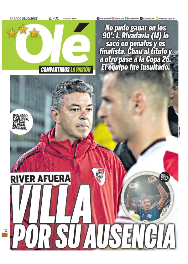 Olé tapa RIVER AFUERA Villa POR SU AUSENCIA } GALL ARDO Y GALOPPO, QUE TIRÓ SU PENAL DESVIADO. VILLA VERDUGO: HIZO EL DEL 4-3 FINAL. No pudo ganar en los 90’: I. Rivadavia (M) lo sacó en penales y es finalista. Chau al título y a otro pase a la Copa 26. El equipo fue insultado