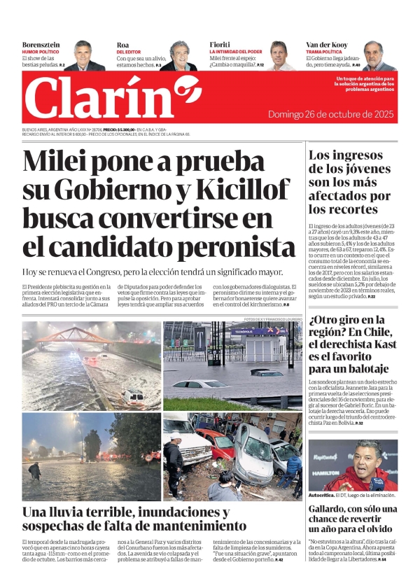 Clarín Tapa Milei pone a prueba su Gobierno y Kicillof busca convertirse en el candidato peronista Hoy se renueva el Congreso, pero la elección tendrá un significado mayor. El Presidente plebiscita su gestión en la primera elección legislativa que enfrenta. Intentará consolidar junto a sus aliados del PRO un tercio de la Cámara de Diputados para poder defender los vetos que firme contra las leyes que impulse la oposición. Pero para aprobar leyes tendrá que ampliar sus acuerdos con los gobernadores dialoguistas. El peronismo dirime su interna y el gobernador bonaerense quiere avanzar en el control del kirchnerismo. P. 8 Los ingresos de los jóvenes son los más afectados por los recortes El ingreso de los adultos jóvenes (de 23 a 27 años) cayó un 9,3% este año, mientras que los de los adultos de 43 a 47 años subieron 5,4% y los de los adultos mayores, de 63 a 67, treparon 12,4%. Esto ocurre en un contexto en el que el consumo total de la economía se encuentra en niveles récord, similares a los de 2017, pero con los salarios estancados desde diciembre. En julio, los sueldos se ubicaban 5,2% por debajo de noviembre de 2023 en términos reales, según un estudio privado. P. 22 ¿Otro giro en la región? En Chile, el derechista Kast es el favorito para un balotaje Los sondeos plantean un duelo estrecho con la oficialista Jeannette Jara para la primera vuelta de las elecciones presidenciales del 16 de noviembre, para elegir al sucesor de Gabriel Boric. En un balotaje la derecha vencería. Eso puede ocurrir luego del triunfo del centroderechista Paz en Bolivia. P. 32 Una lluvia terrible, inundaciones y sospechas de falta de mantenimiento El temporal desde la madrugada provocó que en apenas cinco horas cayera tanta agua -115mm- como en el promedio de octubre. Los barrios más cercanos a la General Paz y varios distritos del Conurbano fueron los más afectados. La avenida se vio colapsada y el problema se atribuyó a fallas de mantenimiento de las concesionarias y a la falta de limpieza de los sumideros. "Fue una situación grave", apuntaron desde el Gobierno porteño. P. 42 Gallardo, con sólo una chance de revertir un año para el olvido "No estuvimos a la altura", dijo tras la caída en la Copa Argentina. Ahora apuesta todo al campeonato local, última posibilidad de llegar a la Libertadores. P. 54 Borensztein HUMOR POLÍTICO El show de las bestias peludas. P. 2 Roa DEL EDITOR Con que sea un alivio, estamos hechos. P. 3 Fioriti LA INTIMIDAD DEL PODER Milei frente al espejo: ¿Cambia o maquilla?. P. 12 Van der Kooy TRAMA POLÍTICA El Gobierno llega jadeando, pero tiene ayuda. P. 40
