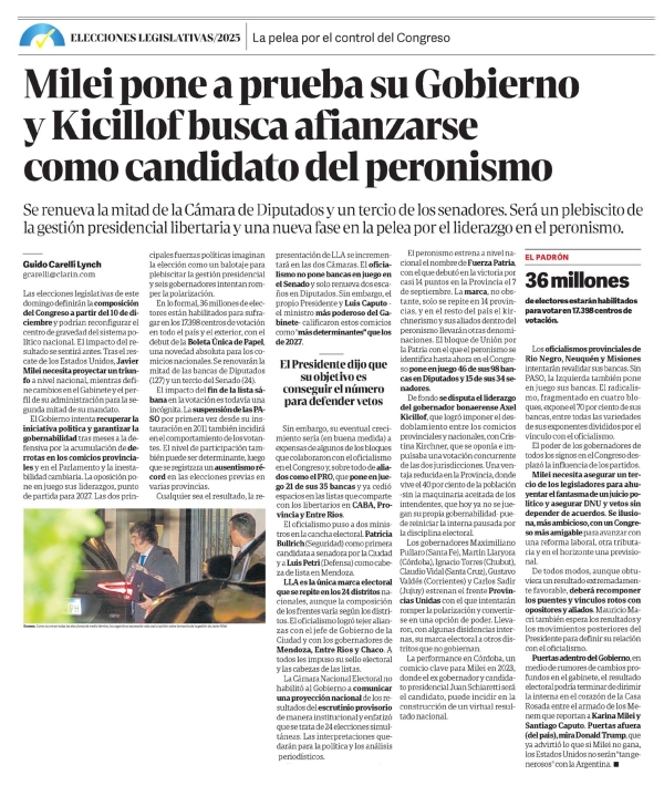 Milei pone a prueba su Gobierno y Kicillof busca afianzarse como candidato del peronismo Guido Carelli Lynch Se renueva la mitad de la Cámara de Diputados y un tercio de los senadores. Será un plebiscito de la gestión presidencial libertaria y una nueva fase en la pelea por el liderazgo en el peronismo. Guido Carelli Lynch gcarelli@clarin.com Las elecciones legislativas de este domingo definirán la composición del Congreso a partir del 10 de diciembre y podrían reconfigurar el centro de gravedad del sistema político nacional. El impacto del resultado se sentirá antes. Tras el rescate de los Estados Unidos, Javier Milei necesita proyectar un triunfo a nivel nacional, mientras define cambios en el Gabinete y el perfil de su administración para la segunda mitad de su mandato. El Gobierno intenta recuperar la iniciativa política y garantizar la gobernabilidad tras meses a la defensiva por la acumulación de derrotas en los comicios provinciales y en el Parlamento y la inestabilidad cambiaria. La oposición pone en juego sus liderazgos, punto de partida para 2027. Las dos principales fuerzas políticas imaginan la elección como un balotaje para plebiscitar la gestión presidencial y seis gobernadores intentan romper la polarización. En lo formal, 36 millones de electores están habilitados para sufragar en los 17398 centros de votación en todo el país y el exterior, con el debut de la Boleta Única de Papel, una novedad absoluta para los comicios nacionales. Se renovarán la mitad de las bancas de Diputados (127) y un tercio del Senado (24). El impacto del fin de la lista sábana en la votación es todavía una incógnita. La suspensión de las PASO por primera vez desde su instauración en 2011 también incidirá en el comportamiento de los votantes. El nivel de participación también puede ser determinante, luego de que se registrara un ausentismo récord en las elecciones previas en varias provincias. Cualquier sea el resultado, la representación de LLA se incrementará en las dos Cámaras. El oficialismo no pone bancas en juego en el Senado y solo renueva dos escaños en Diputados. Sin embargo, el propio Presidente y Luis Caputo, el ministro más poderoso del Gabinete, calificaron estos comicios como "más determinantes" que los de 2027. El Presidente dijo que su objetivo es conseguir el número para defender vetos. Sin embargo, su eventual crecimiento sería (en buena medida) a expensas de algunos de los bloques que colaboraron con el oficialismo en el Congreso y, sobre todo de aliados como el PRO, que pone en juego 21 de sus 35 bancas y ya cedió espacios en las listas que comparte con los libertarios en CABA, Provincia y Entre Ríos. El oficialismo puso a dos ministros en la cancha electoral: Patricia Bullrich (Seguridad) como primera candidata a senadora por la Ciudad y a Luis Petri (Defensa) como cabeza de lista en Mendoza. LLA es la única marca electoral que se repite en los 24 distritos nacionales, aunque la composición de los frentes varía según los distritos. El oficialismo logró tejer alianzas con el jefe de Gobierno de la Ciudad y con los gobernadores de Mendoza, Entre Ríos y Chaco. A todos les impuso su sello electoral y las cabezas de las listas. La Cámara Nacional Electoral no habilitó al Gobierno a comunicar una proyección nacional de los resultados del escrutinio provisorio de manera institucional y enfatizó que se trata de 24 elecciones simultáneas. Las interpretaciones quedarán para la política y los análisis periodísticos. El peronismo estrena a nivel nacional el nombre de Fuerza Patria, con el que debutó en la victoria por casi 14 puntos en la Provincia el 7 de septiembre. La marca, no obstante, solo se repite en 14 provincias, y en el resto del país el kirchnerismo y sus aliados dentro del peronismo llevarán otras denominaciones. El bloque de Unión por la Patria con el que el peronismo se identifica hasta ahora en el Congreso pone en juego 46 de sus 98 bancas en Diputados y 15 de sus 34 senadores. De fondo se disputa el liderazgo del gobernador bonaerense Axel Kicillof, que logró imponer el desdoblamiento entre los comicios provinciales y nacionales, con Cristina Kirchner, que se oponía e impulsaba una votación concurrente en las dos jurisdicciones. Una ventaja reducida en la Provincia, donde vive el 40 por ciento de la población -sin la maquinaria aceitada de los intendentes, que hoy ya no se juegan su propia gobernabilidad- puede reinciar la interna pausada por la disciplina electoral. Los gobernadores Maximiliano Pullaro (Santa Fe), Martín Llaryora (Córdoba), Ignacio Torres (Chubut), Claudio Vidal (Santa Cruz), Gustavo Valdés (Corrientes) y Carlos Sadir (Jujuy) estrenan el frente Provincias Unidas con el que intentarán romper la polarización y convertirse en una opción de poder. Llevaron, con algunas disidencias internas, su marca electoral a otros distritos que no gobiernan. La performance en Córdoba, un comicio clave para Milei en 2023, donde el ex gobernador y candidato presidencial Juan Schiaretti será el candidato, puede incidir en la construcción de un virtual resultado nacional. EL PADRÓN 36 millones de electores estarán habilitados para votar en 17.398 centros de votación. Los oficialismos provinciales de Río Negro, Neuquén y Misiones intentarán revalidar sus bancas. Sin PASO, la Izquierda también pone en juego sus bancas. El radicalismo, fragmentado en cuatro bloques, expone el 70 por ciento de sus bancas, entre todas las variedades de sus exponentes divididos por el vínculo con el oficialismo. El poder de los gobernadores de todos los signos en el Congreso desplazó la influencia de los partidos. Milei necesita asegurar un tercio de los legisladores para ahuyentar el fantasma de un juicio político y asegurar DNU y vetos si depender de acuerdos. Se ilusiona, más ambicioso, con un Congreso más amigable para avanzar con una reforma laboral, otra tributaria y en el horizonte una previsional. De todos 