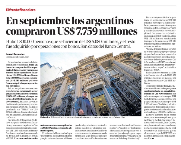 En septiembre los argentinos compraron US$ 7.759 millones Ismael Bermudez En septiembre, en medio de la incertidumbre electoral, hubo un boom de compras de dólares por parte de las personas y empresas a través de las operaciones financieras: US$ 7.759 millones. De ese total 1.800.000 personas compraron US$ 5.080 millones y el resto fueron adquiridos por operaciones con bonos. Así, en los primeros nueve meses del año, las compras del sector privado no financiero sumaron US$ 30.415 millones, el mayor valor desde 2020 (formación de activos externo). En tanto, las ventas de dólares de particulares y empresas sumaron US$ 6.451 millones quedando un “déficit” de US$ 23.964 millones, de acuerdo a las cifras del Balance Cambiario del Banco Central. Buena parte de la compra de dólares no quedó en el sistema financiero por cuanto en septiembre “los depósitos del sector privado crecieron US$ 1.540 millones en el mes y finalizaron septiembre con un saldo de US$ 33.846 millones”, según el BCRA. Y las reservas internacionales aumentaron en septiembre en US$ 387 millones respecto a fines de agosto. El informe del banco aclaró que “que parte de los fondos adquiridos y registrados en la cuenta billetes quedan depositados en cuentas locales o pueden ser utilizados posteriormente para la cancelación de consumos con tarjetas en moneda extranjera y no necesariamente constituir formación de activos externos como destino final de estos fondos” o “pueden ser destinados a la cancelación de pasivos con el exterior (por ejemplo, para pago de deuda comercial y financiera externa o utilidades y dividendos)". Por otro lado, también fue importante en septiembre que US$ 952 millones fueron por la salida de dólares por consumos de bienes y servicios pagados con tarjetas, viajes y pasajes (excluyendo servicios digitales). Los gastos con tarjetas insumieron US$ 678 millones, otros US$ 168 millones a servicios de transporte de pasajeros y US$ 106 millones a giros al exterior de operadores turísticos. “Dentro de los gastos por tarjetas se estima que los pagos por bienes despachados mediante servicios postales ascienden a US$ 102 millones (valor de las importaciones CIF informadas por INDEC para el mes), los cuales no estarían directamente asociados a viajes”, aclaró el informe del BCRA. En los primeros 9 meses, la salida total de este rubro fue de U$S 9.952 millones mientras los ingresos por igual concepto sumó US$ 2.395 millones. Todos estos déficits de divisas pudieron ser financiados porque en septiembre hubo un superávit comercial de US$ 7.003 millones por cobros de exportaciones por US$ 12.853 millones, compensados por pagos de importaciones por US$ 5.850 millones. También por los ingresos netos de los préstamos de organismos internacionales y financieros locales por US$ 1.394 millones. El fuerte aumento de los cobros de exportaciones se explica en gran parte por la medida que tomó el ministro de Economía, Luis Caputo, de aplicar retenciones cero a las exportaciones de granos hasta el 31 de octubre de 2025 o hasta que se alcanzara el cupo de US$ 7.000 millones, lo que sucedió en apenas pocos días. Menciones: Ceco1 cfinanE