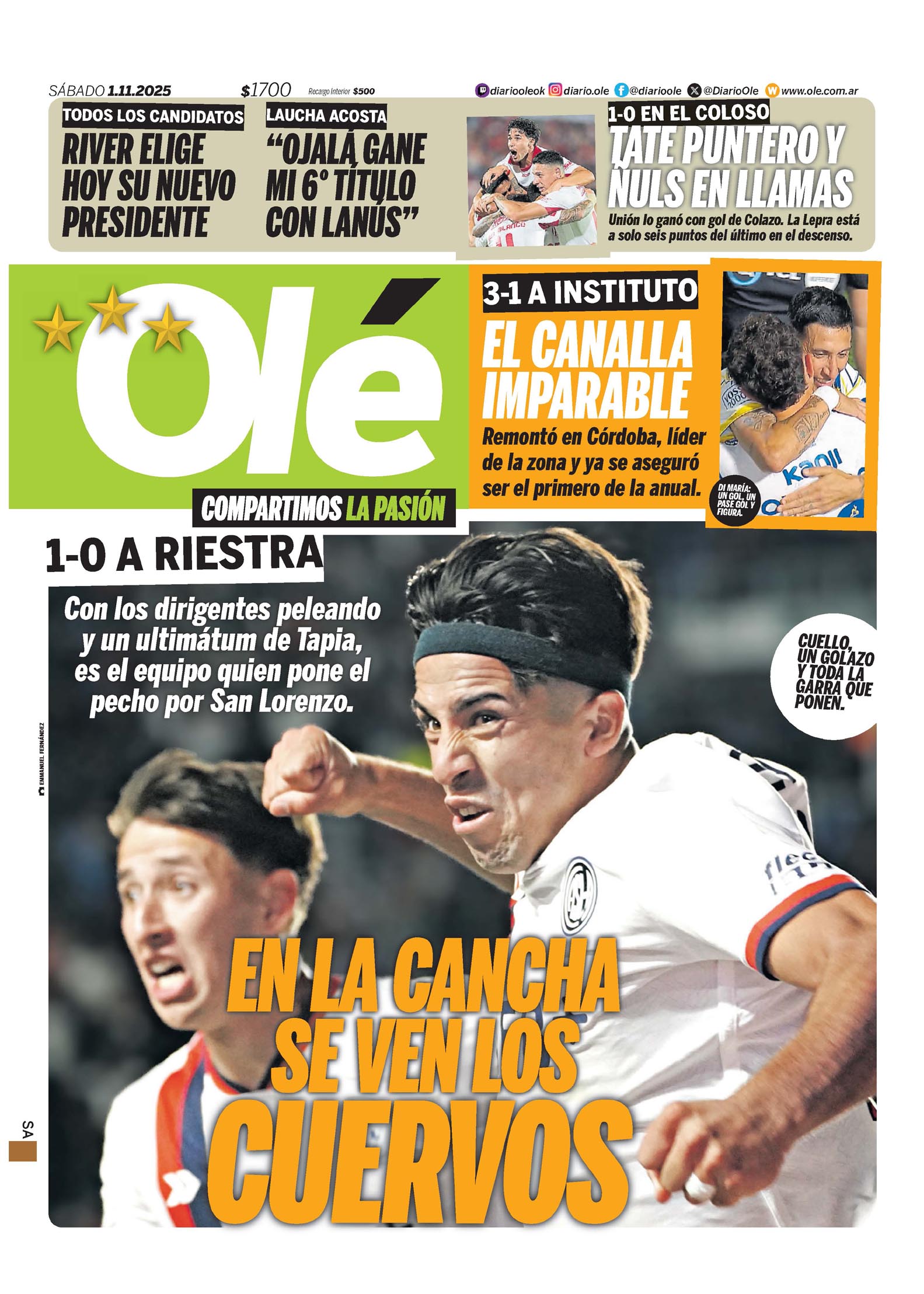 Olé tapa TODOS LOS CANDIDATOS RIVER ELIGE HOY SU NUEVO PRESIDENTE LAUCHA ACOSTA "OJALÁ GANE MI 6° TÍTULO CON LANÚS" 1-0 EN EL COLOSO TATE PUNTERO Y ÑULS EN LLAMAS Unión lo ganó con gol de Colazo. La Lepra está a solo seis puntos del último en el descenso 3-1 A INSTITUTO EL CANALLA IMPARABLE Remontó en Córdoba, líder de la zona y ya se aseguró ser el primero de la anual DI MARÍA: UN GOL, UN PASE GOL Y FIGURA. 1-0 A RIESTRA Con los dirigentes peleando y un ultimátum de Tapia, es el equipo quien pone el pecho por San Lorenzo EN LA CANCHA SE VEN LOS CUERVOS CUELLO, UN GOLAZO Y TODA LA GARRA QUE PONEN.
