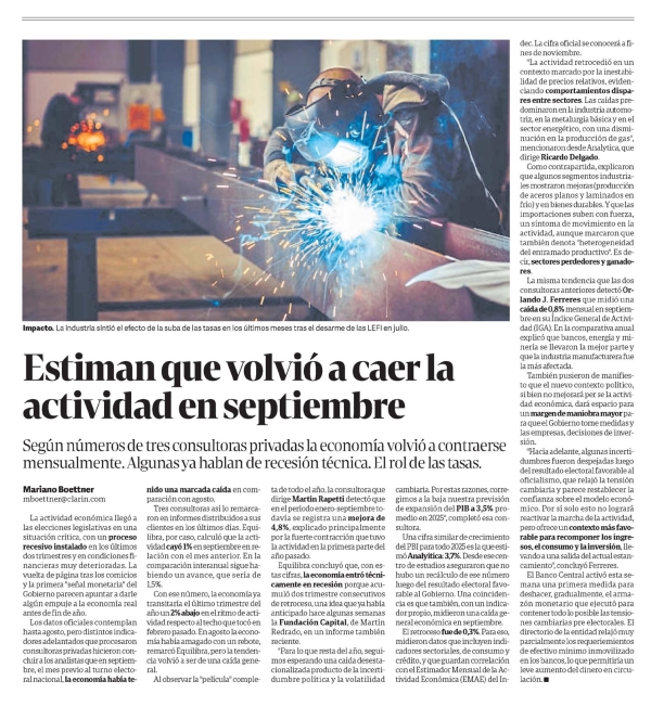 Estiman que volvió a caer la actividad en septiembre Mariano Boettner Impacto. La industria sintió el efecto de la suba de las tasas en los últimos meses tras el desarme de las LEFI en julio. Estiman que volvió a caer la actividad en septiembre Según números de tres consultoras privadas la economía volvió a contraerse mensualmente. Algunas ya hablan de recesión técnica. El rol de las tasas. Mariano Boettner mboettner@clarin.com La actividad económica llegó a las elecciones legislativas en una situación crítica, con un proceso recesivo instalado en los últimos dos trimestres y en condiciones financieras muy deterioradas. La vuelta de página tras los comicios y la primera "señal monetaria" del Gobierno parecen apuntar a darle algún empuje a la economía real antes de fin de año. Los datos oficiales contemplan hasta agosto, pero distintos indicadores adelantados que procesaron consultoras privadas hicieron concluir a los analistas que en septiembre, el mes previo al turno electoral nacional, la economía había tenido una marcada caída en comparación con agosto. Tres consultoras así lo remarcaron en informes distribuidos a sus clientes en los últimos días. Equilibra, por caso, calculó que la actividad cayó 1% en septiembre en relación con el mes anterior. En la comparación interanual sigue habiendo un avance, que sería de 1,5%. Con ese número, la economía transitaría el último trimestre del año un 2% abajo en el ritmo de actividad respecto al techo que tocó en febrero pasado. En agosto la economía había amagado con un rebote, remarcó Equilibra, pero la tendencia volvió a ser de una caída general. Al observar la "película" completa de todo el año, la consultora que dirige Martín Rapetti detectó que en el período enero-septiembre todavía se registra una mejora de 4,8%, explicado principalmente por la fuerte contracción que tuvo la actividad en la primera parte del año pasado. Equilibra concluyó que, con estas cifras, la economía entró técnicamente en recesión porque acumuló dos trimestres consecutivos de retroceso, una idea que ya había anticipado hace algunas semanas la Fundación Capital, de Martín Redrado, en un informe también reciente. "Para lo que resta del año, seguimos esperando una caída desestacionalizada producto de la incertidumbre política y la volatilidad cambiaria. Por estas razones, corregimos a la baja nuestra previsión de expansión del PIB a 3,5% promedio en 2025", completó esa consultora. Una cifra similar de crecimiento del PBI para todo 2025 es la que estimó Analyitica: 3,7%. Desde ese centro de estudios aseguraron que no hubo un recálculo de ese número luego del resultado electoral favorable al Gobierno. Una coincidencia es que también, con un indicador propio, midieron una caída general económica en septiembre. El retroceso fue de 0,3%. Para eso, midieron datos que incluyen indicadores sectoriales, de consumo y crédito, y que guardan correlación con el Estimador Mensual de la Actividad Económica (EMAE) del Índice. La cifra oficial se conocerá a fines de noviembre. "La actividad retrocedió en un contexto marcado por la inestabilidad de precios relativos, evidenciando comportamientos dispares entre sectores. Las caídas predominaron en la industria automotriz, en la metalurgia básica y en el sector energético, con una disminución en la producción de gas", mencionaron desde Analytica, que dirige Ricardo Delgado. Como contrapartida, explicaron que algunos segmentos industriales mostraron mejoras (producción de aceros planos y laminados de frío) y en bienes durables. Y que las importaciones suben con fuerza, un síntoma de movimiento en la actividad, aunque marcaron que también denota "heterogeneidad del entramado productivo". Es decir, sectores perdedores y ganadores. La misma tendencia que las dos consultoras anteriores detectó Orlando J. Ferreres que midió una caída de 0,8% mensual en septiembre en su Índice General de Actividad (IGA). En la comparativa anual explicó que bancos, energía y minería se llevaron la mejor parte y que la industria manufacturera fue la más afectada. También pusieron de manifiesto que el nuevo contexto político, si bien no mejorará per se la actividad económica, dará espacio para un margen de maniobra mayor para que el Gobierno tome medidas y las empresas, decisiones de inversión. "Hacia adelante, algunas incertidumbres fueron despejadas luego del resultado electoral favorable al oficialismo, que relajó la tensión cambiaria y parece restablecer la confianza sobre el modelo económico. Por sí solo esto no logrará reactivar la marcha de la actividad, pero ofrece un contexto más favorable para recomponer los ingresos, el consumo y la inversión, llevando a una salida del actual estancamiento", concluyó Ferreres. El Banco Central activó esta semana una primera medida para deshacer, gradualmente, el armazón monetario que ejecutó para contener todo lo posible las tensiones cambiarias pre electorales. El directorio de la entidad relajó muy parcialmente los requerimientos de efectivo mínimo inmovilizado en los bancos, lo que permitiría un leve aumento del dinero en circulación. Menciones: Ceco1 cfinanE EJESAPP 64pe