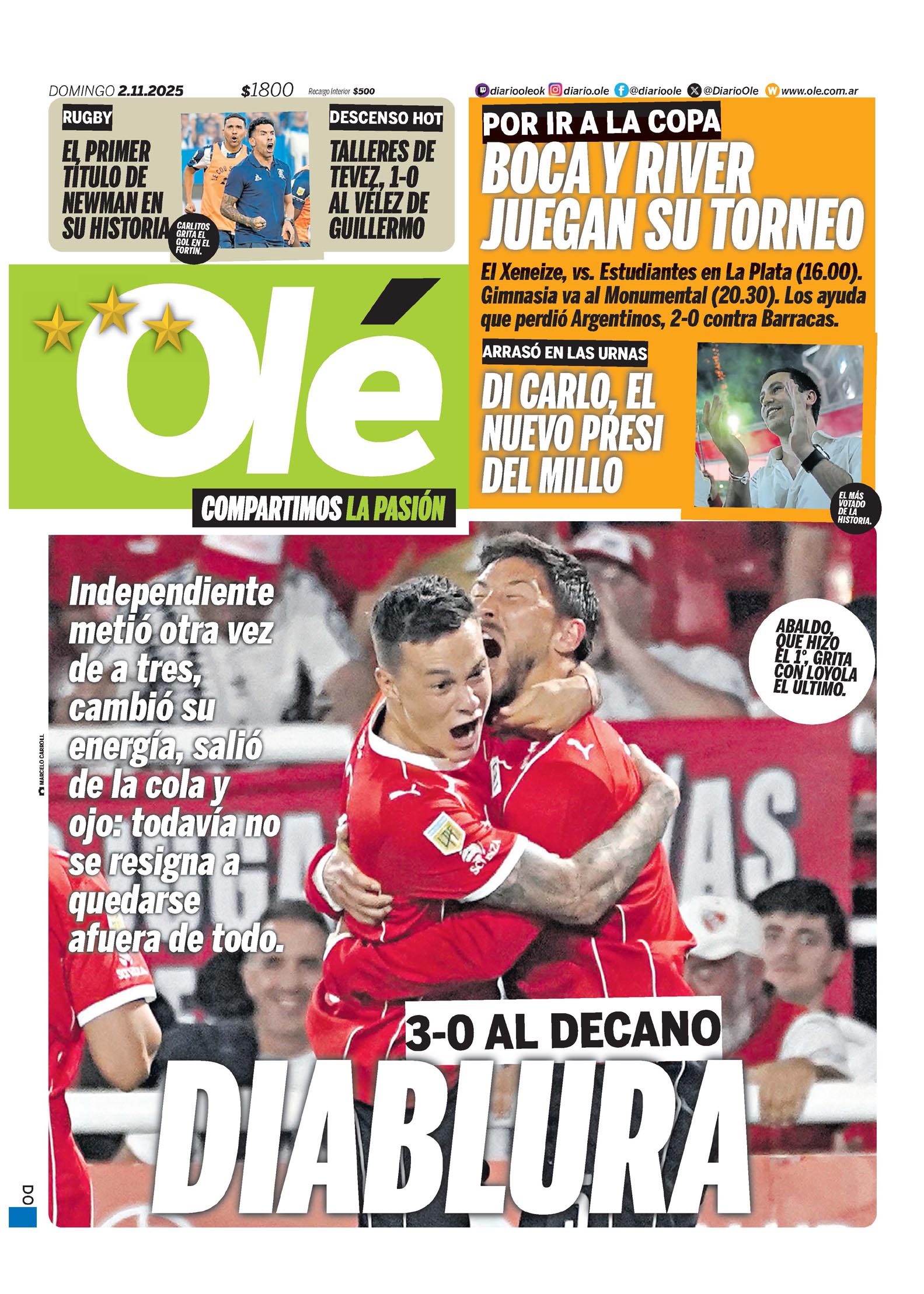 Olé Tapa 3-0 AL DECANO DIABLURA Independiente metió otra vez de a tres, cambió su energía, salió de la cola y ojo: todavía no se resigna a quedarse afuera de todo. ABALDO, QUE HIZO EL 1°, GRITA CON LOYOLA EL ÚLTIMO. POR IR A LA COPA BOCA Y RIVER JUEGAN SU TORNEO El Xeneize, vs. Estudiantes en La Plata (16.00). Gimnasia va al Monumental (20.30). Los ayuda que perdió Argentinos, 2-0 contra Barracas. ARRASÓ EN LAS URNAS DI CARLO, EL NUEVO PRESI DEL MILLO RUGBY EL PRIMER TÍTULO DE NEWMAN EN SU HISTORIA CARLITOS GRITA EL GOL EN EL FORTÍN. DESCENSO HOT TALLERES DE TEVEZ, 1-0 AL VÉLEZ DE GUILLERMO