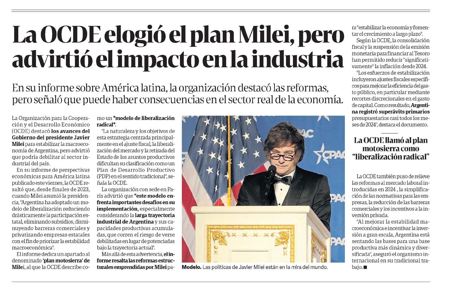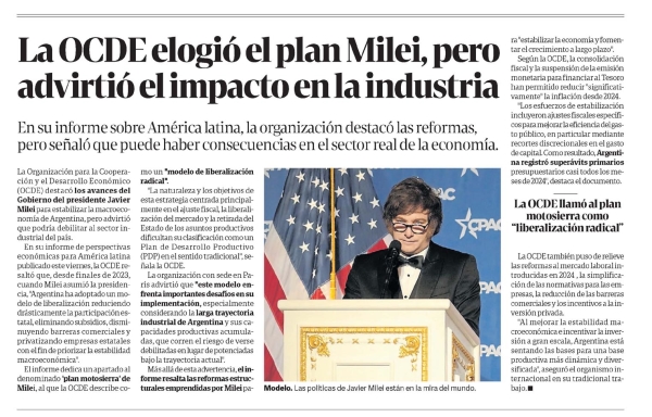La OCDE elogió el plan Milei, pero advirtió el impacto en la industria En su informe sobre América latina, la organización destacó las reformas, pero señaló que puede haber consecuencias en el sector real de la economía. La Organización para la Cooperación y el Desarrollo Económico (OCDE) destacó los avances del Gobierno del presidente Javier Milei para estabilizar la macroeconomía de Argentina, pero advirtió que podría debilitar al sector industrial del país. En su informe de perspectivas económicas para América latina publicado este viernes, la OCDE resaltó que, desde finales de 2023, cuando Milei asumió la presidencia, "Argentina ha adoptado un modelo de liberalización reduciendo drásticamente la participación estatal, eliminando subsidios, disminuyendo barreras comerciales y privatizando empresas estatales con el fin de priorizar la estabilidad macroeconómica". El informe dedica un apartado denominado "plan motosierra" de Milei, al que la OCDE describe como un "modelo de liberalización radical". "La naturaleza y los objetivos de esta estrategia centrada principalmente en el ajuste fiscal, la liberalización del mercado y la retirada del Estado de los asuntos productivos dificultan su clasificación como un Plan de Desarrollo Productivo (PDP) en el sentido tradicional", señala la OCDE. La organización con sede en París advirtió que "este modelo enfrenta importantes desafíos en su implementación, especialmente considerando la larga trayectoria industrial de Argentina y sus capacidades productivas acumuladas, que corren el riesgo de verse debilitadas en lugar de potenciadas bajo la trayectoria actual". Más allá de esta advertencia, el informe resalta las reformas estructurales emprendidas por Milei para "estabilizar la economía y fomentar el crecimiento a largo plazo". Según la OCDE, la consolidación fiscal y la suspensión de la emisión monetaria para financiar al Tesoro han permitido reducir "significativamente" la inflación desde 2024. "Los esfuerzos de estabilización incluyeron ajustes fiscales específicos para mejorar la eficiencia del gasto público, en particular mediante recortes discrecionales en el gasto de capital. Como resultado, Argentina registró superávits primarios presupuestarios casi todos los meses de 2024", destaca el documento. La OCDE llamó al plan motosierra como "liberalización radical”. La OCDE también puso de relieve las reformas al mercado laboral introducidas en 2024, la simplificación de las normativas para las empresas, la reducción de las barreras comerciales y los incentivos a la inversión privada. "Al mejorar la estabilidad macroeconómica e incentivar la inversión a gran escala, Argentina está sentando las bases para una base productiva más dinámica y diversificada", aseguró el organismo internacional en su tradicional trabajo. Menciones: Ceco1 cfinanE