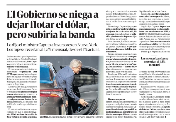 El Gobierno se niega a dejar flotar el dólar, pero subiría la banda El Gobierno se niega a dejar flotar el dólar, pero subiría la banda Lo dijo el ministro Caputo a inversores en Nueva York. Los topes crecerían al 1,5% mensual, desde el 1% actual. En el marco de la gira del presidente Javier Milei a Estados Unidos, el ministro de Economía, Luis Caputo, aprovechó para sumar más reuniones con inversores. El viernes pasado participó de un encuentro organizado por JP "Morgan, ex empleador de gran parte del equipo económico y uno de los bancos que está participando de la ayuda del Tesoro norteamericana a la Argentina. En esa charla, de la que formaron parte cerca de 40 inversores, Caputo confirmó que planea recomprar bonos soberanos y comenzar a acumular reservas incluso mientras el peso opere dentro de su banda cambiaria, de acuerdo a lo publicado por la agencia Bloomberg. El ministro dijo durante su presentación que el presidente Javier Milei no tiene intención de dejar flotar la moneda argentina, sino que la mantendrá operando dentro de bandas establecidas, según le dijeron a Bloomberg personas que pidieron no ser identificadas al hablar de un encuentro privado. Sin embargo, Caputo dijo que podría considerar acelerar el ritmo de ajuste de las bandas al 1,5% mensual, dependiendo de la inflación y la demanda de pesos, dijeron dos de las personas. Actualmente, los límites superior e inferior del rango operativo se ajustan 1% por mes, lo que permite que el peso se debilite gradualmente. Caputo espera presentar el plan completo -incluido un cronograma para la acumulación de reservas, la recompra de deuda y un bono de "deuda por educación" que ya fue anunciado- dentro de 30 días, dijo una de las personas, en referencia a sus comentarios. Desde que Milei salió victorioso en las elecciones de medio término hace dos semanas, muchos inversores han argumentado que este es el momento para que el presidente redefina su marco de política. De hecho, el fondo Pimco instó al Presidente a permitir que el peso flote libremente. El nuevo esquema Si bien los funcionarios argentinos negaron cualquier intención de cambiar el régimen cambiario, Caputo dio señales de que modificaría las reglas para permitir que el Gobierno compre dólares cuando el peso opera dentro de la banda y la liquidez del mercado es fuerte. Caputo no especificó cuándo comenzarían las compras de dólares, pero dijo que espera que la moneda siga apreciándose a medida que crezca la demanda de pesos. Según dijo Caputo, Argentina planea recomprar los bonos globales con vencimiento en 2029 y 2030 (GD 29 y GD30) utilizando una fuente de financiamiento más barata. Agregó que los funcionarios argentinos firmaron un acuerdo de confidencialidad con Estados Unidos que le prohíbe compartir cualquier detalle específico. Desde que Argentina firmó el acuerdo de US$ 20.000 millones con el Fondo Monetario Internacional en abril, el Banco Central tuvo dificultades para recomponer reservas internacionales según lo planeado. En cambio, se vio obligado a vender dólares para apuntalar al peso en medio de la volatilidad previa a las elecciones. Como el Banco Central no podía vender dólares dentro de la banda, fue el Tesoro quien lo hizo, hasta que sus fondos se acabaron y el Gobierno decidió recurrir a la ayuda de Estados Unidos, que intervino directamente sobre el mercado cambiario argentino, con la venta de unos US$ 2.000 millones. Las nuevas bandas se moverían al 1,5% mensual Cambios. Caputo dio algunas pistas sobre el nuevo esquema cambiario Menciones: Ceco1 cfinanE ejesapp