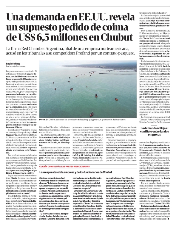 Una demanda en EE.UU. revela un supuesto pedido de coima de US$ 6,5 millones en Chubut Lucía Salinas La firma Red Chamber Argentina, filial de una empresa norteamericana, acusó en los tribunales a su competidora Profand por un contrato pesquero. Lucía Salinas Isalinas@clarin.com En pocas semanas ocurrió todo. El gobernador de Chubut, Ignacio Torres, rescindió el contrato con la firma pesquera Red Chamber, que opera en la provincia desde 2014. A finales de septiembre, se radicó una demanda en la justicia norteamericana por violación de aspectos contractuales, pero también por presuntos hechos de corrupción. Después de eso, se firmó un acuerdo con la compañía. Sumado a eso, la administración provincial envió dos permisos para ser analizados por la Legislatura, pero este lunes se retractó de esa decisión. El curioso zigzagueo del gobierno y el conflicto con Red Chamber tiene en vilo al sector pesquero de Chubut, mientras en los tribunales estadounidenses se menciona un supuesto pedido de coima por 6,5 millones de dólares. Red Chamber Argentina es una de las compañías que integran Red Chamber Co, un grupo fundado en California y que es uno de los líderes en la industria pesquera mundial. La compañía se especializa en el abastecimiento de productos de mar, y desde 2015 tiene su propia planta procesadora en la Patagonia. Los productos comercializados son capturados con embarcaciones que pertenecen a Red Chamber Argentina y están radicados en Chubut, desde que se hicieron cargo de la explotación que realizaba la firma Alpesca, expropiada por el gobierno de la provincia en 2014. Según explicaron fuentes del sector a Clarín, durante una década Red Chamber “tuvo un contrato para usufructuar los bienes de esa empresa con permisos de pesca, y el gobierno del gobernador Torres rescindió ese contrato por incumplimientos contractuales”. Desde la firma pesquera rechazaron la decisión, bajo el argumento de que reflejaba “inseguridad jurídica” en el desarrollo de sus negocios. “La decisión carece de sustento jurídico, no fue precedida por licitación ni procedimiento administrativo alguno y resulta contraria a las cláusulas vigentes”, manifestó el CEO Marcelo Mou, y detalló que Red Chamber había invertido más de 70 millones de dólares en una década. La situación escaló a tal nivel que Mou elevó un dossier a la Embajada de Estados Unidos y al Departamento de Estado, en Washington. En el documento, Red Chamber sostiene que la rescisión del contrato “genera un grave mensaje disuasivo para la inversión extranjera”. Pese a ello, la provincia ratificó que había procedido según sus potestades normativas como dueña de los recursos y responsable de su correcta administración. De hecho, el 8 de septiembre la Secretaría de Pesca de Chubut, a cargo de Andrés Arbeletche, informó a Red Chamber que rechazaba los planteos con los que la firma se oponía a la decisión del gobierno. “Se les hace saber que deberán reintegrar todos los bienes de Alpesca S.A. y AP Holding S.A. a la Provincia del Chubut (Comité de Administración de Alpesca) en un plazo no mayor al 30 de septiembre de 2025, bajo apercibimiento de iniciar las acciones judiciales pertinentes”, sostiene la nota a la que accedió este medio. Bajo esos términos, la provincia requirió que se efectúe a la “máxima brevedad un inventario de bienes muebles pertenecientes a Red Chamber Argentina que se encuentren dentro de la planta de Alpesca, el cual será cotejado por el Comité de Administración de Alpesca a los fines de garantizar su re-tiro por parte de Red Chamber”. La firma desalojada presentó el caso ante las autoridades de la embajada y anticipó acciones administrativas y judiciales para revertir la decisión del gobernador Torres. Pero la historia no terminó ahí. El 30 de septiembre, y en 34 páginas de un documento al que accedió Clarín, Red Chamber accionó civilmente contra la multinacional pesquera Profand, a la que la administración de Ignacio Torres le adjudicó los bienes y derechos de la ex Alpesca, y en el texto se hace referencia al gobierno de Chubut y presuntos hechos de corrupción. En la demanda dice lo siguiente: "Aproximadamente a las 2 de la tarde del 3 de abril de 2025, Andrés Meiszner, el ministro de Economía y Fiscal de Estado del Gobierno de Chubut, se encontró con Marcelo Mou, presidente de Red Chamber Argentina, para discutir los términos de la finalización del contrato. La reunión sucedió en el Alvear Art Hotel de Buenos Aires. Durante la reunión, el señor Meizner le aconsejó a Mou que Red Chamber pague US$6.5 millones en dinero negro si quería seguir operando con los recursos de la expropiada Alpesca y luego adquirirlos tras la culminación del proceso judicial de expropiación. Meizner aconsejó un adelanto de 3 millones de pesos seguido por un segundo pago de $11 millones". La demanda se presentó ante el Tribunal Federal de Distrito para el Distrito Central de California, con sede en Los Ángeles, y en ella se habla de un presunto pedido de coimas por parte del ex ministro de Economía de Chubut, Andrés Meiszner, para revertir el proceso de rescisión de contrato. El texto judicializado y presentado en función de los términos de la Ley de Prácticas Corruptas en el Extranjero (FCPA), se refiere a los supuestos delitos de extorsión, conspiración criminal y soborno internacional. El concurso de estos delitos para la ley estadounidense, representan una pena de hasta veinte años de prisión. Entre la prueba citada, se mencionan correos electrónicos y comunicaciones internas. Ante la trascendencia de las acusaciones, el gobierno de Chubut desmintió cualquier comportamiento ilícito vinculado a la denuncia presentada por el estudio norteamericano Tucker Ellis LLP. En la demanda dice que el pedido de sobornos como el mencionado es“es contrario a lo aceptable según las leyes estadounidenses de ética e integridad”, pero admite