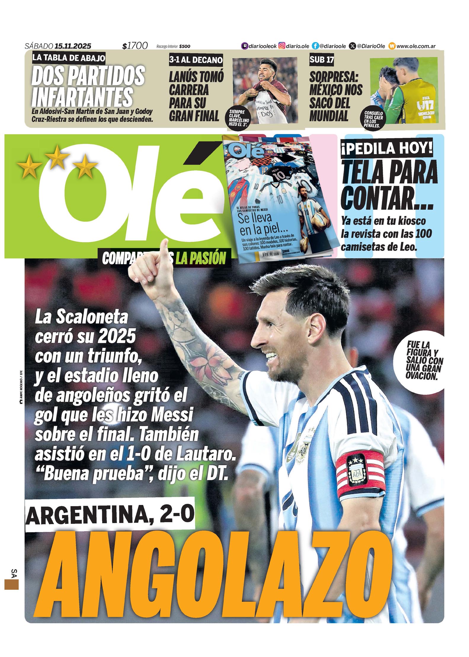 Olé tapa LA TABLA DE ABAJO DOS PARTIDOS INFARTANTES En Aldosivi-San Martín de San Juan y Godoy Cruz-Riestra se definen los que descienden. 3-1 AL DECANO LANÚS TOMÓ CARRERA PARA SU GRAN FINAL SIEMPRE CLAVE, MARCELINO HIZO EL 3°. SUB 17 SORPRESA: MÉXICO NOS SACÓ DEL MUNDIAL CONSUELO TRAS CAER EN LOS PENALES ARGENTINA, 2-0 ANGOLAZO La Scaloneta cerró su 2025 con un triunfo, y el estadio lleno de angoleños gritó el gol que les hizo Messi sobre el final. También asistió en el 1-0 de Lautaro. "Buena prueba", dijo el DT. FUE LA FIGURA Y SALIÓ CON UNA GRAN OVACIÓN.