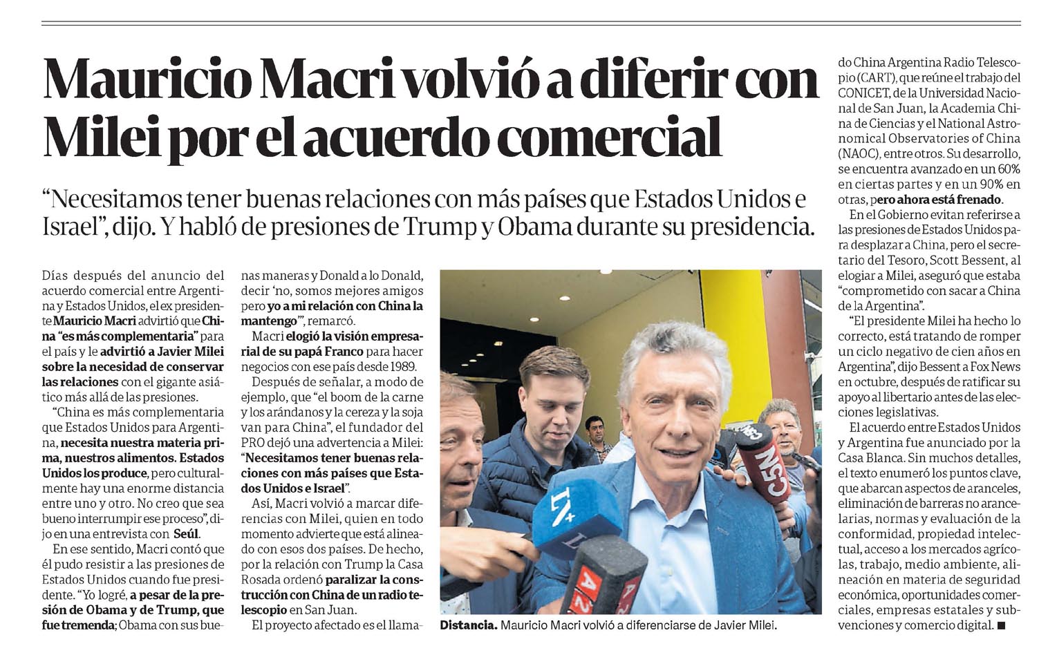 Mauricio Macri volvió a diferir con Milei por el acuerdo comercial “Necesitamos tener buenas relaciones con más países que Estados Unidos e Israel”, dijo. Y habló de presiones de Trump y Obama durante su presidencia. Días después del anuncio del acuerdo comercial entre Argentina y Estados Unidos, el ex presidente Mauricio Macri advirtió que China “es más complementaria” para el país y le advirtió a Javier Milei sobre la necesidad de conservar las relaciones con el gigante asiático más allá de las presiones. “China es más complementaria que Estados Unidos para Argentina, necesita nuestra materia prima, nuestros alimentos. Estados Unidos los produce, pero culturalmente hay una enorme distancia entre uno y otro. No creo que sea bueno interrumpir ese proceso”, dijo en una entrevista con Seúl. En ese sentido, Macri contó que él pudo resistir a las presiones de Estados Unidos cuando fue presidente. “Yo logré, a pesar de la presión de Obama y de Trump, que fue tremenda; Obama con sus buenas maneras y Donald a lo Donald, decir “no, somos mejores amigos pero yo amo mi relación con China la mantengo””, remarcó. Macri elogió la visión empresarial de su papá Franco para hacer negocios con ese país desde 1989. Después de señalar, a modo de ejemplo, que “el boom de la carne, los arándanos y la cereza y la soja van para China”, el fundador del PRO dejó una advertencia a Milei: “Necesitamos tener buenas relaciones con más países que Estados Unidos e Israel”. Así, Macri volvió a marcar diferencias con Milei, quien en todo momento advierte que está alineado con esos dos países. De hecho, por la relación con Trump la Casa Rosada ordenó paralizar la construcción con China de un radiotelescopio en San Juan. El proyecto afectado es el llamado China Argentina Radio Telescopio (CART), que reúne el trabajo del CONICET, de la Universidad Nacional de San Juan, la Academia China de Ciencias y el National Astronomical Observatories of China (NAOC), entre otros. Su desarrollo, se encuentra avanzado en un 60% en ciertas partes y en un 90% en otras, pero ahora está frenado. En el Gobierno evitan referirse a las presiones de Estados Unidos para desplazar a China, pero el secretario del Tesoro, Scott Bessent, al elogiar a Milei, aseguró que estaba “comprometido con sacar a China de la Argentina”. “El presidente Milei ha hecho lo correcto, está tratando de romper un ciclo negativo de cien años en Argentina”, dijo Bessent a Fox News en octubre, después de ratificar su apoyo al libertario antes de las elecciones legislativas. El acuerdo entre Estados Unidos y Argentina fue anunciado por la Casa Blanca. Sin muchos detalles, el texto enumeró los puntos clave, que abarcan aspectos de aranceles, eliminación de barreras no arancelarias, normas y evaluación de la conformidad, propiedad intelectual, acceso a los mercados agrícolas, trabajo, medio ambiente, alineación en materia de seguridad económica, oportunidades comerciales, empresas estatales y subvenciones y comercio digital. Menciones: CPOL1