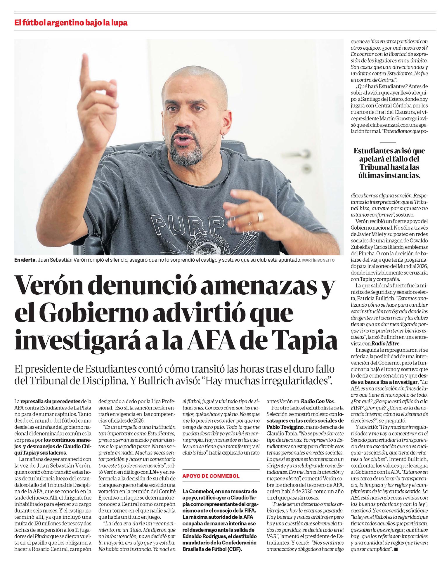 Verón denunció amenazas y el Gobierno advirtió que investigará a la AFA de Tapia MARTÍN BONETTO En alerta. Juan Sebastián Verón rompió el silencio, aseguró que no lo sorprendió el castigo y sostuvo que su club está apuntado. MARTÍN BONETTO El presidente de Estudiantes contó cómo transitó las horas tras el duro fallo del Tribunal de Disciplina. Y Bullrich avisó: "Hay muchas irregularidades". La represalia sin precedentes de la AFA contra Estudiantes de La Plata no para de sumar capítulos. Tanto desde el mundo del fútbol como desde las entrañas del gobierno nacional, el denominador común es la sorpresa por los continuos manejos y desmanejos de Claudio Chiqui Tapia y sus laderos. La mañana de ayer amaneció con la voz de Juan Sebastián Verón, quien contó cómo transitó estas horas de turbulencia luego del escandaloso fallo del Tribunal de Disciplina de la AFA, que se conoció en la tarde del jueves. Allí, el dirigente fue inhabilitado para ejercer su cargo durante seis meses. Y el castigo no terminó allí, ya que incluyó una multa de 120 millones de pesos y dos fechas de suspensión a los 11 jugadores del Pincha que se dieron vuelta en el pasillo que les obligaron a hacer a Rosario Central, campeón designado a dedo por la Liga Profesional. Esosí, la sanción recién entrará en vigencia en las competencias oficiales de 2026. "Es un atropello a una institució tan importante como Estudiantes, previo a ser amenazado y estar atentos a lo que podía pasar. No me sorprende en nada. Muchas veces sentar posición y hacer un comentario trae este tipo de consecuencias", soltó Verón en diálogo con LN+ y en referencia a la decisión de su club de blanquear que no había existido una votación en la reunión del Comité Ejecutivo en la que se determinó reconocer a Central como campeón de un torneo en el que nadie sabía que había un título en juego. "La idea era darle un reconocimiento, no un título. Me dijeron que no hubo votación, no se decidió por la mayoría, era algo que ya estaba. No había otra instancia. Yo nací en el fútbol, jugué y viví todo tipo de situaciones. Conozco cómo son los manejos, qué se hace y qué no. No es que lo pueden esconder porque ngo de otro palo. Todo lo que me pueden describir yo ya lo viví en carne propia. Hay momentos en los cuales uno se tiene que manifestar, y el club lo hizo", había explicado un rato antes Verón en Radio Con Vos. Por otro lado, el exfutbolista de la Selección se mostró molesto con los ataques en las redes sociales de Pablo Toviggino, mano derecha de Claudio Tapia. "No se puede dar este tipo de chicanas. Yo represento a Estudiantes y no estoy para dirimir esos temas personales en redes sociales. Lo que sí es grave es la amenaza a un dirigente y a un club grande como Estudiantes. Eso me llama la atención y me pone alerta", comentó Verón sobre los dichos del tesorero de AFA, quien habló de 2026 como un año en el que pasarán cosas. "Puede ser un descenso o malos arbitrajes, y hoy lo estamos pasando. Hay buenos y malos arbitrajes pero hay una cuestión que sobrevuela todos los partidos, se decide todo en el VAR", lamentó el presidente de Estudiantes. Y cerró: "Nos sentimos amenazados y obligados a hacer algo que no se hizo en otros partidos ni con otros equipos, ¿por qué nosotros sí? Es coartar con la libertad de expresión de los jugadores en su ámbito. Son cosas que van direccionadas y un ánimo contra Estudiantes. No fue en contra de Central". ¿Qué hará Estudiantes? Antes de subir al avión que ayer llevó al equipo a Santiago del Estero, donde hoy jugará con Central Córdoba por los cuartos de final del Clausura, el vicepresidente Martín Gorostegui avisó que el club avanzará con una apelación formal. "Entendíamos que po Estudiantes avisó que apelará el fallo del Tribunal hasta las últimas instancias. El día cabernos alguna sanción. Respe tamos la interpretación que el Tribunal hizo, aunque por supuesto no estamos conformes", sostuvo. Verón recibió un fuerte apoyo del Gobierno nacional. No sólo a través de Javier Milei y su posteo en redes sociales de una imagen de Osvaldo Zubeldía y Carlos Bilardo, emblemas del Pincha. O con la decisión de bajarse del viaje que tenía programado para ir al sorteo del Mundial 2026, donde inevitablemente se cruzaría con Tapia y compañía. La que salió más fuerte fue la ministra de Seguridad y senadora electa, Patricia Bullrich. "Estamos analizando cómo se hace para cambiar esta institución retrógrada donde los dirigentes se hacen ricos y los clubes tienen que andar mendigando porque si no no pueden tener bien las escuelas", lanzó Bullrich en una entrevista con Radio Mitre. Enseguida le repreguntaron si se refería a la posibilidad de una intervención del Gobierno, pero la funcionaria bajó el tono y sostuvo que lo decía como senadora y que des de su banca iba a investigar. "La AFA es una asociación sin fines de lucro que tiene el monopolio de todo. ¿Por qué? ¿Porque está afiliada a la FIFA? ¿Por qué? ¿Cómo es la democracia interna, cómo es el sistema de elecciones?", se preguntó. Y advirtió: "Hay muchas irregula ridades y me voy a concentrar en el Senado para estudiar la transparen cia de una asociación que no es cualquier asociación, que tiene de rehenes a los clubes". Intentó Bullrich, confrontar los valores que le asigna el Gobierno con la AFA. "Estamos en una tarea de valorar la transparen cia, la limpieza y las reglas y el cum plimiento de la ley en todo sentido. La AFA está haciendo cosas reñidas con las buenas prácticas y con la ley", cuestionó. Y en ese sentido, señaló que "la ley en el fútbol es la seguridad que tienen todos aquellos que participan, que saben lo que se juegan, qué títulos hay, que los referís son imparciales y una cantidad de reglas que tienen que ser cumplidas". Menciones: CPOL1 EJESAPP