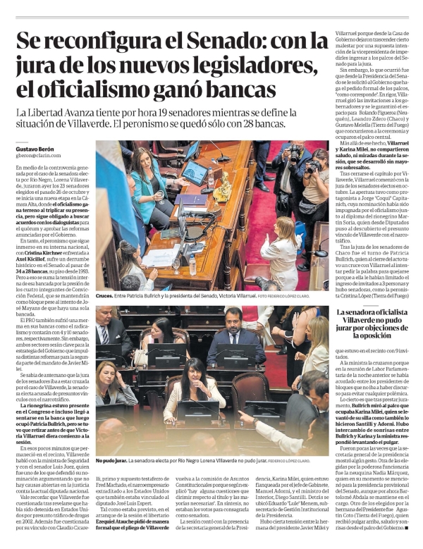 Se reconfigura el Senado: con la jura de los nuevos legisladores, el oficialismo ganó bancas Gustavo Berón La Libertad Avanza tiente por hora 19 senadores mientras se define la situación de Villaverde. El peronismo se quedó sólo con 28 bancas. Gustavo Berón gberon@clarin.com En medio de la controversia generada por el caso de la senadora electa por Río Negro, Lorena Villaverde, juraron ayer los 23 senadores elegidos el pasado 26 de octubre y se inicia una nueva etapa en la Cámara Alta, donde el oficialismo gana terreno al triplicar su presencia, pero sigue obligado a buscar acuerdos con los dialoguistas para el quórum y aprobar las reformas anunciadas por el Gobierno. En tanto, el peronismo, que sigue inmerso en su interna nacional, con Cristina Kirchner enfrentada a Axel Kicillof, sufre un derrumbe histórico en el Senado al pasar de 34 a 28 bancas, su piso desde 1993. Pero a eso se suma la tensión interna de esa bancada por la presión de los cuatro integrantes de Convicción Federal, que se mantendrán como bloque pese al intento de José Mayans de que haya una sola bancada. El PRO también sufrió una merma en sus bancas como el radicalismo y contarán con 4 y 10 senadores, respectivamente. Sin embargo, ambos sectores serán clave para la estrategia del Gobierno que impulsa distintas reformas para la segunda parte del mandato de Javier Milei. Se sabía de antemano que la jura de los senadores iba a estar cruzada por el caso de Villaverde, la senadora electa acusada de presuntos vínculos con el narcotráfico. La rionegrina estuvo presente en el Congreso e incluso llegó a sentarse en la banca que luego ocupó Patricia Bullrich, pero se tuvo que retirar antes de que Victoria Villarruel diera comienzo a la sesión. En esos pocos minutos que permaneció en el recinto, Villaverde habló con la ministra de Seguridad y con el senador Luis Juez, quien fue uno de los que defendió su nominación argumentando que no hay causas abiertas en la justicia contra la actual diputada nacional. Vale recordar que Villaverde fue cuestionada tras revelarse que había sido detenida en Estados Unidos por presunto tráfico de drogas en 2002. Además fue cuestionada por su vínculo con Claudio Cicarelli, primo y supuesto testaferro de Fred Machado, el narcoempresario extraditado a los Estados Unidos que también estaba vinculado al diputado José Luis Espert. Tal como estaba previsto, en el arranque de la sesión el libertario Ezequiel Atauche pidió de manera formal que el pliego de Villaverde vuelva a la comisión de Asuntos Constitucionales porque, según explicó, "hay alguna cuestiones que dirimir respecto al título y las mayorías necesarias". En síntesis, no estaban los votos para consagrarla como senadora. La sesión contó con la presencia de la secretaria general de la Presidencia, Karina Milei, quien estuvo flanqueada por el jefe de Gabinete, Manuel Adorni, y el ministro del Interior, Diego Santilli. Detrás se ubicó Eduardo "Lule" Menem, subsecretario de Gestión Institucional de la Presidencia. Hubo cierta tensión entre la hermana del presidente Javier Milei y La senadora oficialista Villaverde no pudo jurar por objeciones de la oposición No pudo jurar. La senadora electa por Río Negro Lorena Villaverde no pudo jurar. FEDERICO LÓPEZ CLARO. Villarruel porque desde la Casa de Gobierno dejaron trascender cierto malestar por una supuesta intención de la vicepresidenta de impedirles ingresar a los palcos del Senado para la jura. Sin embargo, lo que ocurrió fue que desde la Presidencia del Senado se le solicitó al Gobierno que haga el pedido formal de los palcos, "como corresponde". En rigor, Villarruel giró las invitaciones a los gobernadores y se le garantizó el espacio para Rolando Figueroa (Neuquén), Leandro Zdero (Chaco) y Gustavo Melella (Tierra del Fuego) que concurrieron a la ceremonia y ocuparon el palco central. Más allá de ese hecho, Villarruel y Karina Milei no compartieron saludo, ni miradas durante la sesión, que se desarrolló sin mayores sobresaltos. Tras cerrarse el capítulo por Villaverde, Villarruel comenzó con la jura de los senadores electos en octubre. La apertura tuvo como protagonista a Jorge "Coqui" Capitanich, cuya nominación había sido impugnada por el oficialismo junto al diploma del rionegrino Martín Soria, quien desde Diputados impulsó al descubierto el presunto vínculo de Villaverde con el narcotráfico. Tras la jura de los senadores de Chaco fue el turno de Patricia Bullrich, quien al cierre del acto tuvo un cruce con Villarruel al intentar pedir la palabra para quejarse porque a ella le habían limitado el ingreso de invitados a 3 personas y hubo senadoras, como la peronista Cristina López (Tierra del Fuego), que estuvo en el recinto con 9 invitados. A la ministra la cruzaron porque en la reunión de Labor Parlamentaria de la noche anterior se había acordado entre los presidentes de bloques que no iba a haber discurso para evitar cualquier polémica. Lo cierto es que tras prestar juramento, Bullrich miró al palco que ocupaba Karina Milei, quien se levantó de su silla como también lo hicieron Santilli y Adorni. Hubo intercambio de sonrisas entre Bullrich y Karina y la ministra respondió levantando el pulgar. Fueron pocas las veces que la secretaria general de la presidencia mostró algún gesto. Otra de las elegidas por la poderosa funcionaria fue la neuquina Nadia Márquez, quien en su momento se mencionó para la presidencia provisional del Senado, aunque por ahora Bartolomé Abdala se mantiene en el cargo. Otro de los elegidos por la hermana del Presidente fue Agustín Coto (Tierra del Fuego), quien recibió pulgar arriba, saludo y sonrisas desde el palco del Gobierno. Menciones: CPOL1 EJESAPP