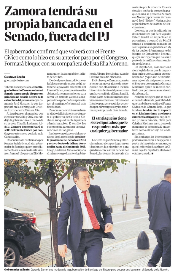 Zamora tendrá su propia bancada en el Senado, fuera del PJ Gustavo Berón El gobernador confirmó que volverá con el Frente Cívico como lo hizo en su anterior paso por el Congreso. Formará bloque con su compañera de lista Elia Moreno. Gustavo Berón gberon@clarin.com Tal como se especulaba, el santiagueño Gerardo Zamora volverá al Senado con su propio bloque y en principio no estaría dentro de la estructura del peronismo que comanda José Mayans, lo que impactará en la estrategia de Cristina Kirchner en la Cámara Alta. Al igual que en el mandato que ejerció entre 2013 y 2017, cuando dejó la gobernación en manos de su esposa Claudia Ledesma Abdala, Zamora desempolvará el sello del Frente Cívico por Santiago en este nuevo período en la Cámara Alta. De acuerdo a lo confirmado por fuentes legislativas, el aún gobernador de Santiago, quien prestó juramento en la sesión de este viernes, formará bloque con Elia Moreno, quien lo acompañó en la lista de octubre. Desde el peronismo, el formoseño Mayans confía en que podrá retener el apoyo del referente del Frente Cívico, aunque aún están abiertas las conversaciones para cerrar un acuerdo y, como la mayoría de los gobernadores peronistas, el santiagueño buscará más flexibilidad. Zamora se convirtió en un fuerte aliado del kirchnerismo durante el gobierno de Cristina Kirchner, aunque durante la primera administración K tendió los puentes para garantizar la convivencia en el Congreso. Incluso con el apoyo del peronismo llegó a ser elegido presidente provisional del Senado en 2014 y estuvo dentro de la línea de sucesión hasta diciembre de 2015. Luego, Ledesma Abdala ocuparía el mismo cargo durante el gobierno de Alberto Fernández, cuando Cristina presidió el Senado. Está claro que Zamora apuesta a tener un mayor ritmo de negociación con el Gobierno e incluso hizo ruido dentro del peronismo que haya recibido a Diego Santilli, como parte de las reuniones que viene manteniendo el ministro del Interior para conseguir los acuerdos por el Presupuesto y las reformas que impulsa la Casa Rosada. El santiagueño tiene siete diputados que le responden, más que cualquier gobernador Lo cierto es que Zamora y el kirchnerismo siempre jugaron en tándem en las elecciones para quedarse con las tres bancas del Senado, las dos por la mayoría y la restante por la minoría. En esta elección no fue la excepción porque en una se presentó Zamora con Moreno y por Fuerza Patria renovó José "Pichón" Neder, quien seguirá dentro de la órbita del kirchnerismo. Lo cierto es que la salida de los dos senadores por Santiago del Estero tendrá un impacto en el peronismo que pasó de 34 a 28 bancas. Y de darse la salida de los santiagueños se quedaría en 26, de los cuales 4 forman parte del bloque de Convicción Federal, que ya anticiparon que no serán parte de la unificación anunciada por Mayans. En Diputados, Zamora tiene siete legisladores que le responden -más que cualquier otro gobernador- y que aún se mantienen bajo el ala del peronismo en el bloque que comanda Germán Martínez, quien se mostró confiado que podrá contener al resto de la bancada. Aunque este giro que se dio en el Senado alienta la posibilidad de que también se reedite el Frente Cívico en la Cámara Baja, lo que también tendría cierto impacto en el kirchnerismo que busca contener las fugas para seguir como primera minoría, clave para Cristina Kirchner en su deseo de mantener la presencia K en ámbitos como el Consejo de la Magistratura. Sin embargo, los interrogantes podrían comenzar a despejarse a partir de la próxima semana, ya que el miércoles jurarán en la Cámara Baja los diputados electos en octubre pasado. (Epígrafe de la foto: Gobernador saliente. Gerardo Zamora se mudará de la gobernación de Santiago del Estero para ocupar una banca en el Senado de la Nación.) Menciones: cpol1