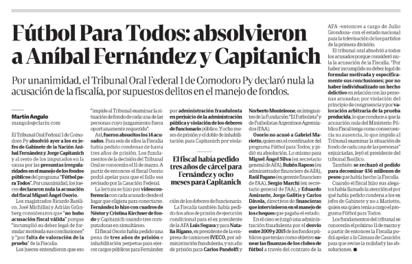 Fútbol Para Todos: absolvieron a Aníbal Fernández y Capitanich Martín Angulo Por unanimidad, el Tribunal Oral Federal 1 de Comodoro Py declaró nula la acusación de la fiscalía, por supuestos delitos en el manejo de fondos. Martín Angulo manguloclarin.com El Tribunal Oral Federal 1 de Comodoro Py absolvió ayer a los ex jefes de Gabinete de la Nación Aníbal Fernández y Jorge Capitanich y al resto de los imputados en la causa por las presuntas irregularidades en el manejo de los fondos públicos del programa "Fútbol para Todos". Por unanimidad, los jueces declararon nula la acusación del fiscal Miguel Ángel Osorio. Los magistrados Ricardo Basílico, José Michilini y Adrián Grúnberg consideraron que "no hubo acusación fiscal válida" porque "incumplió su deber legal de formular motivada sus conclusiones" y "por falta de valoración de la prueba" de la Fiscalía. Los jueces entendieron que eso "impide al Tribunal examinar la situación de fondo de cada una de las personas cuyo juzgamiento fuera oportunamente requerido". Así, fueron absueltos los 14 acusados. Para seis de ellos la Fiscalía había pedido condenas de hasta tres años de prisión. Los fundamentos de la decisión del Tribunal Oral se conocerán el 11 de marzo. A partir de entonces el fiscal Osorio podrá apelar para que el fallo sea revisado por la Casación Federal. La lectura se hizo por videoconferencia con cada acusado desde el lugar que eligiera para conectarse. Fernández lo hizo con cuadros de Néstor y Cristina Kirchner de fondo y Capitanich usando tres computadoras en simultáneo. El fiscal Osorio había pedido una pena de tres años de prisión e inhabilitación perpetua para ejercer cargos públicos para Fernández por administración fraudulenta en perjuicio de la administración pública y violación de los deberes de funcionario público. Y ocho meses de prisión y el doble de inhabilitación para Capitanich por viola- El fiscal había pedido tres años de cárcel para Fernández y ocho meses para Capitanich ción de los deberes de funcionario. La Fiscalía también había pedido dos años de prisión de ejecución condicional para el ex presidente de la AFA Luis Segura y para Natalia Rigano, ex presidente de la empresa de camiones IVECO, por administración fraudulenta, y un año de prisión para Carlos Pandolfi y Norberto Monteleone, ex integrantes de la Fundación "El Futbolista" y de Futbolistas Argentinos Agremiados (FAA). Osorio no acusó a Gabriel Mariotto, quien era el coordinador del programa Fútbol para Todos, y pidió su absolución. Lo mismo para Miguel Ángel Silva (ex secretario general de AFA), Rubén Raposo (ex administrador financiero de AFA), Raúl Pagano (ex gerente financiero de FAA), Sergio Marchi (ex secretario general de FAA), y Eduardo Amirante, Jorge Galitis y Carlos Dávola, directivos de financieras que intervinieron en el manejo de los cheques que pagaba el estado. En el caso se juzgó una administración fraudulenta por el desvío entre 2009 y 2015 de los fondos públicos que tenían como objetivo sanear las finanzas de los clubes de fútbol a través del contrato de la AFA -entonces a cargo de Julio Grondona- con el estado nacional para la televisación de los partidos de la primera división. El tribunal oral absolvió a todos los acusados porque consideró nula la acusación de la Fiscalía. "Por haber incumplido su deber legal de formular motivada y específicamente sus conclusiones; por no haber individualizado un hecho delictivo en relación con las personas acusadas; por violación del principio de congruencia y por valoración arbitraria de la prueba producida, lo que conduce a que la acusación nula del Ministerio Público Fiscal tenga como consecuencia su ausencia, lo que impide al Tribunal examinar la situación de fondo de cada una de las personas" enjuiciadas, leyó el presidente del tribunal Basílico. También se rechazó el pedido para decomisar 456 millones de pesos que había hecho la Fiscalía. Cuando el fiscal hizo sus alegatos había llamado la atención el por qué había pedido condena a los ex jefes de Gabinete y no a Mariotto, quien era quien tenía a cargo el programa Fútbol para Todos. Los fundamentos del tribunal se conocerán el próximo 11 de marzo y a partir de entonces la Fiscalía podrá apelar a la Cámara de Casación para que revise la nulidad y las absoluciones. Menciones: CPOL1