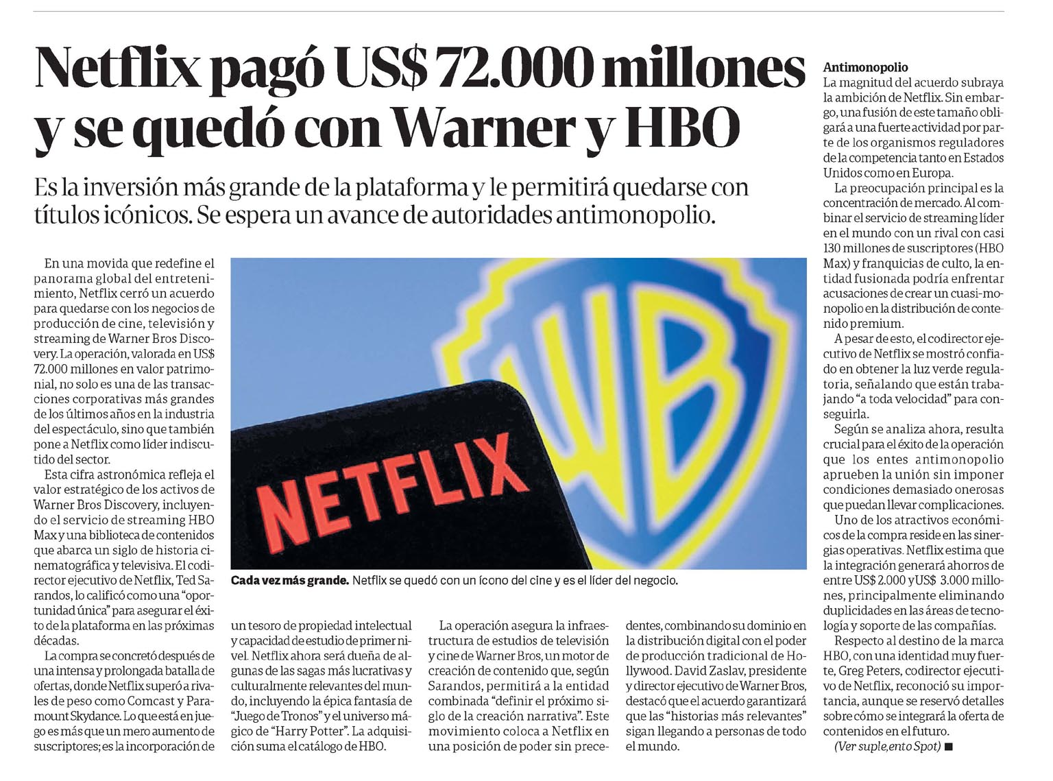 Netflix pagó US$ 72.000 millones y se quedó con Warner y HBO Es la inversión más grande de la plataforma y le permitirá quedarse con títulos icónicos. Se espera un avance de autoridades antimonopolio. En una movida que redefine el panorama global del entretenimiento, Netflix cerró un acuerdo para quedarse con los negocios de producción de cine, televisión y streaming de Warner Bros Discovery. La operación, valorada en US$ 72.000 millones en valor patrimonial, no solo es una de las transacciones corporativas más grandes de los últimos años en la industria del espectáculo, sino que también pone a Netflix como líder indiscutido del sector. Esta cifra astronómica refleja el valor estratégico de los activos de Warner Bros Discovery, incluyendo el servicio de streaming HBO Max y una biblioteca de contenidos que abarca un siglo de historia cinematográfica y televisiva. El codirector ejecutivo de Netflix, Ted Sarandos, lo calificó como una "oportunidad única" para asegurar el éxito de la plataforma en las próximas décadas. La compra se concretó después de una intensa y prolongada batalla de ofertas, donde Netflix superó a rivales de peso como Comcast y Paramount Skydance. Lo que está en juego es más que un mero aumento de suscriptores; es la incorporación de un tesoro de propiedad intelectual y capacidad de estudio de primer nivel. Netflix ahora será dueña de algunas de las sagas más lucrativas y culturalmente relevantes del mundo, incluyendo la épica fantasía de "Juego de Tronos" y el universo mágico de "Harry Potter". La adquisición suma el catálogo de HBO. La operación asegura la infraestructura de estudios de televisión y cine de Warner Bros, un motor de creación de contenido que, según Sarandos, permitirá a la entidad combinada "definir el próximo siglo de la creación narrativa". Este movimiento coloca a Netflix en una posición de poder sin precedentes, combinando su dominio de la distribución digital con el poder de producción tradicional de Hollywood. David Zaslav, presidente y director ejecutivo de Warner Bros, destacó que el acuerdo garantizará que las "historias más relevantes" sigan llegando a personas de todo el mundo. Cada vez más grande. Netflix se quedó con un ícono del cine y es el líder del negocio. Antimonopolio La magnitud del acuerdo subraya la ambición de Netflix. Sin embargo, una fusión de este tamaño obligará a una fuerte actividad por parte de los organismos reguladores de la competencia tanto en Estados Unidos como en Europa. La preocupación principal es la concentración de mercado. Al combinar el servicio de streaming líder en el mundo con un rival con casi 130 millones de suscriptores (HBO Max) y franquicias de culto, la entidad fusionada podría enfrentar acusaciones de crear un cuasi-monopolio en la distribución de contenido premium. A pesar de esto, el codirector ejecutivo de Netflix se mostró confiado en obtener la luz verde regulatoria, señalando que están trabajando "a toda velocidad" para conseguirla. Según se analiza ahora, resulta crucial para el éxito de la operación que los entes antimonopolio aprueben la unión sin imponer condiciones demasiado onerosas que puedan llevar complicaciones. Uno de los atractivos económicos de la compra reside en las sinergias operativas. Netflix estima que la integración generará ahorros de entre US$ 2.000 y US$ 3.000 millones, principalmente eliminando duplicidades en las áreas de tecnología y soporte de las compañías. Respecto al destino de la marca HBO, con una identidad muy fuerte, Greg Peters, codirector ejecutivo de Netflix, reconoció su importancia, aunque se reservó detalles sobre cómo se integrará la oferta de contenidos en el futuro. (Ver suple,ento Spot) Menciones: Ceco1 cfinanE 64ne