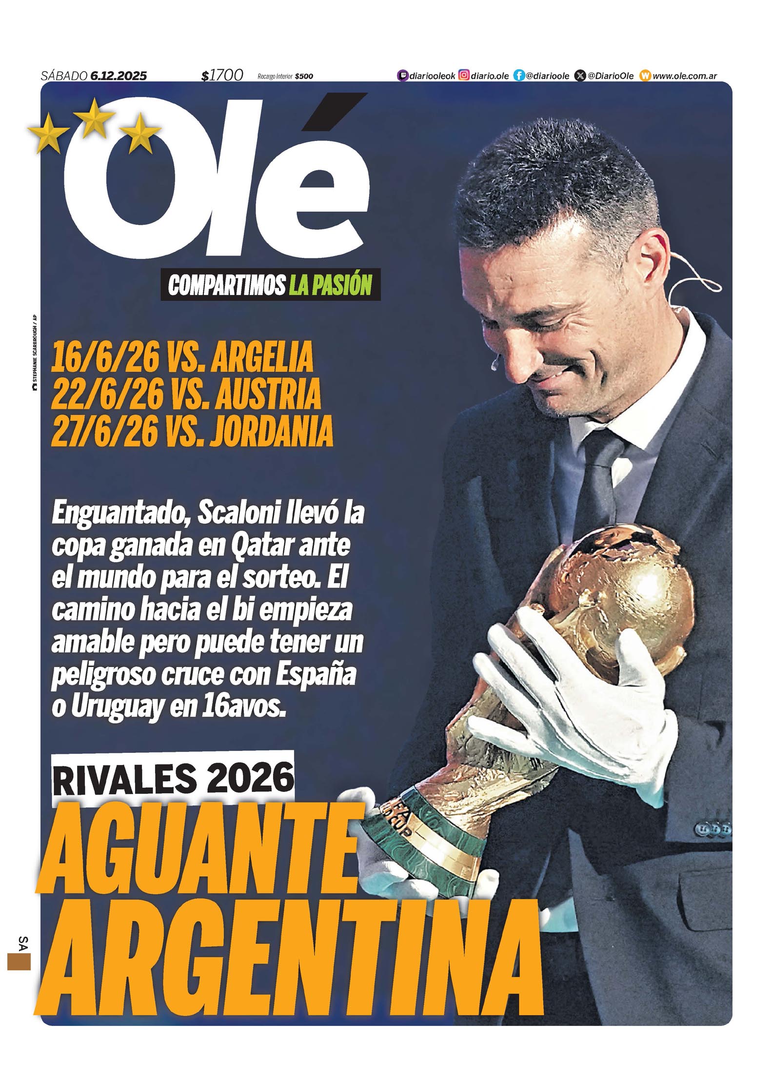 Olé Tapa RIVALES 2026 AGUANTE ARGENTINA Enguantado, Scaloni llevó la copa ganada en Qatar ante el mundo para el sorteo. El camino hacia el bi empieza amable pero puede tener un peligroso cruce con España o Uruguay en 16avos. 16/6/26 VS. ARGELIA 22/6/26 VS. AUSTRIA 27/6/26 VS. JORDANIA