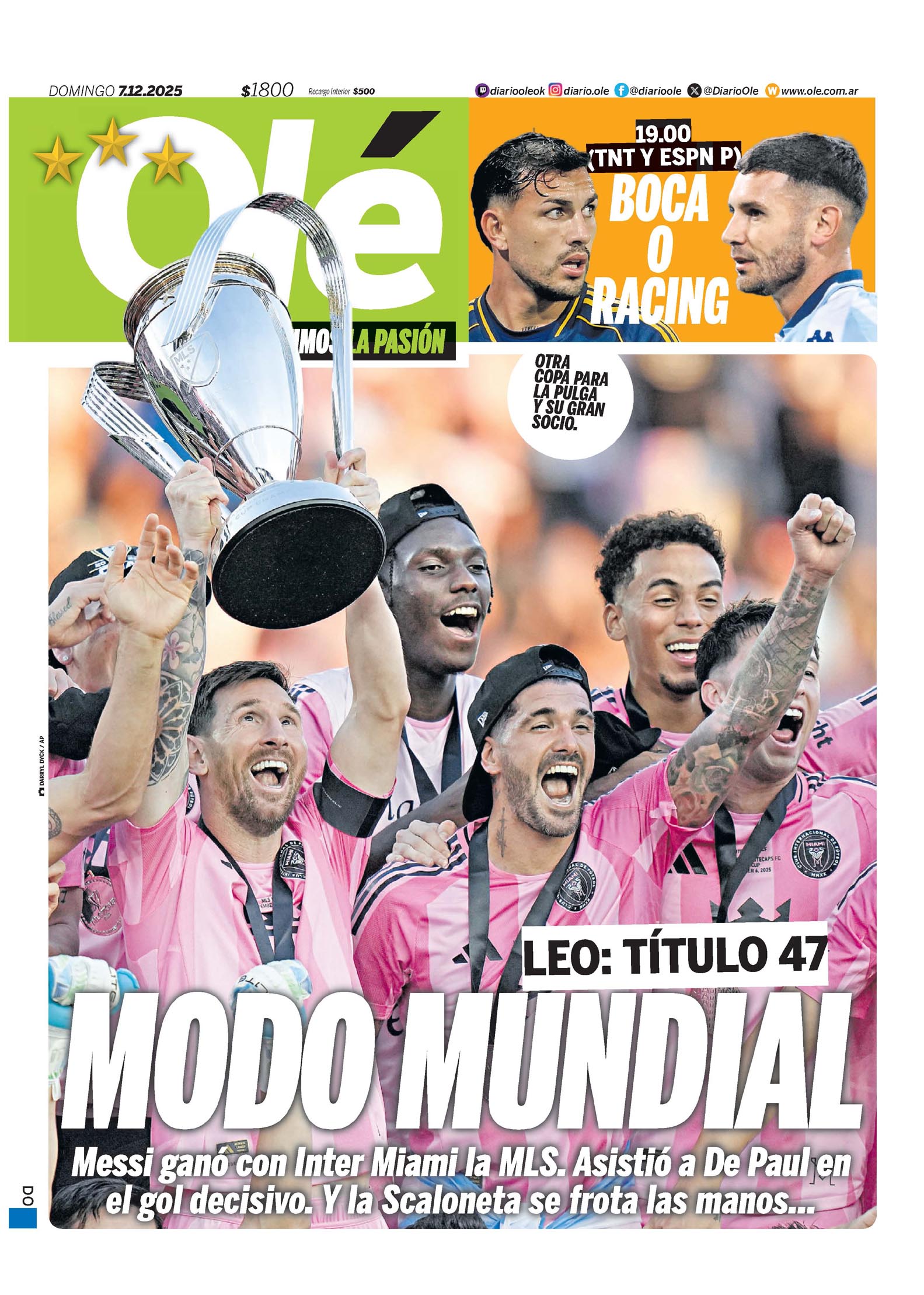 Olé Tapa LEO: TÍTULO 47 MODO MUNDIAL Messi ganó con Inter Miami la MLS. Asistió a De Paul en el gol decisivo. Y la Scaloneta se frota las manos... OTRA COPA PARA LA PULGA Y SU GRAN SOCIO. 19.00 (TNT Y ESPN) BOCA O RACING