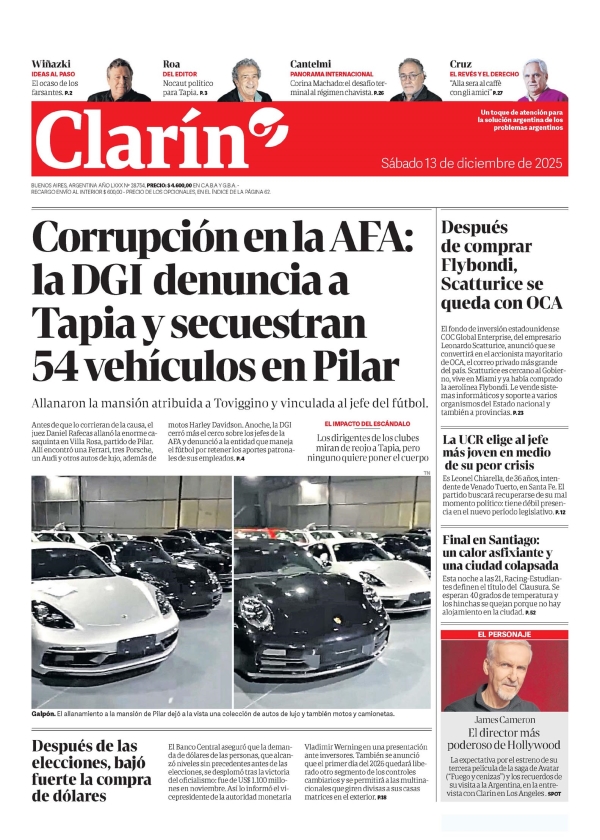 Clarín Tapa Corrupción en la AFA: la DGI denuncia a Tapia y secuestran 54 vehículos en Pilar Allanaron la mansión atribuida a Toviggino y vinculada al jefe del fútbol. Antes de que lo corrieran de la causa, el juez Daniel Rafecas allanó la enorme casaquinta en Villa Rosa, partido de Pilar. Allí encontró una Ferrari, tres Porsche, un Audi y otros autos de lujo, además de motos Harley Davidson. Anoche, la DGI cerró más el cerco sobre los jefes de la AFA y denunció a la entidad que maneja el fútbol por retener los aportes patronales de sus empleados. P. 4 EL IMPACTO DEL ESCÁNDALO Los dirigentes de los clubes miran de reojo a Tapia, pero ninguno quiere poner el cuerpo Después de las elecciones, bajó fuerte la compra de dólares El Banco Central aseguró que la demanda de dólares de las personas, que alcanzó niveles sin precedentes antes de las elecciones, se desplomó tras la victoria del oficialismo: fue de US$ 1.100 millones en noviembre. Así lo informó el vicepresidente de la autoridad monetaria Vladimir Werning en una presentación ante inversores. También se anunció que el primer día del 2026 quedará liberado otro segmento de los controles cambiarios y se permitirá a las multinacionales que giren divisas a sus casas matrices en el exterior. P.18 Después de comprar Flybondi, Scatturice se queda con OCA El fondo de inversión estadounidense COC Global Enterprise, del empresario Leonardo Scatturice, anunció que se convertirá en el accionista mayoritario de OCA, el correo privado más grande del país. Scatturice es cercano al Gobierno, vive en Miami y ya había comprado la aerolínea Flybondi. Le vende sistemas informáticos y soporte a varios organismos del Estado nacional y también a provincias. P. 23 La UCR elige al jefe más joven en medio de su peor crisis Es Leonel Chiarella, de 36 años, intendente de Venado Tuerto, en Santa Fe. El partido buscará recuperarse de su mal momento político: tiene débil presencia en el nuevo período legislativo. P. 12 Final en Santiago: un calor asfixiante y una ciudad colapsada Esta noche a las 21, Racing-Estudiantes definen el título del Clausura. Se esperan 40 grados de temperatura y los hinchas se quejan porque no hay alojamiento en la ciudad. P. 52 EL PERSONAJE James Cameron El director más poderoso de Hollywood La expectativa por el estreno de su tercera película de la saga de Avatar ("Fuego y cenizas") y los recuerdos de su visita a la Argentina, en la entrevista con Clarín en Los Angeles . SPOT Wiñazki IDEAS AL PASO El ocaso de los farsantes. P. 2 Roa DEL EDITOR Nocaut político para Tapia. P. 3 Cantelmi PANORAMA INTERNACIONAL Corina Machado: el desafío terminal al régimen chavista. P. 26 Cruz EL REVÉS Y EL DERECHO "Alla sera al caffè con gli amici" P. 27
