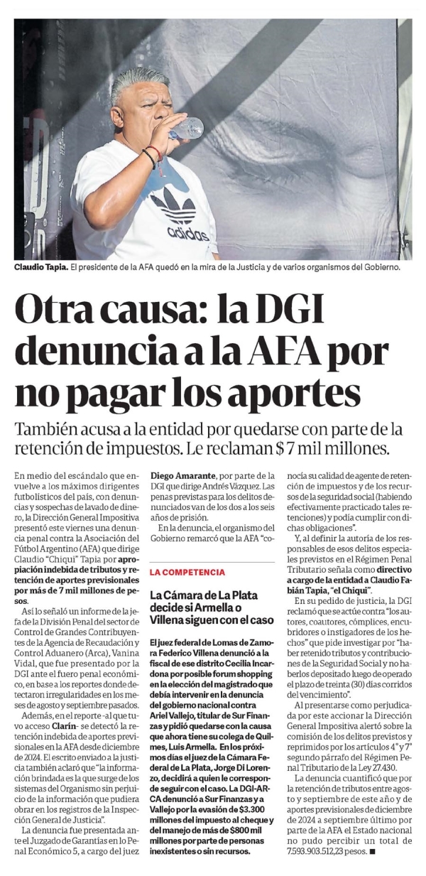 Otra causa: la DGI denuncia a la AFA por no pagar los aportes Claudio Tapia. El presidente de la AFA quedó en la mira de la Justicia y de varios organismos del Gobierno. Otra causa: la DGI denuncia a la AFA por no pagar los aportes También acusa a la entidad por quedarse con parte de la retención de impuestos. Le reclaman $7 mil millones. En medio del escándalo que envuelve a los máximos dirigentes futbolísticos del país, con denuncias y sospechas de lavado de dinero, la Dirección General Impositiva presentó este viernes una denuncia penal contra la Asociación del Fútbol Argentino (AFA) que dirige Claudio “Chiqui” Tapia por apropiación indebida de tributos y retención de aportes previsionales por más de 7 mil millones de pesos. Así lo señaló un informe de la jefa de la División Penal del sector de Control de Grandes Contribuyentes de la Agencia de Recaudación y Control Aduanero (Arca), Vanina Vidal, que fue presentado por la DGI ante el fuero penal económico, en base a los reportes donde detectaron irregularidades en los meses de agosto y septiembre pasados. Además, en el reporte -al que tuvo acceso Clarín- se detectó la retención indebida de aportes previsionales en la AFA desde diciembre de 2024. El escrito enviado a la justicia también aclaró que “la información brindada es la que surge de los sistemas del Organismo sin perjuicio de la información que pudiera obrar en los registros de la Inspección General de Justicia”. La denuncia fue presentada ante el Juzgado de Garantías en lo Penal Económico 5, a cargo del juez Diego Amarante, por parte de la DGI que dirige Andrés Vázquez. Las penas previstas para los delitos denunciados van de los dos a los seis años de prisión. En la denuncia, el organismo del Gobierno remarcó que la AFA “conocía su calidad de agente de retención de impuestos y de los recursos de la seguridad social (habiendo efectivamente practicado tales retenciones) y podía cumplir con dichas obligaciones”. Y, al definir la autoría de los responsables de esos delitos, especialmente previstos en el Régimen Penal Tributario, señala como directivo a cargo de la entidad a Claudio Fabián Tapia, “el Chiqui”. En su pedido de justicia, la DGI reclamó que se actúe contra “los autores, coautores, cómplices, encubridores o instigadores de los hechos” que pide investigar por “haber retenido tributos y contribuciones de la Seguridad Social y no haberlos depositado luego de operado el plazo de treinta (30) días corridos del vencimiento”. Al presentarse como perjudicada por este accionar, la Dirección General Impositiva alertó sobre la omisión de los delitos previstos y reprimidos por los artículos 4° y 7° segundo párrafo del Régimen Penal Tributario de la Ley 27.430. La denuncia cuantificó que por la retención de tributos entre agosto y septiembre de este año y de aportes previsionales de diciembre de 2024 a septiembre último por parte de la AFA el Estado nacional no pudo percibir un total de 7.593.903.512,23 pesos. LA COMPETENCIA La Cámara de La Plata decide si Armella o Villena siguen con el caso El juez federal de Lomas de Zamora Federico Villena denunció a la fiscal de ese distrito Cecilia Incardona por posible forum shopping en la elección del magistrado que debía intervenir en la denuncia del gobierno nacional contra Ariel Vallejo, titular de Sur Finanzas, y pidió quedarse con la causa que ahora tiene su colega de Quilmes, Luis Armella. En los próximos días el juez de la Cámara Federal de La Plata, Jorge Di Lorenzo, decidirá a quién le corresponde seguir con el caso. La DGI-ARCA denunció a Sur Finanzas y a Vallejo por la evasión de $3.300 millones del impuesto al cheque y el manejo de más de $800 mil millones por parte de personas inexistentes o sin recursos. Menciones: CPOL1