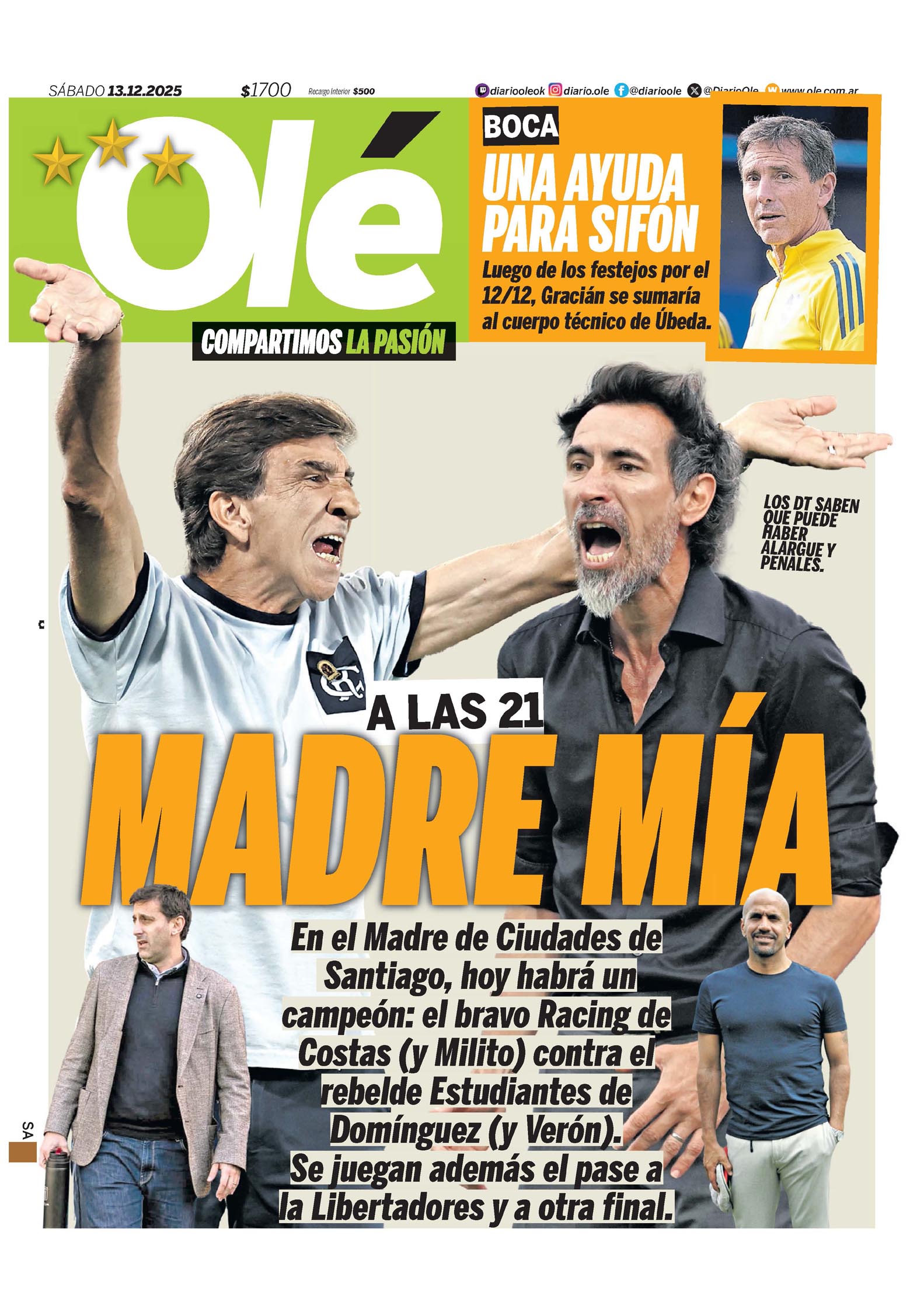 Olé Tapa BOCA UNA AYUDA PARA SIFÓN Luego de los festejos por el 12/12, Gracián se sumaría al cuerpo técnico de Úbeda A LAS 21 MADRE MÍA En el Madre de Ciudades de Santiago, hoy habrá un campeón: el bravo Racing de Costas (y Milito) contra el rebelde Estudiantes de Domínguez (y Verón). Se juegan además el pase a la Libertadores y a otra final. LOS DT SABEN QUE PUEDE HABER ALARGUE Y PENALES.