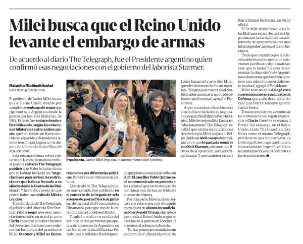 Milei busca que el Reino Unido levante el embargo de armas Natasha Niebieskikwia De acuerdo al diario The Telegraph, fue el Presidente argentino quien confirmó esas negociaciones con el gobierno del laborista Starmer. El gobierno de Javier Milei busca que el Reino Unido levante por completo el embargo de armas que rige contra la Argentina desde la guerra por las Islas Malvinas, de 1982. Este se fue endureciendo o flexibilizando, según las relaciones bilaterales entre ambos países, que han tenido un fuerte vínculo en el pasado y después una latente tensión por la guerra y la disputa de soberanía de las Islas del Atlántico Sur. Esta semana el tema volvió a estar sobre la mesa de manera confusa porque el diario The Telegraph publicó que Milei le había dicho que se habían iniciado las "negociaciones para revisar las restricciones que habían frenado a su ejército desde la Guerra de las Malvinas". Y hasta dio cuenta de que podría haber una visita de Milei a Londres. Tras el artículo de The Telegraph, el gobierno del laborista Keir Starmer salió a negar que esas negociaciones estén en marcha, pero Clarín conversó con altas fuentes del Gobierno libertario que confirmaron los dichos del presidente Milei. Starmer y Milei no tienen relaciones por diferencias políticas. Pero nunca se criticaron en público. El artículo de The Telegraph hizo mucho ruido. Fue publicado en el contexto de la llegada de seis aviones de guerra F16 a la Argentina, de un total de 24 comprados a Dinamarca, pero que son de la estadounidense Lockheed Martin. También se dio en medio del anuncio de dos petroleras que operan sin consenso de Argentina en las Malvinas -la israelí Navitas Petroleum y la británica Rockhopper- de que piensan extraer petróleo en 2028. El canciller Pablo Quirno sacó un comunicado en protesta y se reclamó que se abstengan de continuar con dichas actividades en zona de disputa. Por otra parte, Milei también encara sus relaciones con el mundo, apoyado en su alianza incondicional con Donald Trump, algo que incomoda al Reino Unido, según se decanta de la prensa en Londres. O al menos al gobierno laborista. "No hay potencias mundiales sin poder militar", afirma el periodista. Louis Emanuel que le dijo Milei, que efectivamente le dio un reportaje. "Ningún país cuenta en el contexto internacional sino puede defender sus fronteras", agregó el Presidente. Al ser consultado directamente si se habían iniciado las negociaciones para flexibilizar el veto británico, Milei le respondió a Emanuel: "Absolutamente". The Telegraph escribió que estaba en condiciones de revelar que Milei viajaría al Reino Unido en abril o mayo del próximo año y que le gustaría reunirse con Keir Starmer, así como con líderes de la oposición, incluido Nigel Farage. Y que también invitó a Keir a Buenos Aires para una visita oficial. "El Sr. Milei insistió en que las Islas Malvinas serían devueltas a Argentina por la vía diplomática, a diferencia de sus predecesores más intransigentes", agrega el diario británico. "Dado que considero que la solución debe buscarse mediante soluciones pacíficas y diplomáticas, creo que la mejor manera de demostrar la disposición de Argentina es demostrar que también tenemos una relación comercialmente madura", agregó el Presidente. Milei sostuvo que delegó esas conversaciones en su ministro de Defensa, que acaba de cambiar, el civil Luis Petri al teniente general Carlos Presti. El nuevo ministro va a continuar las conversaciones, según aseguraron a Clarín fuentes cercanas a Presti. Sin embargo, en el Reino Unido, tanto The Guardian, Sky News como el mismo Telegraph publicaron que un portavoz de Downing Street negó que hubiera conversaciones "específicas" sobre la flexibilización de los controles a las exportaciones. Presidente. Javier Milei impulsa un acercamiento con Londres. Menciones: cpol1