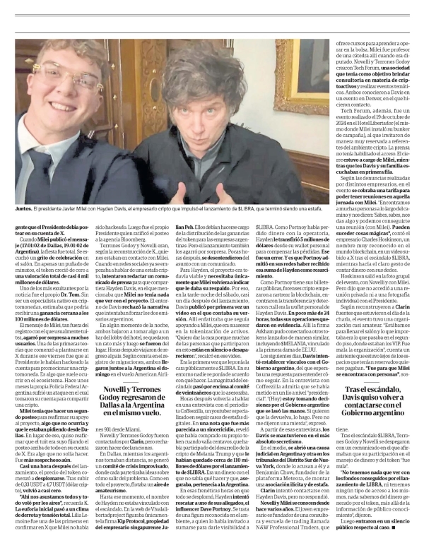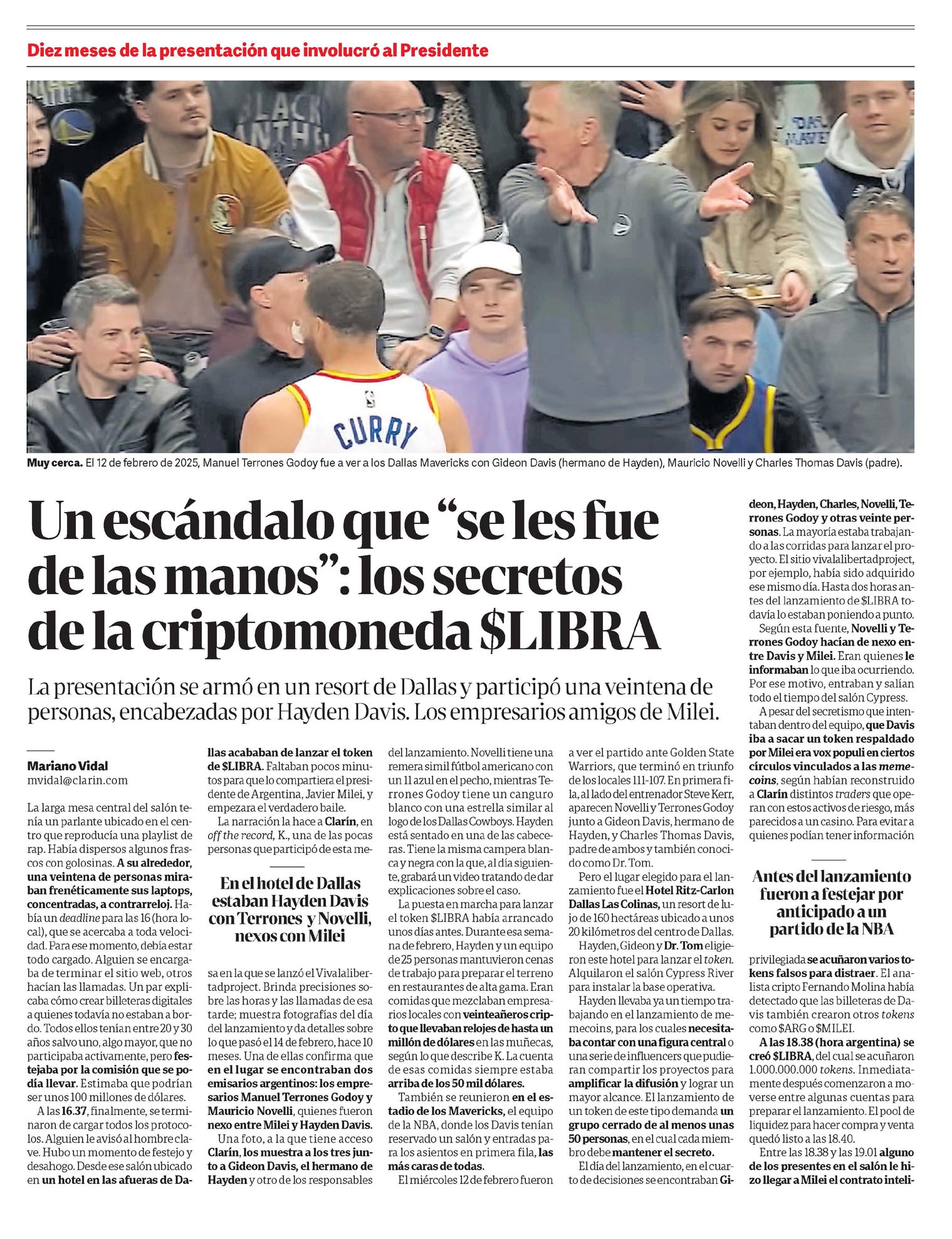 Un escándalo que "se les fue de las manos": los secretos de la criptomoneda $LIBRA Mariano Vidal Diez meses de la presentación que involucró al Presidente Muy cerca. El 12 de febrero de 2025, Manuel Terrones Godoy fue a ver a los Dallas Mavericks con Gideon Davis (hermano de Hayden), Mauricio Novelli y Charles Thomas Davis (padre). Un escándalo que "se les fue de las manos": los secretos de la criptomoneda $LIBRA La presentación se armó en un resort de Dallas y participó una veintena de personas, encabezadas por Hayden Davis. Los empresarios amigos de Milei. Mariano Vidal mvid@clarin.com La larga mesa central del salón tenía un parlante ubicado en el centro que reproducía una playlist de rap. Había dispersos algunos frascos con golosinas. A su alrededor, una veintena de personas miraban frenéticamente sus laptops, concentradas, a contrarreloj. Había un deadline para las 16 (hora local), que se acercaba a toda velocidad. Para ese momento, debía estar todo cargado. Alguien se encargaba de terminar el sitio web, otro hacían las llamadas. Un par explicaba cómo crear billeteras digitales a quienes todavía no estaban a bordo. Todos ellos tenían entre 20 y 30 años salvo uno, algo mayor, que no participaba activamente, pero festejaba por la comisión que se podía llevar. Estimaba que podrían ser unos 100 millones de dólares. A las 16.37, finalmente, se terminaron de cargar todos los protocolos. Alguien le avisó al hombre clave. Hubo un momento de festejo y desahogo. Desde ese salón ubicado en un hotel en las afueras de Da- llas acababan de lanzar el token de $LIBRA. Faltaban pocos minutos para que lo compartiera el presidente de Argentina, Javier Milei, y empezara el verdadero baile. La narración la hace a Clarín, "off the record", K., una de las pocas personas que participó de esta me- En el hotel de Dallas estaban Hayden Davis con Terrones y Novelli, nexos con Milei sa en la que se lanzó el Vivalalibertadproject. Brinda precisiones sobre las horas y las llamadas de ese tarde; muestra fotografías del día del lanzamiento y da detalles sobre lo que pasó el 14 de febrero, hace 10 meses. Una de ellas confirma que en el lugar se encontraban dos emisarios argentinos: los empresarios Manuel Terrones Godoy y Mauricio Novelli, quienes fueron nexo entre Milei y Hayden Davis. Una foto, a la que tiene acceso Clarín, los muestra a los tres junto a Gideon Davis, el hermano de Hayden y otro de los responsables del lanzamiento. Novelli tiene una remera símil fútbol americano con un 11 azul en el pecho, mientras Terrones Godoy tiene un canguro blanco con una estrella similar al logo de los Dallas Cowboys. Hayden está sentado en una de las cabeceras. Tiene la misma campera blanca y negra con la que, al día siguiente, grabará un video tratando de dar explicaciones sobre el caso. La puesta en marcha para lanzar el token $LIBRA había arrancado unos días antes. Durante esa semana de febrero, Hayden y un equipo de 25 personas mantuvieron cenas de trabajo para preparar el terreno en restaurantes de alta gama. Eran comidas que mezclaban empresarios locales con veinteañeros cripto que llevaban relojes de hasta un millón de dólares en las muñecas, según lo que describe K. La cuenta de esas comidas siempre estaba arriba de los 50 mil dólares. También se reunieron en el estadio de los Mavericks, el equipo de la NBA, donde los Davis tenían reservado un salón y entradas para los asientos en primera fila, las más caras de todas. El miércoles 12 de febrero fueron a ver el partido ante Golden State Warriors, que terminó en triunfo de los locales 111-107. En primera fila, al lado del entrenador Steve Kerr, aparecen Novelli y Terrones Godoy junto a Gideon Davis, hermano de Hayden, y Charles Thomas Davis, padre de ambos y también conocido como Dr. Tom. Pero el lugar elegido para el lanzamiento fue el Hotel Ritz-Carlton Dallas Las Colinas, un resort de lujo de 160 hectáreas ubicado a unos 20 kilómetros del centro de Dallas. Hayden, Gideon y Dr. Tom eligieron este hotel para lanzar el token. Alquilaron el salón Cypress River para instalar la base operativa. Hayden llevaba ya un tiempo trabajando en el lanzamiento de memecoins, para los cuales necesitaba contar con una figura central y una serie de influencers que pudieran amplificar la difusión y lograr un mayor alcance. El lanzamiento de un token de este tipo demanda un grupo cerrado de al menos unas 50 personas, en el cual cada miembro debe mantener el secreto. El día del lanzamiento, en el cuarto de decisiones se encontraban Gi- deon, Hayden, Charles, Novelli, Terrones Godoy y otras veinte personas. La mayoría estaba trabajando a las corridas para lanzar el proyecto. El sitio vivalalibertadproject, por ejemplo, había sido adquirido ese mismo día. Hasta dos horas antes del lanzamiento de $LIBRA todavía lo estaban poniendo a punto. Según esta fuente, Novelli y Terrones Godoy hacían de nexo entre Davis y Milei. Eran quienes le informaban lo que iba ocurriendo. Por ese motivo, entraban y salían todo el tiempo del salón Cypress. A pesar del secretismo que intentaban dentro del equipo, que Davis iba a sacar un token respaldado por Milei era vox populi en ciertos círculos vinculados a las memecoins, según habían reconstruido a Clarín distintos traders que operan con estos activos de riesgo, más parecidos a un casino. Para evitar a quienes podían tener información Antes del lanzamiento fueron a festejar por anticipado a un partido de la NBA privilegiada se acuñaron varios tokens falsos para distraer. El analista cripto Fernando Molina había detectado que las billeteras de Davis también crearon otros tokens como $ARG o $MILEI. Alas 18.38 (hora argentina) se creó $LIBRA, del cual se acuñaron 1.000.000.000 tokens. Inmediatamente después comenzaron a moverse entre algunas cuentas para preparar el lanzamiento. El pool de liquidez para hacer compra y venta quedó listo a las 18.40. Entre las 18.38 y las 19.01 alguno 