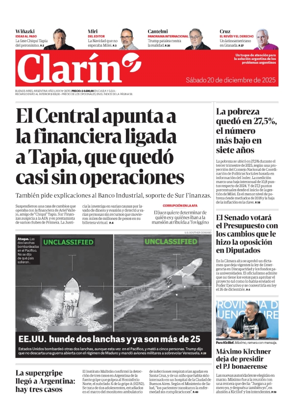 Clarín Tapa Wiñazki La fase Chiqui Tapia del peronismo. P. 2 IDEAS AL PASO Miri La Navidad que no esperaba Milei. P. 3 DEL EDITOR Cantelmi Trump patalea contra la realidad. P. 26 PANORAMA INTERNACIONAL Cruz Un latinoamericano en Granada. P. 27 EL REVÉS Y EL DERECHO El Central apunta a la financiera ligada a Tapia, que quedó casi sin operaciones También pide explicaciones al Banco Industrial, soporte de Sur Finanzas. Suspendieron una casa de cambios que operaba con la financiera de Ariel Vallejo, amigo de "Chiqui" Tapia. Sur Finanzas auspicia a la AFA y es prestamista de varios clubes de Primera. La Justicia la investiga en varias causas por lavado de dinero y evasión y detectó a varias personas sin recursos que movieron miles de millones de pesos en su billetera virtual. P. 4 El juez quiere determinar de quién es y quiénes iban a la mansión atribuida a Toviggino CORRUPCIÓN EN LA AFA EE.UU. hunde dos lanchas y ya son más de 25 Estados Unidos bombardeó otras dos lanchas, aunque esta vez en el Pacífico, y mató a cinco personas. Trump dijo que no descarta una guerra abierta con el régimen de Maduro y mandó aviones militares a sobrevolar Venezuela. P. 28 Ataque. Las dos lanchas bombardeadas en el Pacífico. No se dijo de qué país salieron . La supergripe llegó a Argentina: hay tres casos El Instituto Malbrán confirmó la detección de tres casos en Argentina de la fuerte gripe que golpea al Hemisferio Norte, el subclado K de la gripe A (H3N2). Se trata de dos adolescentes, estudiados en el marco del monitoreo ambulatorio de infecciones respiratorias agudas en Santa Cruz, y de un niño que había sido internado en un hospital de la Ciudad de Buenos Aires. Según el Ministerio de Salud, "los pacientes transitaron la enfermedad sin complicaciones". P. 40 La pobreza quedó en 27,5%, el número más bajo en siete años La pobreza se ubicó en 27,5% durante el tercer trimestre de 2025, según una proyección del Consejo Nacional de Coordinación de Políticas Sociales basada en información del Indec. La medición marca una baja interanual de 10,8 puntos respecto de 2024. Y de 27,3 puntos porcentuales desde el inicio de la gestión de Milei. Es el menor nivel de pobreza desde mediados de 2018 y la baja de la inflación es la clave. P. 18 El Senado votará el Presupuesto con los cambios que le hizo la oposición en Diputados En la Cámara alta se aprobó un dictamen que deja vigentes la ley de Emergencia en Discapacidad y los fondos para universidades. El oficialismo admite que no tiene los votos para aprobar el proyecto tal como lo había enviado el Poder Ejecutivo y se convertiría en ley el 26 de diciembre. P. 6 Máximo Kirchner deja de presidir el PJ bonaerense Las nuevas autoridades se elegirán en marzo. Máximo fue a la reunión con una remera que decía: "Juegan a primero yo, y después a también yo", en alusión a Kicillof y los intendentes. P. 10 Para Kicillof. Máximo, remera con mensaje.