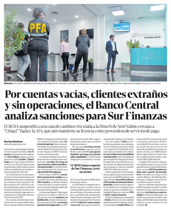 Por cuentas vacías, y sin operaciones, el Banco Central analiza sanciones para Sur Finanzas Mariano Boettner Allanado. Uno de los operativos judiciales en las sedes de Sur Finanzas, la fintech de Ariel Vallejo vinculada con Chiqui Tapia y la AFA, sospechada de lavado. ENRIQUE GARCÍA MEDINA. El BCRA suspendió a una casa de cambios vinculada a la fintech de Ariel Vallejo cercana a “Chiqui” Tapia y la AFA, que aún mantiene su licencia como proveedora de servicios de pago. Mariano Boettner mboettner@clarin.com En paralelo a la investigación judicial por lavado de dinero, Sur Finanzas, la financiera del empresario Ariel Vallejo y ligada al presidente de la AFA Claudio “Chiqui” Tapia, está bajo la lupa del Banco Central, que detectó operaciones sospechosas y pidió explicaciones al Banco Industrial, que actuaba como entidad de “soporte”. El Central puede monitorear a través de la Superintendencia de Entidades Financieras y Cambiarias, que conduce Juan Curutchet. Según la regulación, el BCRA no tiene potestad para actuar en casos de sospecha de lavado de activos vinculados a las fintech, algo que le corresponde a la Unidad de Información Financiera (UIF). De acuerdo a fuentes que conocen el caso, el Central advirtió desde hace tiempo al Banco Industrial (BIND), la depositara de los fondos -un requerimiento legal- sobre “defectos de todo tipo” que los inspectores detectaron entre las operaciones de clientes de Sur Finanzas. Hace tres semanas el BIND cerró su cuenta con la financiera. Las alertas surgieron por dos típicas razones en operaciones sospechosas: perfiles de riesgo de esas personas y falta de justificación patrimonial. La justicia investiga movimientos de dinero por más de $800.000 millones. En ese marco, el BCRA le prohibió la operatoria de cambios a una sociedad vinculada a Sur Finanzas, ARS Cambios, por 30 días desde el 11 de diciembre, y analiza qué hacer con la licencia de Proveedor de Servicios de Pago (PSP). La financiera ligada a Tapia sigue vigente en el registro oficial y si bien técnicamente mantiene su habilitación, fuentes oficiales aseguran que en la práctica ya no tiene operatoria de ningún tipo. Las PSP ofrecen servicios de cobro, pagos y manejo de cuentas, pero no tienen licencia de bancos. Por esa razón necesitan un banco tradicional -regulado por el BCRA- como el BIND para que los depósitos que hagan sus clientes estén respaldados. Los PSP tienen obligación de mantener “encaje-dos” (inmovilizados) el 100% de los fondos que captan. Las PSP tienen un régimen de información que cumplir ante el Central: deben reportar los saldos de sus clientes, los montos invertidos, o pendientes de acreditación. Según fuentes oficiales, en el último informe que giró Sur Finanzas al BCRA todas las cuentas aparecen en cero. Una opción es que hayan devuelto la plata a sus clientes. Tal como publicó Clarín, un dato clave ya asomaba como alarmante en los últimos meses de acuerdo a los registros de entidades no financieras proveedoras de crédito: los porcentajes de incobrabilidad eran muy altos entre los préstamos que otorgaba Sur Finanzas. El monto registrado en el informe es mucho menor a la cifra de operaciones que investiga la Justicia, superior a 800.000 millones de pesos. Hasta septiembre, Sur Finanzas Group registra una cartera de préstamos de casi $2.900 millones. De ese mes, del total unos $660 millones (23%) estaban en situación de irregularidad, es decir, tenían algún tipo de demora en el repago. Entre abril y mayo el porcentaje de incobrabilidad llegó a ser casi total, 99% y 100%, respectivamente. El Banco Industrial no respondió a Clarín sobre su rol como entidad depositara de Sur Finanzas. El banco, propiedad de Andrés Meta (que tiene el 50,3% de la participación) y su madre, Carlota Durst de Meta, con el 46,4%, fue el sexto con mayor monto de operaciones en el mercado cambiario en el tercer trimestre del año, con US$ 8.246 millones, según el Banco Central. Desde la salida del cepo vendió a ahorristas US$ 12.228 millones. La explicación para ese número, al considerar que no es uno de los grandes bancos comerciales del sistema, es que el BIND también trabaja como “soporte” de otras fintech como Mercado Pago, Cocos Capital, Balanz o Bull Market Brokers, que en algunos casos ofrecieron dólares a precio oficial. Solo las entidades reguladas por el BCRA pueden comprar o vender divisas en el mercado mayorista, es decir que las fintech no están incluidas. A fines de septiembre, en medio de una fuerte presión cambiaria, el BCRA hizo una aclaración sobre la norma vigente y se lo prohibió. Menciones: CPOL1 EJESAPP