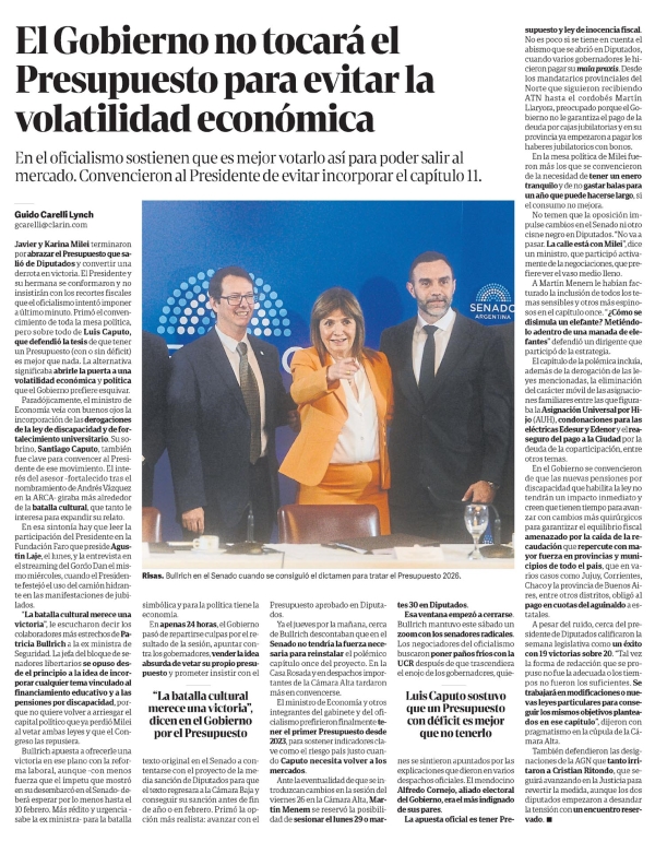 El Gobierno no tocará el Presupuesto para evitar la volatilidad económica Guido Carelli Lynch En el oficialismo sostienen que es mejor votarlo así para poder salir al mercado. Convencieron al Presidente de evitar incorporar el capítulo 11. Guido Carelli Lynch gcarelli@clarin.com Javier y Karina Milei terminaron por abrazar el Presupuesto que salió de Diputados y convertir una derrota en victoria. El Presidente y su hermana se conformaron y no insistirán con los recortes fiscales que el oficialismo intentó imponer a último minuto. Primó el convencimiento de toda la mesa política, pero sobre todo de Luis Caputo, que defendió la tesis de que tener un Presupuesto (con o sin déficit) es mejor que nada. La alternativa significaba abrirle la puerta a una volatilidad económica y política que el Gobierno prefiere esquivar. Paradójicamente, el ministro de Economía veía con buenos ojos la incorporación de las derogaciones de la ley de discapacidad y de fortalecimiento universitario. Su sobrino, Santiago Caputo, también fue clave para convencer al Presidente de ese movimiento. El interés del asesor -fortalecido tras el nombramiento de Andrés Vázquez en la ARCA- giraba más alrededor de la batalla cultural, que tanto le interesa para expandir su relato. En esa sintonía hay que leer la participación del Presidente en la Fundación Faro que preside Agustín Laje, el lunes, y la entrevista en el streaming del Gordo Dan el mismo miércoles, cuando el Presidente festejó el uso del camión hidrante en las manifestaciones de jubilados. "La batalla cultural merece una victoria", le escucharon decir los colaboradores más estrechos de Patricia Bullrich a la ex ministra de Seguridad. La jefa del bloque de senadores libertarios se opuso desde el principio a la idea de incorporar cualquier tema vinculado a financiamiento educativo y a las pensiones por discapacidad, porque no quiere volver a arriesgar el capital político que ya perdió Milei al vetar ambas leyes y que el Congreso las repusiera. Bullrich apuesta a ofrecerle una victoria en ese plano con la reforma laboral, aunque -con menos fuerza que el ímpetu que mostró en su desembarcó en el Senado- deberá esperar por lo menos hasta el 10 febrero. Más rédito y urgencia -sabe la ex ministra- para la batalla simbólica y para la política tiene la economía. En apenas 24 horas, el Gobierno pasó de repartirse culpas por el resultado de la sesión, apuntar contra los gobernadores, vender la idea absurda de vetar su propio presupuesto y prometer insistir con el texto original en el Senado a contentarse con el proyecto de la media sanción de Diputados para que el texto regresara a la Cámara Baja y conseguir su sanción antes de fin de año o en febrero. Primó la opción más realista: avanzar con el Presupuesto aprobado en Diputados. "La batalla cultural merece una victoria", dicen en el Gobierno por el Presupuesto Ya el jueves por la mañana, cerca de Bullrich descontaban que en el Senado no tendría la fuerza necesaria para reinstalar el polémico capítulo once del proyecto. En la Casa Rosada y en despachos importantes de la Cámara Alta tardaron más en convencerse. El ministro de Economía y otros integrantes del gabinete y del oficialismo prefirieron finalmente tener el primer Presupuesto desde 2023, para sostener indicadores clave como el riesgo país justo cuando Caputo necesita volver a los mercados. Ante la eventualidad de que se introduzcan cambios en la sesión del viernes 26 en la Cámara Alta, Martín Menem se reservó la posibilidad de sesionar el lunes 29 o martes 30 en Diputados. Esa ventana empezó a cerrarse. Bullrich mantuvo este sábado su zoom con los senadores radicales. Los negociadores del oficialismo buscaron poner paños fríos con la UCR después de que trascendiera el enojo de los gobernadores, quienes se sintieron apuntados por las explicaciones que dieron en varios despachos oficiales. El mendocino Alfredo Cornejo, aliado electoral del Gobierno, era el más indignado de sus pares. Luis Caputo sostuvo que un Presupuesto con déficit es mejor que no tenerlo Presupuesto y ley de inocencia fiscal. No es poco si se tiene en cuenta el abismo que se abrió en Diputados, cuando varios gobernadores le hicieron pagar su mala praxis. Desde los mandatarios provinciales del Norte que siguieron recibiendo ATN hasta el cordobés Martín Llaryora, preocupado porque el Gobierno no le garantiza el pago de la deuda por cajas jubilatorias y en su provincia ya empezaron a pagar los haberes jubilatorios con bonos. En la mesa política de Milei fueron más los que se convencieron de la necesidad de tener un enero tranquilo y de no gastar balas para un año que puede hacerse largo, si el consumo no mejora. No temen que la oposición impulse cambios en el Senado ni otro cisne negro en Diputados. "No va a pasar. La calle está con Milei", dice un ministro, que participó activamente de la negociaciones, que prefiere ver el vaso medio lleno. A Martín Menem le habían facturado la inclusión de todos los temas sensibles y otros más espinosos en el capítulo once. "¿Cómo se disimula un elefante? Metiéndolo adentro de una manada de elefantes" defendió un dirigente que participó de la estrategia. El capítulo de la polémica incluía, además de la derogación de las leyes mencionadas, la eliminación del carácter móvil de las asignaciones familiares entre las que figuraba la Asignación Universal por Hijo (AUH), condonaciones para las eléctricas Edesur y Edenor y el reaseguro del pago a la Ciudad por la deuda de la coparticipación, entre otros temas. En el Gobierno se convencieron de que las nuevas pensiones por discapacidad que habilita la ley no tendrán un impacto inmediato y creen que tienen tiempo para avanzar con cambios más quirúrgicos para garantizar el equilibrio fiscal amenazado por la caída de la recaudación que repercute con mayor fuerza en provincias y municipios de todo el país, que en varios casos c
