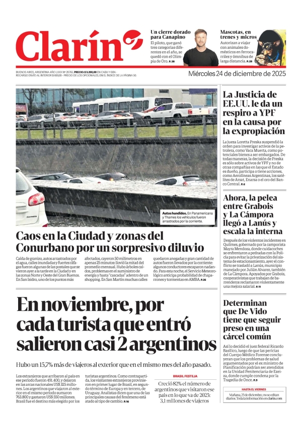 Clarín Tapa Un cierre dorado para Canapino El piloto, que ganó tres categorías diferentes en el año, se quedó con el Olimpia de Oro. P. 38 Mascotas, en trenes y micros Autorizan a viajar con animales domésticos en ferrocarriles y ómnibus de larga distancia. P. 28 Caos en la Ciudad y zonas del Conurbano por un sorpresivo diluvio Caída de granizo, autos arrastrados por el agua, calles inundadas y fuertes ráfagas fueron algunas de las postales que se vieron ayer a la tarde en la Ciudad y en las zonas Norte y Oeste del Gran Buenos. En San Isidro, uno de los puntos más afectados, cayeron 50 milímetros en apenas 25 minutos: llovió la mitad del promedio mensual. Hubo árboles caídos, problemas en el suministro de energía y hasta "cascadas" adentro de un shopping. En San Martín muchas calles quedaron anegadas y gran cantidad de autos fueron llevados por la corriente: algunos conductores escaparon nadando. Para esta noche, el Servicio Meteorológico anticipa probabilidad de chaparrones y tormentas en AMBA. P. 26 Autos hundidos. En Panamericana y Thames los vehículos fueron arrastrados por la corriente. En noviembre, por cada turista que entró salieron casi 2 argentinos Hubo un 15,7% más de viajeros al exterior que en el mismo mes del año pasado. Los extranjeros que arribaron al país en ese período fueron 491.400, y dejaron en las arcas nacionales US$ 325 millones. Los argentinos que viajaron al exterior en el mismo período sumaron 763.800 y gastaron US$ 550 millones. Brasil fue el destino más elegido por los turistas argentinos. Como contrapartida, los visitantes extranjeros provinieron en primer lugar de Brasil, en segundo término de Europa y en tercero, de Uruguay. Analistas dicen que una de las principales causas del fenómeno está atado al tipo de cambio. P. 16 BRASIL FESTEJA Creció 82% el número de argentinos que visitaron ese país en lo que va de 2025: 3,1 millones de viajeros La Justicia de EE.UU. le da un respiro a YPF en la causa por la expropiación La jueza Loretta Preska suspendió la orden para investigar activos de la petrolera, como Vaca Muerta, como potenciales bienes a ser embargados. De todas maneras, la decisión de Preska es sólo sobre activos de YPF y no de otras compañías en las que el Estado es dueño, participa o tiene acciones, como Aerolíneas Argentinas, los satélites de Arsat, Enarsa o el oro del Banco Central. P. 6 Ahora, la pelea entre Grabois y La Cámpora llegó a Lanús y escala la interna Después de los violentos incidentes en Quilmes, gobernado por la camporista Mayra Mendoza, donde cuidacoches se enfrentaron a pedradas con la Policía para evitar la privatización del sistema de estacionamiento, ayer el conflicto se trasladó a Lanús, municipio manejado por Julián Alvarez, también de La Cámpora. Apoyados por Grabois, cooperativistas que trabajan de barrenderos reclamaron violentamente una mejora salarial. P. 11 Determinan que De Vido tiene que seguir preso en una cárcel común Así lo decidió el juez federal Ricardo Basílico, luego de que las pericias del Cuerpo Médico Forense concluyeran que los problemas de salud argumentados por el ex ministro de Planificación podrían ser atendidos en la Unidad Penitenciaria de Ezeiza, donde cumple condena por la Tragedia de Once. P. 9