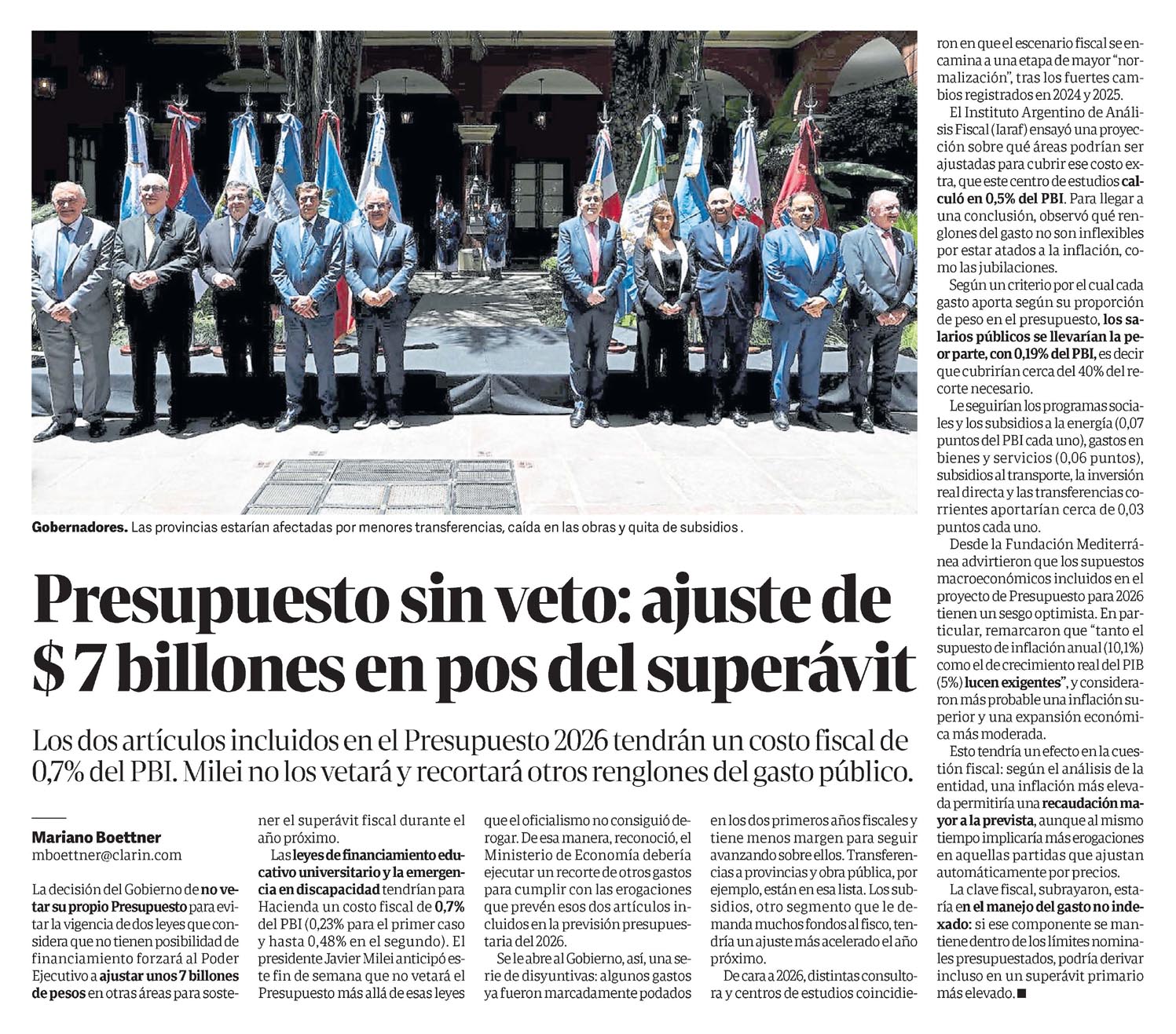 Presupuesto sin veto: ajuste de $7 billones en pos del superávit Mariano Boettner Los dos artículos incluidos en el Presupuesto 2026 tendrán un costo fiscal de 0,7% del PBI. Milei no los vetará y recortará otros renglones del gasto público. La decisión del Gobierno de no vetar su propio Presupuesto para evitar la vigencia de dos leyes que considera que no tienen posibilidad de financiamiento forzará al Poder Ejecutivo a ajustar unos 7 billones de pesos en otras áreas para sostener el superávit fiscal durante el año próximo. Las leyes de financiamiento educativo universitario y la emergencia en discapacidad tendrían para Hacienda un costo fiscal de 0,7% del PBI (0,23% para el primer caso y hasta 0,48% en el segundo). El presidente Javier Milei anticipó este fin de semana que no vetará el Presupuesto más allá de esas leyes que el oficialismo no consiguió derogar. De esa manera, reconoció, el Ministerio de Economía debería ejecutar un recorte de otros gastos para cumplir con las erogaciones que prevén esos dos artículos incluidos en la previsión presupuestaria del 2026. Se le abre al Gobierno, así, una serie de disyuntivas: algunos gastos ya fueron marcadamente podados. En los dos primeros años fiscales tiene menos margen para seguir avanzando sobre ellos. Transferencias a provincias y obra pública, por ejemplo, están en esa lista. Los subsidios, otro segmento que le demanda muchos fondos al fisco, tendría un ajuste más acelerado el año próximo. De cara a 2026, distintas consultoras y centros de estudios coincidieron en que el escenario fiscal se encamina a una etapa de mayor "normalización", tras los fuertes cambios registrados en 2024 y 2025. El Instituto Argentino de Análisis Fiscal (Iaraf) ensayó una proyección sobre qué áreas podrían ser ajustadas para cubrir ese costo extra, que este centro de estudios calculó en 0,5% del PBI. Para llegar a una conclusión, observó qué renglones del gasto no son inflexibles por estar atados a la inflación, como las jubilaciones. Según un criterio por el cual cada gasto aporta según su proporción de peso en el presupuesto, los salarios públicos se llevarían la peor parte, con 0,19% del PBI, es decir que cubrirían cerca del 40% del recorte necesario. Le seguirían los programas sociales y los subsidios a la energía (0,07 puntos del PBI cada uno), gastos en bienes y servicios (0,06 puntos), subsidios al transporte, la inversión real directa y las transferencias corrientes aportarían cerca de 0,03 puntos cada uno. Desde la Fundación Mediterránea advirtieron que los supuestos macroeconómicos incluidos en el proyecto de Presupuesto para 2026 tienen un sesgo optimista. En particular, remarcaron que "tanto el supuesto de inflación anual (10,1%) como el de crecimiento real del PBI (5%) lucen exigentes", y consideraron más probable una inflación superior y una expansión económica más moderada. Esto tendría un efecto en la cuestión fiscal: según el análisis de la entidad, una inflación más elevada permitiría una recaudación mayor a la prevista, aunque al mismo tiempo implicaría más erogaciones en aquellas partidas que ajustan automáticamente por precios. La clave fiscal, subrayaron, estaría en el manejo del gasto no indexado: si ese componente se mantiene dentro de los límites nominales presupuestados, podría derivar incluso en un superávit primario más elevado. Gobernadores. Las provincias estarían afectadas por menores transferencias, caída en las obras y quita de subsidios. Menciones: cpol1 ejesapp
