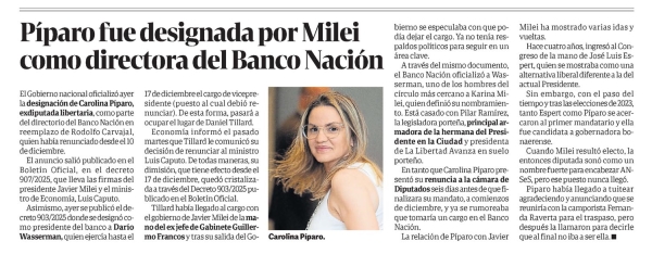 Píparo fue designada por Milei como directora del Banco Nación El Gobierno nacional oficializó ayer la designación de Carolina Píparo, exdiputada libertaria, como parte del directorio del Banco Nación en reemplazo de Rodolfo Carvajal, quien había renunciado desde el 10 de diciembre. El anuncio salió publicado en el Boletín Oficial, en el decreto 907/2025, que lleva las firmas del presidente Javier Milei y el ministro de Economía, Luis Caputo. Asimismo, ayer se publicó el decreto 903/2025 donde se designó como presidente del banco a Darío Wasserman, quien ejercía hasta el 17 de diciembre el cargo de vicepresidente (puesto al cual debió renunciar). De esta forma, pasará a ocupar el lugar de Daniel Tillard. Economía informó el pasado martes que Tillard le comunicó su decisión de renunciar al ministro Luis Caputo. De todas maneras, su dimisión, que tiene efecto desde el 17 de diciembre, quedó cristalizada a través del Decreto 903/2025 publicado en el Boletín Oficial. Tillard había llegado al cargo con el gobierno de Javier Milei de la mano del exjefe de Gabinete Guillermo Francos y tras su salida del Gobierno se especulaba con que podía dejar el cargo. Ya no tenía respaldos políticos para seguir en un área clave. A través del mismo documento, el Banco Nación oficializó a Wasserman, uno de los hombres del círculo más cercano a Karina Milei, quien definió su nombramiento. Está casado con Pilar Ramírez, la legisladora porteña, principal armadora de la hermana del Presidente en la Ciudad y presidenta de La Libertad Avanza en su suelo porteño. En tanto que Carolina Píparo presentó su renuncia a la cámara de Diputados seis días antes de que finalizara su mandato, a comienzo de diciembre, y ya se rumoreaba que tomaría un cargo en el Banco Nación. La relación de Píparo con Javier Milei ha mostrado varias idas y vueltas. Hace cuatro años, ingresó al Congreso de la mano de José Luis Espert, quien se mostraba como una alternativa liberal diferente a la del actual Presidente. Sin embargo, con el paso del tiempo y tras las elecciones de 2023, tanto Espert como Píparo se acercaron al primer mandatario y ella fue candidata a gobernadora bonaerense. Cuando Milei resultó electo, la entonces diputada sonó como un nombre fuerte para encabezar ANSeS, pero ese puesto nunca llegó. Piparo había llegado a tuitear agradeciendo y anunciando que se reuniría con la camporista Fernanda Raverta para el traspaso, pero después la llamaron para decirle que al final no iba a ser ella. Menciones: cpol1