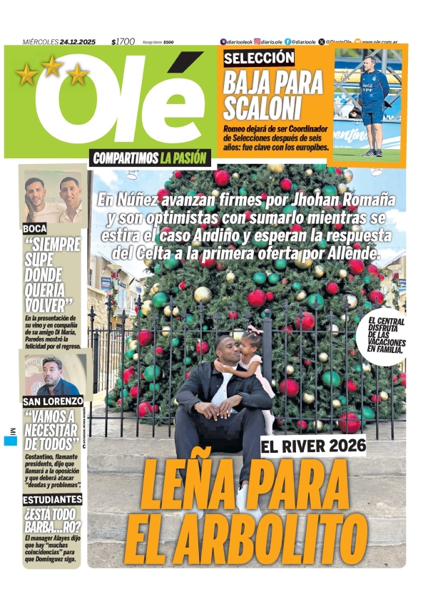 Olé Tapa EL RIVER 2026 LEÑA PARA EL ARBOLITO En Núñez avanzan firmes por Jhohan Romaña y son optimistas con sumarlo mientras se estira el caso Andino y esperan la respuesta del Celta a la primera oferta por Allende EL CENTRAL DISFRUTA DE LAS VACACIONES EN FAMILIA. BOCA "SIEMPRE SUPE DÓNDE QUERÍA VOLVER" En la presentación de su vino y en compañía de su amigo Di María, Paredes mostró la felicidad por el regreso. SAN LORENZO "VAMOS A NECESITAR DE TODOS" Costantino, flamante presidente, dijo que llamará a la oposición y que deberá atacar "deudas y problemas". ESTUDIANTES ¿ESTÁ TODO BARBA...RO? El manager Alayes dijo que hay "muchas coincidencias" para que Domínguez siga. SELECCIÓN BAJA PARA SCALONI Romeo dejará de ser Coordinador de Selecciones después de seis años: fue clave con los europibes