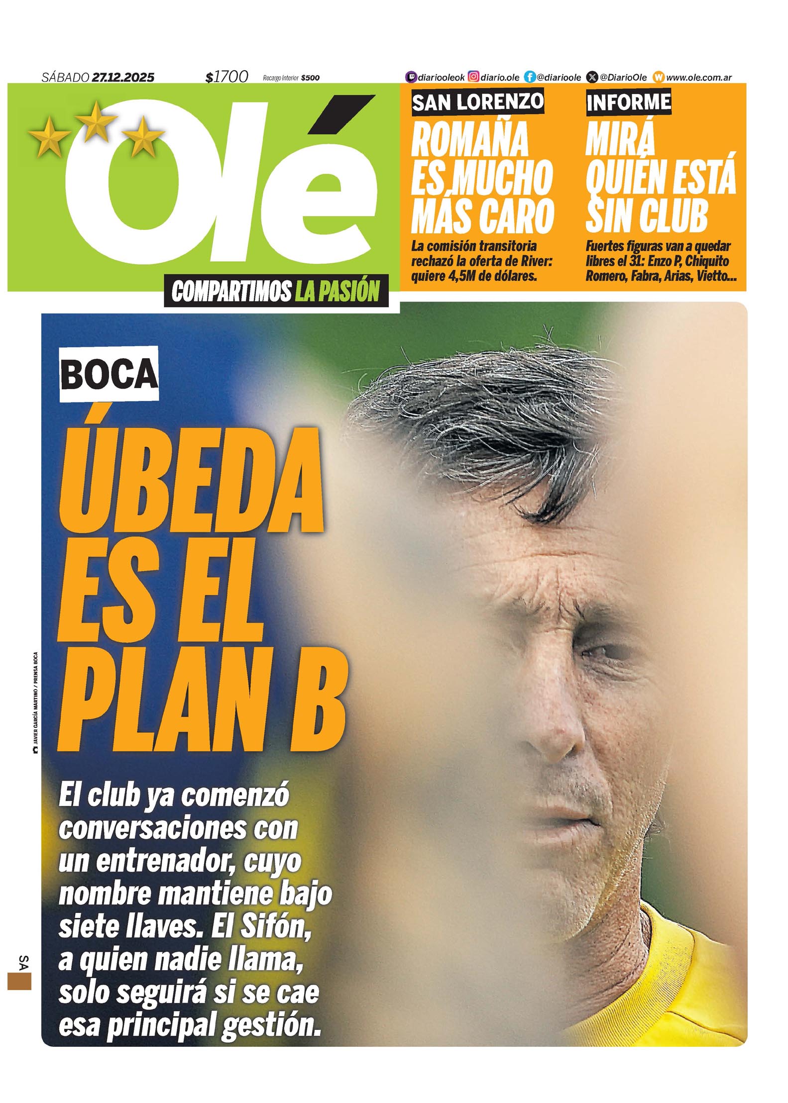 Olé tapa SAN LORENZO ROMAÑA ES MUCHO MÁS CARO La comisión transitoria rechazó la oferta de River: quiere 4,5M de dólares INFORME MIRÁ QUIÉN ESTÁ SIN CLUB Fuertes figuras van a quedar libres el 31: Enzo P, Chiquito Romero, Fabra, Arias, Vietto... BOCA ÚBEDA ES EL PLAN B El club ya comenzó conversaciones con un entrenador, cuyo nombre mantiene bajo siete llaves. El Sifón, a quien nadie llama, solo seguirá si se cae esa principal gestión