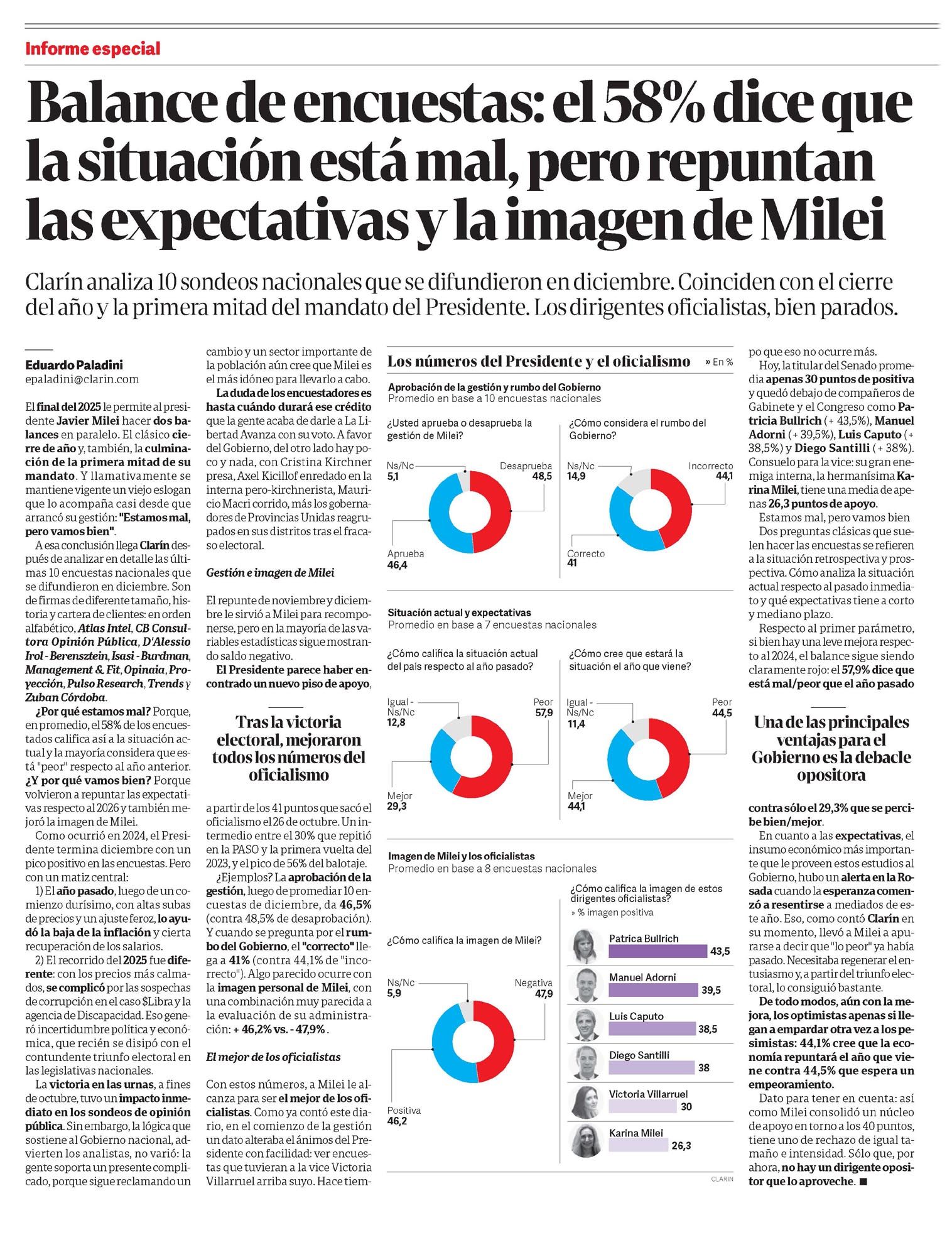 Balance de encuestas: el 58% dice que la situación está mal, pero repuntan las expectativas y la imagen de Milei Eduardo Paladini Clarín analiza 10 sondeos nacionales que se difundieron en diciembre. Coinciden con el cierre del año y la primera mitad del mandato del Presidente. Los dirigentes oficialistas, bien parados. Eduardo Paladini paladini@clarin.com El final del 2025 le permite al presidente Javier Milei hacer dos balances en paralelo. El clásico cierre de año y, también, la culminación de la primera mitad de su mandato. Y llamativamente se mantiene vigente un viejo eslogan que lo acompaña casi desde que arrancó su gestión: "Estamos mal, pero vamos bien". A esa conclusión llega Clarín después de analizar en detalle las últimas 10 encuestas nacionales que se difundieron en diciembre. Son de firmas de diferente tamaño, historia y cartera de clientes: en orden alfabético, Atlas Intel, CB Consultora Opinión Pública, D'Alessio Irol - Berensztein, Isasi - Burdman, Management & Fit, Opinaia, Proyección, Pulso Research, Trends y Zuban Córdoba. ¿Por qué estamos mal? Porque, en promedio, el 58% de los encuestados califica así a la situación actual y la mayoría considera que está "peor" respecto al año anterior. ¿Y por qué vamos bien? Porque volvieron a repuntar las expectativas respecto al 2026 y también mejoró la imagen de Milei. Como ocurrió en 2024, el Presidente termina diciembre con un pico positivo en las encuestas. Pero con un matiz central: 1) El año pasado, luego de un comienzo durísimo, con altas subas de precios y un ajuste feroz, lo ayudó la baja de la inflación y cierta recuperación de los salarios. 2) El recorrido del 2025 fue diferente: con los precios más calmados, se complicó por las sospechas de corrupción en el caso $Libra y la agencia de Discapacidad. Eso generó incertidumbre política y económica, que recién se disipó con el contundente triunfo electoral en las legislativas nacionales. La victoria en las urnas, a fines de octubre, tuvo un impacto inmediato en los sondeos de opinión pública. Sin embargo, la lógica que sostiene al Gobierno nacional, advierten los analistas, no varió: la gente soporta un presente complicado, porque sigue reclamando un cambio y un sector importante de la población aún cree que Milei es el más idóneo para llevarlo a cabo. La duda de los encuestadores es hasta cuándo durará ese crédito que la gente acaba de darle a La Libertad Avanza con su voto. A favor del Gobierno, del otro lado hay poco y nada, con Cristina Kirchner presa, Axel Kicillof enredado en la interna pero-kirchnerista, Mauricio Macri corrido, más los gobernadores de Provincias Unidas reagrupados en sus distritos tras el fracaso electoral. Gestión e imagen de Milei El repunte de noviembre y diciembre le sirvió a Milei para recomponerse, pero en la mayoría de las variables estadísticas sigue mostrando saldo negativo. El Presidente parece haber encontrado un nuevo piso de apoyo, Tras la victoria electoral, mejoraron todos los números del oficialismo apartir de los 41 puntos que sacó el oficialismo el 26 de octubre. Un intermedio entre el 30% que repitió en la PASO y la primera vuelta del 2023, y el pico de 56% del balotaje. ¿Ejemplos? La aprobación de la gestión, luego de promediar 10 encuestas de diciembre, da 46,5% (contra 48,5% de desaprobación). Y cuando se pregunta por el rumbo del Gobierno, el "correcto" llega a 41% (contra 44,1% de "incorrecto"). Algo parecido ocurre con la imagen personal de Milei, con una combinación muy parecida a la evaluación de su administración: + 46,2% vs. -47,9%. El mejor de los oficialistas Con estos números, a Milei le alcanza para ser el mejor de los oficialistas. Como ya contó este diario, en el comienzo de la gestión un dato alteraba el ánimo del Presidente con facilidad: ver encuestas que tuvieran a la vice Victoria Villarruel arriba suyo. Hace tiem- Los números del Presidente y el oficialismo Aprobación de la gestión y rumbo del Gobierno Promedio en base a 10 encuestas nacionales ¿Usted aprueba o desaprueba la gestión de Milei? Desaprueba 48,5 Ns/Nc 14,9 Incorrecto 44,1 ¿Cómo considera el rumbo del Gobierno? Aprueba 46,4 Correcto 41 Situación actual y expectativas Promedio en base a 7 encuestas nacionales ¿Cómo califica la situación actual el país respecto al año pasado? Peor 57,9 Igual Ns/Nc 12,8 ¿Cómo cree que estará la situación el año que viene? Peor 44,5 Igual Ns/Nc 11,4 Mejor 29,3 Mejor 44,1 Imagen de Milei y los oficialistas Promedio en base a 8 encuestas nacionales ¿Cómo califica la imagen de Milei? Negativa 47,9 Positiva 46,2 Ns/Nc 5,9 ¿Cómo califica la imagen de estos dirigentes oficialistas? % imagen positiva Patrica Bullrich 43,5 Manuel Adorni 39,5 Luis Caputo 38,5 Diego Santilli 38 Victoria Villarruel 30 Karina Milei 26,3 que eso no ocurre más. Hoy, la titular del Senado promedia apenas 30 puntos de positiva y quedó debajo de compañeros de Gabinete y el Congreso como Patricia Bullrich (+ 43,5%), Manuel Adorni (+ 39,5%), Luis Caputo (+ 38,5%) y Diego Santilli (+ 38%). Consuelo para la vice: su gran enemiga interna, la hermanísima Karina Milei, tiene una media de apenas 26,3 puntos de apoyo. Estamos mal, pero vamos bien Dos preguntas clásicas que suelen hacer las encuestas se refieren a la situación retrospectiva y prospectiva. Cómo analiza la situación actual respecto al pasado inmediato y qué expectativas tiene a corto y mediano plazo. Respecto al primer parámetro, si bien hay una leve mejora respecto al 2024, el balance sigue siendo claramente rojo: el 57,9% dice que está mal/peor que el año pasado contra sólo el 29,3% que se percibe bien/mejor. En cuanto a las expectativas, el insumo económico más importante que le proveen estos estudios al Gobierno, hubo un alerta en la Rosada cuando la esperanza comenzó a resentirse a mediados de este año. Eso, como contó Clarín en su momento, llevó a Milei a apuntarse a decir q