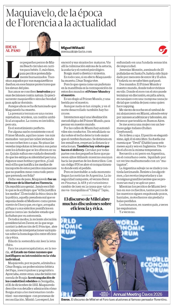 Maquiavelo, de la época de Florencia a la actualidad Miguel Wiñazki Maquiavelo, de la época de Florencia a la actualidad IDEAS AL PASO Los pequeños perros de Miami Beach circulan en carritos para bebés. O, más bien, para perritos pretendidamente humanizados. Transitan aupados por sus maquiavélicos dueños; en esos brazos protectores que los elevan del piso. Sus amos se conciben benévolos por esas decisiones contra natura. Es precisamente maquiavélico simular bondad para aplicar dominio. Aunque ahora se ha dictaminado que Maquiavelo ha muerto. La presunta ternura es una correa sujetadora, wireless, un cordón umbilical atrapador. La correa es invisible, pero atal. Es el sometimiento perfecto. Por alguna razón consistente con el Primer Mundo, aquí los canes –los más menudos– van por las calles levitando en sus cochecitos o a upa. No pisan las veredas impolutas ni levantan sus patas ante los árboles que se les ofrecen en vano. Quizás sufran ese cuidado desmedido que les extirpa su identidad perruna. Algunos usan botitas y gorritos. ¿Cuál será el fin que justifica los medios de transporte de estos perritos miamenses que no pueden mear como todo perro que pretenda ser feliz? Dicho sea de paso, Maquiavelo fue un defensor de la libertad en Florencia. Un republicano genial. Jamás escribió lo que se le atribuye: que “el fin justifica los medios”. Él escindió la ética cínica de la política, aquella pseudomoral que se exponía desde el Medioevo como proveniente de Dios y que, en rigor, arropaba al Papa y a sus ejércitos pontificios en guerra contra las ciudades-estado que luchaban por su autonomía. De todos modos, la reciente alocución presidencial en Davos; en la que se garantizó la defunción de El Príncipe, abre un campo de interpretaciones variopintas sobre la homologación entre eficiencia y ética. Bilardo la sostendría sin leer la letra chica. Para los anarcocapitalistas, en la teoría, el Estado no tiene razones que justifiquen su intromisión en la vida individual. Maquiavelo, por su parte, admiraba a César Borgia, un poderosísimo lobista del Papa, inescrupuloso y pragmático. Apreciaba, entre otras, una decisión tremenda de Borgia: la estrangulación de los condottieri rebeldes en Senigallia, el 31 de diciembre de 1502. Maquiavelo escribe con detalle y admiración cómo Borgia atrajo a los mercenarios condottieri –sus enemigos– con promesas de reconciliación. Mintió. Los esperó, los encerró y sus sicarios los mataron. Vio allí la culminación exitosa de la astucia, la audacia y el control psicológico. Borgia mató a diestra y siniestra. En todo caso, si en efecto Maquiavelo ha muerto, César Borgia vive. Pero lo que opera como un puñetazo en la mandíbula es la contraposición de estos dos mundos: el Primer Mundo y el nuestro. Es un elogio al Primer Mundo, y una herida por el nuestro. Aunque nada es tan simple, y en el norte desarrollado también hay horrores. Intentamos aquí una idealización metodológica del Primer Mundo, para pensar en nuestro mundo. Por las calles de Miami hay automóviles sin conductor. Un estrafalario radar sobre el techo detecta todo mejor que el cerebro humano. Se detienen en los semáforos, respetan la distancia y estacionan. También hay robots que hacen el delivery. Circulan por todas partes con dos pequeños faros que parecen ojitos titilando mientras avanzan hacia las puertas de los domicilios. Con un código PIN se abre el compartimento donde está el pedido. Pero es inevitable: a cada momento llegan las noticias de Argentina. La inseguridad rampante, el verano feroz en Pinamar, la AFA y el curiosísimo cambio de juez en la causa que -tal como va- tranquiliza al “Chiqui” Tapia, El discurso de Milei abre muchas discusiones sobre eficiencia y ética. WORLD ECONOMIC UM Davos. El discurso de Milei en el Foro tuvo alusiones al famoso pensador florentino. enfundado en una fundada sensación de impunidad. Jeremías Monzón, asesinado de 20 puñaladas en Santa Fe, habría sido liquidado por menores de entre 14 y 15 años. Y todavía no se sabe bien qué pasó. Dos mundos. El Primer Mundo y nuestro mundo, donde todos vivimos en vilo. Donde el roce con el otro puede terminar en discusión, en piña artera, en navajazo o en una tramposa causa judicial que cambia de juez como quien hace zapping. Me siento de noche en el umbral de mi alojamiento en Miami, adonde estoy por razones académicas y laborales, sin el temor que tendría en Buenos Aires. Se me acerca una mujer con un hermoso galgo italiano (Italian Greyhound). No lo lleva a upa. El perrito es elegantísimo, ágil; él sí está libre. Su dueña me cuenta que “Devil” (Diablo) pasa seis meses aquí y seis en Inglaterra. Vive todo el año en la misma temperatura. Recuerdo a mi perro en Argentina, en el conurbano oeste, liquidado por un vecino malhumorado con un “matagatos”. La Argentina salvaje no se rinde y continúa lastimando. Resiste a los algoritmos, a las recetas importadas y a las consignas grandilocuentes que se pronuncian mal y se aplican peor. Mientras los perritos de Miami levitan en sus cochecitos, tantos perros de los nuestros siguen esquivando pozos, barriales, motochorros sin piedad y balas perdidas. Los humanos, en nuestro país, a veces las esquivamos. Y a veces no. Annual Meeting Davos 2026 Menciones: Miami Beach, Primer Mundo, Argentina, Florencia, César Borgia, Senigallia, Davos, Milei, Santa Fe, Pinamar, AFA, Chiqui Tapia, Miami, Buenos Aires, Italian Greyhound