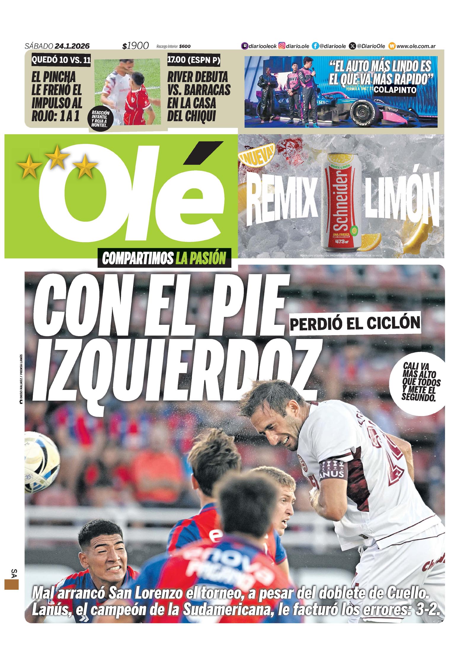 Olé tapa QUEDÓ 10 VS. 11 EL PINCHA LE FRENÓ EL IMPULSO AL ROJO: 1 A 1 REACCIÓN INFANTIL Y ROJA A MONTIEL 17.00 (ESPN P) RIVER DEBUTA VS. BARRACAS EN LA CASA DEL CHIQUI "EL AUTO MÁS LINDO ES EL QUE VA MÁS RÁPIDO" COLAPINTO PERDIÓ EL CICLÓN CON EL PIE IZQUIERDOZ Mal arrancó San Lorenzo el torneo, a pesar del doblete de Cuello. Lanús, el campeón de la Sudamericana, le facturó los errores: 3-2. CALI VA MÁS ALTO QUE TODOS Y METE EL SEGUNDO.