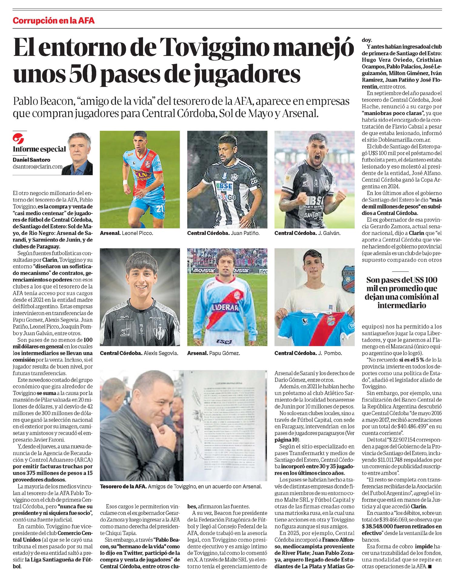 El entorno de Toviggino manejó unos 50 pases de jugadores Daniel Santoro Pablo Beacon, "amigo de la vida" del tesorero de la AFA, aparece en empresas que compran jugadores para Central Córdoba, Sol de Mayo y Arsenal. Informe especial Daniel Santoro dsantoro@clarin.com El otro negocio millonario del entorno del tesorero de la AFA, Pablo Toviggino, es la compra y venta de "casi medio centenar" de jugadores de fútbol de Central Córdoba, de Santiago del Estero: Sol de Mayo, de Río Negro: Arsenal de Sarandí, y Sarmiento de Junín, y de clubes de Paraguay. Según fuentes futbolísticas consultadas por Clarín, Toviggino y su entorno "diseñaron un sofisticado mecanismo" de contratos, gerenciamientos o poderes con esos clubes a los que el tesorero de la AFA tenía acceso por sus cargos desde el 2021 en la entidad madre del fútbol argentino. Estas empresas intervinieron en transferencias de Papu Gómez, Alexis Segovia, Juan Patiño, Leonel Picco, Joaquín Pombo y Juan Galván, entre otros. Son pases de no menos de 100 mil dólares en general en los cuales los intermediarios se llevan una comisión por la venta. Incluso, si el jugador resulta de buen nivel, por futuras transferencias. Este novedoso costado del grupo económico que gira alrededor de Toviggino se suma a la causa por la mansión de Pilar valuada en 20 millones de dólares, y al desvío de 42 millones de 300 millones de dólares que ganó la selección nacional en el exterior por su imagen, camisetas y amistosos y recaudó el empresario Javier Faroni. Y, desde el jueves, a una nueva denuncia de la Agencia de Recaudación y Control Aduanero (ARCA) por emitir facturas truchas por unos 375 millones de pesos a 15 proveedores dudosos. La mayoría de los medios vinculan al tesorero de la AFA Pablo Toviggino con el club de primera Central Córdoba, pero "nunca fue presidente y ni siquiera fue socio", contó una fuente judicial. En cambio, Toviggino fue vicepresidente del club Comercio Central Unidos (al que se le cayó un tribunal el mes pasado por su mal estado) y de esa entidad saltó a presidir la Liga Santiagueña de Fútbol. Arsenal. Leonel Picco. Central Córdoba. Juan Patiño. Central Córdoba. J. Galván. Central Córdoba. Alexis Segovia. Arsenal. Papu Gómez. Central Córdoba. J. Pombo. Tesorero de la AFA. Amigos de Toviggino, en un acuerdo con Arsenal. Esos cargos le permitieron vincularse con el ex gobernador Gerardo Zamora y luego ingresar a la AFA como mano derecha del presidente Chiqui Tapia. Sin embargo, a través "Pablo Beacon, su "hermano de la vida" como lo dijo en Twitter, participó de la compra y venta de jugadores" de Central Córdoba, entre otros clubes, afirmaron las fuentes. A su vez, Beacon fue presidente de la Federación Patagónica de Fútbol y llegó al Consejo Federal de la AFA, donde trabajó en la asesoría legal, con Toviggino como presidente ejecutivo y es amigo íntimo de Toviggino, tal como lo comentó en X. A través de Malte SRL ya el entorno tenía el gerenciamiento de... Arsenal de Sarandí y los derechos de Darío Gómez, entre otros. Además, en 2021 le habían hecho un préstamo al club Atlético Sarmiento de la localidad bonaerense de Junín por 10 millones de pesos. No solo eran clubes locales, sino a través de Fútbol Capital, con sede en Paraguay, intervendrían en los pases de jugadores paraguayos (Ver página 10). Según el sitio especializado en pases Transfermarkt y medios de Santiago del Estero, Central Córdoba incorporó entre 30 y 35 jugadores en los últimos cinco años. Los pases se habrían hecho a través de distintas empresas donde figuran miembros de su entorno como Malte SRL y Fútbol Capital, tras de las firmas creadas como una matrioska rusa, en la cual una tiene acciones en otra y Toviggino figura aunque sí sus amigos. En 2025, por ejemplo, Central Córdoba incorporó a Franco Alfonso, mediocampista proveniente de River Plate; Juan Pablo Zozaya, arquero llegado desde Estudiantes de La Plata y Matías Go- doy. Y antes habían ingresado al club de primera de Santiago del Estero: Hugo Vera Oviedo, Cristhian Ocampos, Pablo Palacios, José Leguizamón, Milton Giménez, Iván Ramírez, Juan Patiño y José Florentín, entre otros. En septiembre del año pasado el tesorero de Central Córdoba, José Hache, renunció a su cargo por "maniobras poco claras", ya que habría sido el encargado de la contratación de Flavio Cabral a pesar de que estaba lesionado, informó el sitio Dobleamarilla.com.ar. El club de Santiago del Estero pagó U$S 100 mil por el préstamo del futbolista pero, el delantero estaba lesionado y eso molestó al presidente de la entidad, José Alfano. Central Córdoba ganó la Copa Argentina en 2024. En los últimos años el gobierno de Santiago del Estero le dio "más de mil millones de pesos" en subsidios a Central Córdoba. El ex gobernador de esa provincia, Gerardo Zamora, actual senador nacional, dijo a Clarín que "el aporte a Central Córdoba que viene haciendo el gobierno provincial (que además es un club de bajo presupuesto comparado con otros Son pases de US$ 100 mil en promedio que dejan una comisión al intermediario equipos) nos ha permitido a los santiagueños jugar la Copa Libertadores, y que le ganemos al Flamengo en el Maracaná (único equipo argentino que lo logró). "No recuerdo si es el 5% de lo que la provincia invierte en todos los deportes como una política de Estado", añadió el legislador aliado de Toviggino. Sin embargo, por ejemplo, una fiscalización del Banco Central de la República Argentina descubrió que Central Córdoba "de mayo 2016 a mayo 2017, recibió acreditaciones por un total de $40.486.499" en su cuenta corriente". Del total $22.907.154 corresponden a pagos del Gobierno de la Provincia de Santiago del Estero, incluyendo $11.011.748 respaldados por un convenio de publicidad suscripto entre ambos". "El resto se completa con transferencias recibidas de la Asociación del Fútbol Argentino", agregó el informe que es