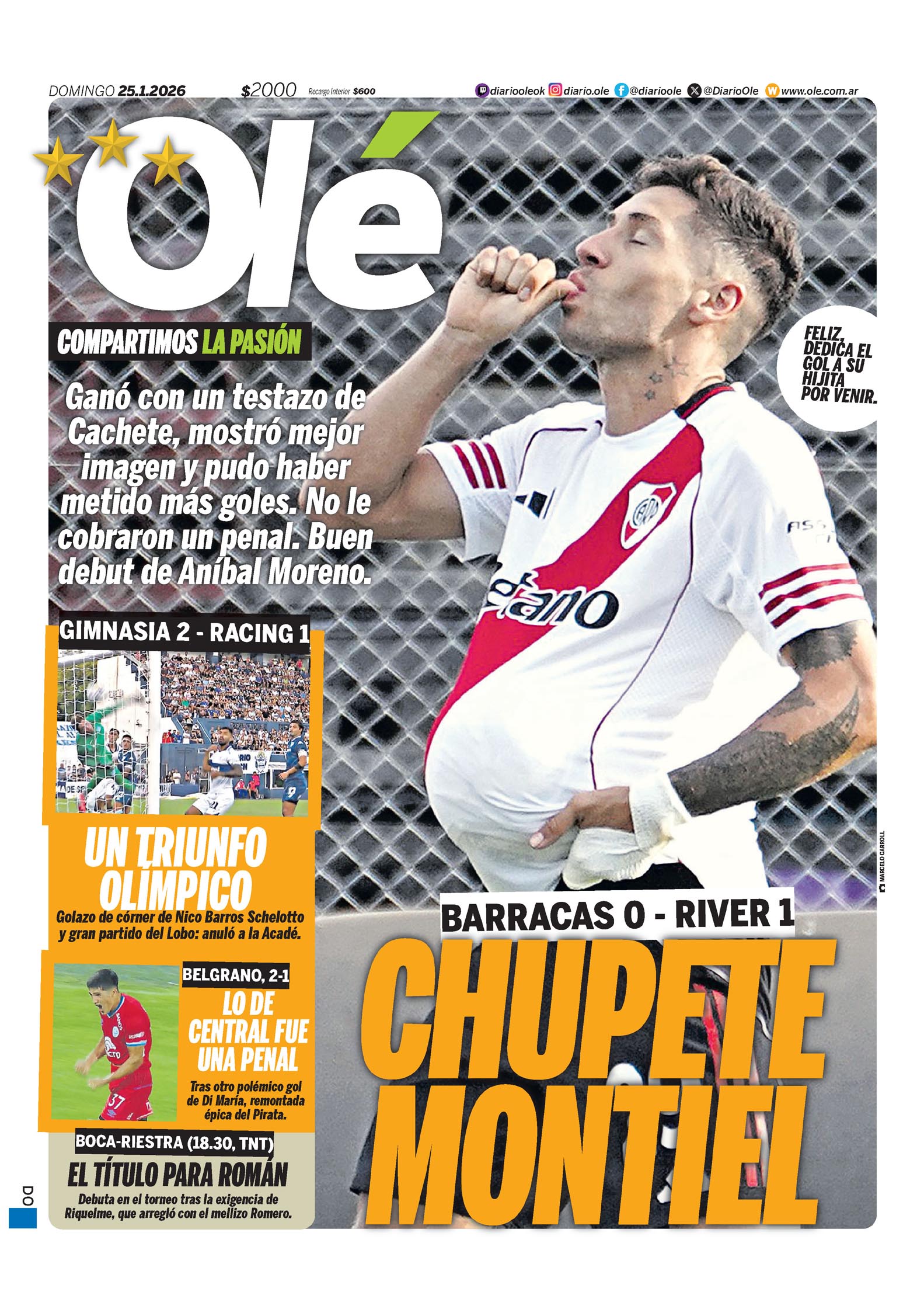Olé Tapa BARRACAS 0 - RIVER 1 CHUPETE MONTIEL Ganó con un testazo de Cachete, mostró mejor imagen y pudo haber metido más goles. No le cobraron un penal. Buen debut de Aníbal Moreno. FELIZ, DEDICA EL GOL A SU HIJITA POR VENIR. GIMNASIA 2 - RACING 1 UN TRIUNFO OLÍMPICO Golazo de córner de Nico Barros Schelotto y gran partido del Lobo: anuló a la Acadé. BELGRANO, 2-1 LO DE CENTRAL FUE UNA PENAL Tras otro polémico gol de Di María, remontada épica del Pirata. BOCA-RIESTRA (18.30, TNT) EL TÍTULO PARA ROMÁN Debuta en el torneo tras la exigencia de Riquelme, que arregló con el mellizo Romero.