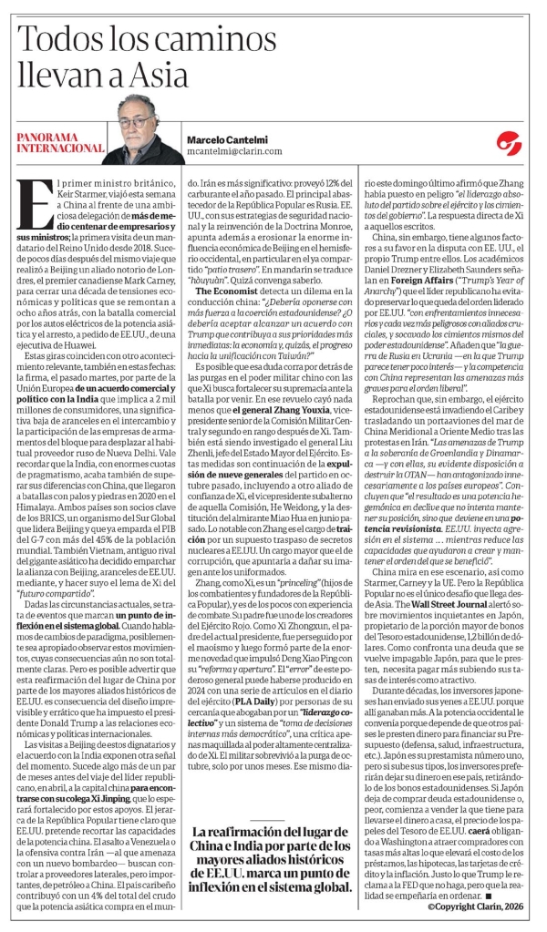 Todos los caminos llevan a Asia Marcelo Cantelmi El primer ministro británico, Keir Starmer, viajó esta semana a China al frente de una ambiciosa delegación de más de medio centenar de empresarios y ministros; la primera visita de un mandatario del Reino Unido desde 2018. Sucede pocos días después del mismo viaje que realizó a Beijing un aliado notorio de Londres, el premier canadiense Mark Carney, para cerrar una década de tensiones económicas y políticas que se remontan a ocho años atrás, con la batalla comercial por los autos eléctricos de la potencia asiática y el arresto, a pedido de EE.UU., de una ejecutiva de Huawei. Estas giras coinciden con otro acontecimiento relevante, también en estas fechas: la firma, el pasado martes, por parte de la Unión Europea de un acuerdo comercial y político con la India que implica a 2 mil millones de consumidores, una significativa baja de aranceles en el intercambio y la participación de las empresas de armamentos del bloque para desplazar al habitual proveedor ruso de Nueva Delhi. Vale recordar que la India, con enormes cuotas de pragmatismo, acaba también de superar sus diferencias con China, que llegaron a batallas con palos y piedras en 2020 en el Himalaya. Ambos países son socios clave de los BRICS, un organismo del Sur Global que lidera Beijing y que ya emparda el PIB del G-7 con más del 45% de la población mundial. También Vietnam, antiguo rival del gigante asiático ha decidido empachar la alianza con Beijing, aranceles de EE.UU. mediante, y hacer suyo el lema de Xi del “futuro compartido”. Dadas las circunstancias actuales, se trata de eventos que marcan un punto de inflexión en el sistema global. Cuando hablamos de cambios de paradigma, posiblemente sea apropiado observar estos movimientos, cuyas consecuencias aún no son totalmente claras. Pero es posible advertir que esta reafirmación del lugar de China por parte de los mayores aliados históricos de EE.UU. es consecuencia del diseño imprevisible y errático que ha impuesto el presidente Donald Trump a las relaciones económicas y políticas internacionales. Las visitas a Beijing de estos dignatarios y el acuerdo con la India exponen otra seña del momento. Sucede algo más de un par de meses antes del viaje del líder republicano, en abril, a la capital china para encontrarse con su colega Xi Jinping, que lo esperará fortalecido por estos apoyos. El jerarca de la República Popular tiene claro que EE.UU. pretende recortar las capacidades de la potencia china. El asalto a Venezuela o la ofensiva contra Irán —al que amenazan con un nuevo bombardeo— buscan controlar a proveedores laterales, pero importantes, de petróleo a China. El país caribeño contribuyó con un 4% del total del crudo que la potencia asiática compra en el mundo. Irán es más significativo: proveyó 12% de combustible el año pasado. El principal abastecedor de la República Popular es Rusia. EE. UU., con sus estrategias de seguridad nacional y la reinvención de la Doctrina Monroe, apunta además a erosionar la enorme influencia económica de Beijing en el hemisferio occidental, en particular en el ya compartido “patio trasero”. En mandarín se traduce “hòuyuán”. Quizá convenga saberlo. The Economist detecta un dilema en la conducción china: “¿Debería oponerse con más fuerza a la coerción estadounidense? ¿O debería aceptar alcanzar un acuerdo con Trump que contribuya a sus prioridades más inmediatas: la economía y, quizás, el progreso hacia la unificación con Taiwán?” Es posible que esa duda corra por detrás de las purgas en el poder militar chino con las que Xi busca fortalecer su supremacía ante la batalla por venir. En ese revuelo cayó nada menos que el general Zhang Youxia, vicepresidente senior de la Comisión Militar Central y segundo en rango después de Xi. También está siendo investigado el general Liu Zhenli, jefe del Estado Mayor del Ejército. Estas medidas son continuación de la expulsión de nueve generales del partido en octubre pasado, incluyendo a otro aliado de confianza de Xi, el vicepresidente subalterno de aquella Comisión, He Weidong, y la destitución del almirante Miao Hua en junio pasado. Lo notable con Zhang es el cargo de traición por un supuesto traspaso de secretos nucleares a EE.UU. Un cargo mayor que el de corrupción, que apuntaría a dañar su imagen ante los uniformados. Zhang, como Xi, es un “princeling” (hijos de los combatientes y fundadores de la República Popular), y es de los pocos con experiencia de combate. Su padre fue uno de los creadores del Ejército Rojo. Como Xi Zhongxun, el padre del actual presidente, fue perseguido por el maoísmo y luego formó parte de la enorme novedad que impulsó Deng Xiao Ping con su “reforma y apertura”. El “error” de este poderoso general puede haberse producido en 2024 con una serie de artículos en el diario del ejército (PLA Daily) por personas de su cercanía que abogaban por un “liderazgo colectivo” y un sistema de “toma de decisiones internas más democrático”, una crítica apenas maquillada al poder altamente centralizado de Xi. El militar sobrevivió a la purga de octubre, solo por unos meses. Ese mismo día, el diario este domingo último afirmó que Zhang había puesto en peligro “el liderazgo absoluto del partido sobre el ejército y los cimientos del gobierno”. La respuesta directa de Xi a aquellos escritos. China, sin embargo, tiene algunos factores a su favor en la disputa con EE. UU., el propio Trump entre ellos. Los académicos Daniel Drezner y Elizabeth Saunders señalan en Foreign Affairs (“Trump’s Year of Anarchy”) que el líder republicano ha evitado preservar lo que queda del orden liderado por EE.UU. “con enfrentamientos innecesarios y cada vez más peligrosos con aliados cruciales, y socavado los cimientos mismos del poder estadounidense”. Añaden que “la guerra de Rusia en Ucrania —en la que Trump parece t