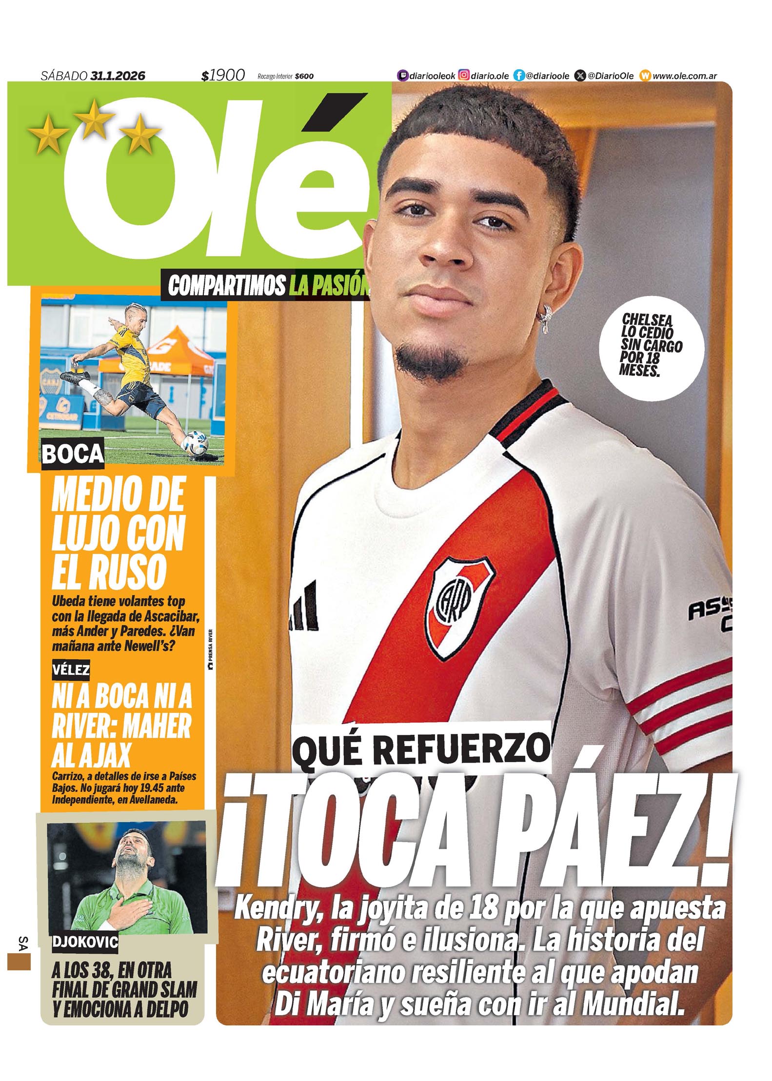 Olé tapa QUÉ REFUERZO ¡TOCA PÁEZ! Kendry, la joyita de 18 por la que apuesta River, firmó e ilusiona. La historia del ecuatoriano resiliente al que apodan Di María y sueña con ir al Mundial. CHELSEA LO CEDIÓ SIN CARGO POR 18 MESES. BOCA MEDIO DE LUJO CON EL RUSO Ubeda tiene volantes top con la llegada de Ascacibar, más Ander y Paredes. ¿Van mañana ante Newell’s? VÉLEZ NI A BOCA NI A RIVER: MAHER AL AJAX Carrizo, a detalles de irse a Países Bajos. No jugará hoy 19.45 ante Independiente, en Avellaneda. DJOKOVIC A LOS 38, EN OTRA FINAL DE GRAND SLAM Y EMOCIONA A DEL