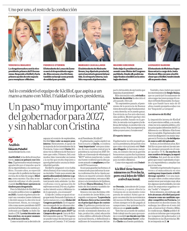 Un paso "muy importante" del gobernador para 2027, y sin hablar con Cristina Eduardo Paladini Uno por uno, el resto de la conducción VERONICA MAGARIO La vicegobernadora será la vicepresidenta primera del PJ bonaerense. Responde a Kicillof y fue la primera opción de este espacio para reemplazar a Máximo. FEDERICO OTERMIN El intendente de Lomas de Zamora será el vicepresidente segundo. Más cercano a los Kirchner, también se barajó como prenda de unidad para presidir. MARIANO CASCALLARES El exintendente de Almirante Brown, hoy diputado provincial, será el secretario general del partido. En el reparto interno, también responde al gobernador. MAXIMO KIRCHNER Debe dejar la presidencia para asumir como titular del Congreso partidario. Desde allí, podrá manejar fondos e incidirá en la estrategia electoral. LEONARDO NARDINI El intendente de Malvinas Argentinas estará a cargo de la Junta Electoral. Más cercano a los Kirchner que a Kicillof, tendrá desde allí un puesto clave. Así lo consideró el equipo de Kicillof, que aspira a un mano a mano con Milei. Frialdad con la ex presidenta. Análisis Eduardo Paladini epaladini@clarin.com Axel Kicillof, lo ha dicho él muchas veces, nunca se peleará con Cristina. El gobernador estará siempre agradecido por el impulso que le dio la expresidenta a su carrera política. Durante años, se especuló con que ella lo prefería incluso por encima de su hijo de sangre, Máximo, como sucesor. Esa idea se terminó de esfumar el año pasado, cuando los Kirchner operaron en tándem para desgastarlo. Pero la fidelidad de Kicillof con su madre política tuvo un quiebre en 2025, cuando el gobernador desoyó sus consejos (antes órdenes) y decidió separar la elección local bonaerense. Ahora, su consagración como nuevo presidente del PJ provincial tiene un dato central, corroborado por Clarín: no hubo llamado a CFK. La relación entre ambos está hoy, en su peor momento; el de la relación. Como ocurrió con la decisión de separar el comicio de septiembre, Kicillof hizo valer su mayor peso interno. Básicamente, el apoyo de la mayoría de los intendentes de la Provincia. Como contó Clarín, Máximo vio la diferencia de fuerzas y tuvo que ceder. Primero, fiel a sus modos, hizo trascender un jueves por la noche que estaba dispuesto a que el gobernador asuma la titularidad del partido. Kicillof lo ninguneó: si no había oferta formal, él no tomaría ninguna decisión. Y más: para asumir, requería alineamiento interno y garantías de que La Cámpora no lo traicionaría más adelante. La desconfianza con la agrupación de ex jóvenes es total. Por eso, el gobernador intentó acotar a Máximo todo lo que pudo. ¿Le alcanzará? El hijo de Cristina ocupará el cargo que tenía Fernando Espinoza, el barón matancero, como titular del Congreso partidario. Es el organismo encargado de las alianzas electorales. ¿Desde allí podrá condicionar al gobernador para 2027? La Cámpora dice que sí. Cerca de Kicillof responden que no: “El Congreso puede tomar decisiones que no pasen por el Consejo. Y el Consejo es el Presidente (Kicillof)”. El gobernador, según explicó un funcionario a Clarín, considera “muy importante” este paso interno, de cara a la pelea central por la presidencia nacional en 2027. De detalle: en el mensaje de whatsapp el “MUY” está en mayúscula. La misma fuente confirmó que la idea para ese armado es ampliarse por fuera del PJ bonaerense. Acaso para guardar las formas, el comunicado para informar la nueva conformación de la cúpula partidaria se repartió primero desde usinas camporistas, cercanas a Máximo y a la intendenta de Quilmes, la fitness Mayra Mendoza. Pero el texto del documento también tiene señales kicillofistas. Arranca con una durísima crítica al modelo de Javier Milei, y en seguida contrapone: “La provincia de Buenos Aires se ha convertido en el principal dique de contención. El gobierno provincial asumió la responsabilidad de ser red y escudo: sosteniendo derechos, trabajo, producción, salud, educación y obra pública allí donde el Estado nacional deserta, y defendiendo a millones de bonaerenses del im- pacto del modelo de exclusión que impulsa el presidente”. Más sintomático aún, reivindica la idea de desdoblar la elección el año pasado. Dice así: “En septiembre pasado, el peronismo de la provincia de Buenos Aires demostró algo fundamental: a esta derecha se le puede ganar. Esa victoria no fue solo electoral, sino política. Mostró que hay otro camino posible, basado en la gestión, la cercanía con la gente y la defensa del trabajo, la producción y la justicia social. Hoy, esa experiencia debe proyectarse y fortalecerse”. El reparto interno El gobernador no sólo se quedó para sí la presidencia del partido sino que como vice primera está Verónica Magario, la baronesa matancera, su número dos en la gestión bonaerense y quien fue la primera candidata propuesta por Kicillof para suceder a Máximo. Como vice segundo está Federi- Kicillof tiene buenos números en Provincia, pero está lejos de Milei a nivel nacional. co Otermín, intendente de Lomas de Zamora, y a quien ofrecía La Cámpora en un momento como prenda de unidad. Habrá que seguir con atención los movimientos del sucesor de Martín Insaurralde: si bien siempre se lo dio pegado a camporismo, hay quienes hoy lo ubican en un punto medio. “Esto fue un acuerdo de unidad. Fede trabajó mucho para que suceda y consolidó un vínculo con Cristina y con Axel muy fuerte”, señaló a Clarín una fuente partidaria. También, claro, habrá que seguir los movimientos de Sergio Massa, que no participó formalmente de estas negociaciones porque él conduce el Frente Renovador. Es el partido que fundó hace más de 10 años, cuando prometía acabar con los “ñoquis de La Cámpora”. Los números de Kicillof La imposición interna de Kicillof en el peronismo refleja, a su modo, cómo los ve la opinión pública a él y l