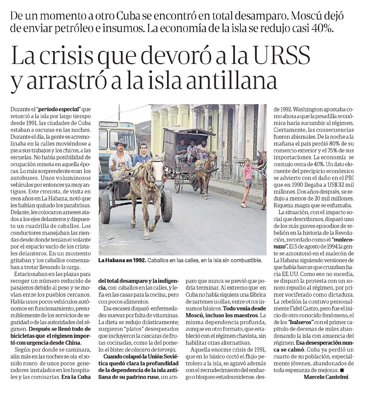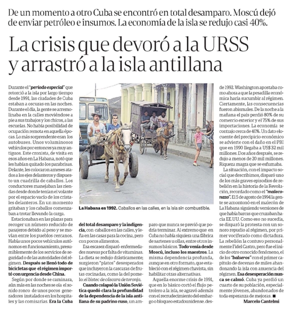 La crisis que devoró a la URSS y arrastró a la isla antillana Marcelo Cantelmi De un momento a otro Cuba se encontró en total desamparo. Moscú dejó de enviar petróleo e insumos. La economía de la isla se redujo casi 40%. La crisis que devoró a la URSS y arrastró a la isla antillana Durante el “período especial” que torció a la isla por largo tiempo desde 1991, las ciudades de Cuba estaban a oscuras en las noches. Durante el día, la gente se arremolinaba en las calles moviéndose de sus trabajos y los chicos, a las escuelas. No había posibilidad de ocupación remota en aquella épocas. Lo más sorprendente eran los autobuses. Unos voluminosos vehículos por entonces ya muy antiguos. Este cronista, de visita en esos años en La Habana, notó que les habían quitado los parabrisas. Delante, les colocaron arneses atados a los ejes delanteros y dispuesto a un cuadrilla de caballos. Los conductores manejaban las riendas desde donde tenían el volante o el espacio vacío de los cristales delanteros. En un momento gritaban y los caballos comenzaban a trotar llevando la carga. Estacionaban en las plazas para recoger un número reducido de pasajeros debido al peso y se movían entre los pueblos cercanos. Había unos pocos vehículos autónomos en funcionamiento, presumiblemente de los servicios de seguridad o de las autoridades del régimen. Después se llenó todo de bicicletas que el régimen importó con urgencia desde China. Según por donde se caminara, aún más en las noches se oía el sonido ronco de unos pocos generadores instalados en los hospitales y las comisarías. Era la Cuba del total desamparo y la indigencia, con caballos en las calles, y leña en las casas para la cocina, pero con pocos alimentos. Esa escasez disparó enfermedades nuevas por falta de vitaminas. La dieta se redujo drásticamente; surgieron “platos” desesperados que incluyeron la cáscaras de frutas cocinadas, como la del pomelo: el bistec de cáscara de toronja. Cuando colapsó la Unión Soviética quedó clara la profundidad de la dependencia de la isla antillana de su padrino ruso, un amparo que nunca se previó que podría terminar. Al extremo que en Cuba no había siquiera una fábrica de sartenes u ollas, entre otros insumos básicos. Todo venía desde Moscú, incluso los maestros. La misma dependencia profunda, aunque en otro formato, que estableció con el régimen chavista, si habilitar otras alternativas. Aquella enorme crisis de 1991, que en lo básico cortó el flujo petrolero a la isla, se agravó además con el recrudecimiento del embargo o bloqueo estadounidense, desde 1992. Washington apostaba como ahora a que la pesadilla económica haría sucumbir al régimen. Ciertamente, las consecuencias fueron abismales. De la noche a la mañana el país perdió 80% de su comercio exterior y el 75% de su importaciones. La economía se contrajo cerca de 40%. Un dato elocuente del precipicio económico se advierte con el daño en el PBI que en 1990 llegaba a US$ 32 millones. Dos años después, se redujo a menos de 20 mil millones. Riqueza magra que se esfumaba. La situación, con el impacto social que describimos, disparó uno de los más graves episodios de rebelión en la historia de la Revolución, recordado como el “maleconazo”. El 5 de agosto de 1994 la gente se amontonó en el malecón de La Habana siguiendo versiones de que había barcas que cruzaban hacia EE.UU. Como eso no sucedía, se disparó la protesta con un sonoro repudio al régimen, por primera vociferado como dictadura. La rebelión la contuvo personalmente Fidel Castro, pero fue el inicio de otro conocido fenómeno, el de los “balseros” con el primer capítulo de decenas de miles abandonando la isla con anuencia del régimen. Esa desesperación nunca se calmó. Cuba ya perdió un cuarto de su población, especialmente jóvenes, abandonados de toda esperanza de mejoras. Marcelo Cantelmi Menciones: Cuba, Unión Soviética, Moscú, Washington, Fidel Castro, La Habana, China, EE.UU.