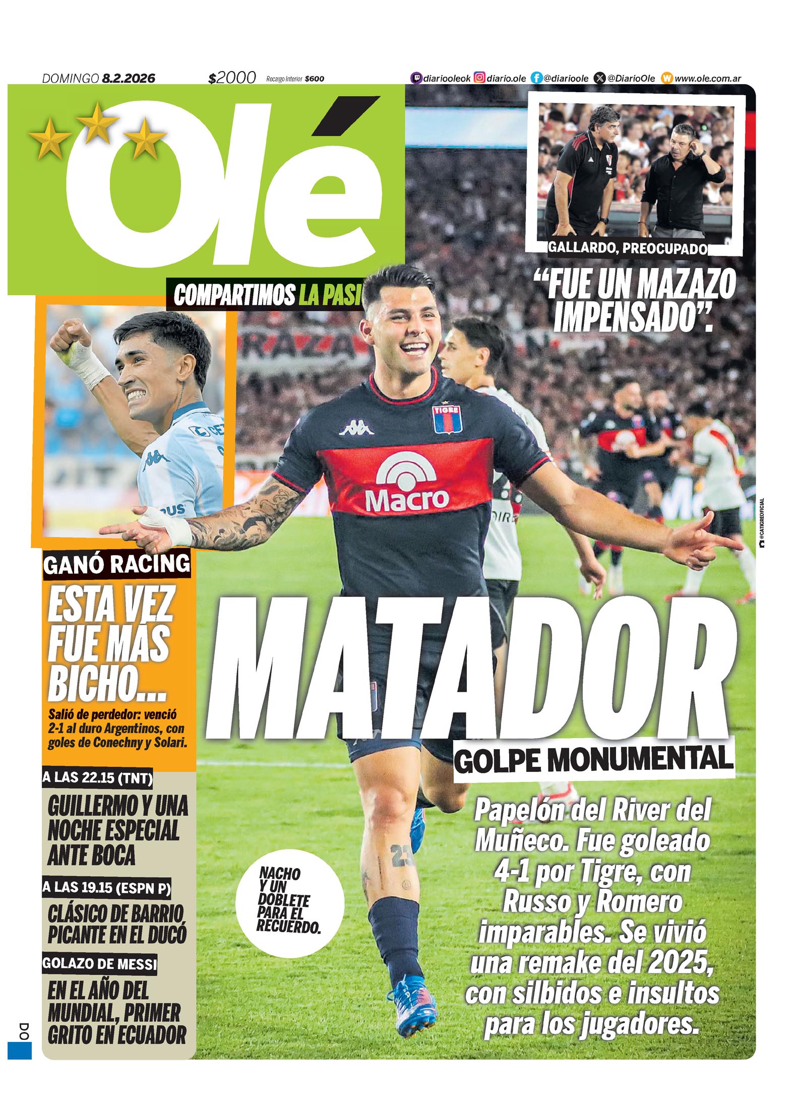 Olé Tapa MATADOR GOLPE MONUMENTAL Papelón del River del Muñeco. Fue goleado 4-1 por Tigre, con Russo y Romero imparables. Se vivió una remake del 2025, con silbidos e insultos para los jugadores. NACHO Y UN DOBLETE PARA EL RECUERDO. GALLARDO, PREOCUPADO "FUE UN MAZAZO IMPENSADO". GANÓ RACING ESTA VEZ FUE MÁS BICHO... Salió de perdedor: venció 2-1 al duro Argentinos, con goles de Conechny y Solari. A LAS 22.15 (TNT) GUILLERMO Y UNA NOCHE ESPECIAL ANTE BOCA A LAS 19.15 (ESPN P) CLÁSICO DE BARRIO PICANTE EN EL DUCÓ GOLAZO DE MESSI EN EL AÑO DEL MUNDIAL, PRIMER GRITO EN ECUADOR