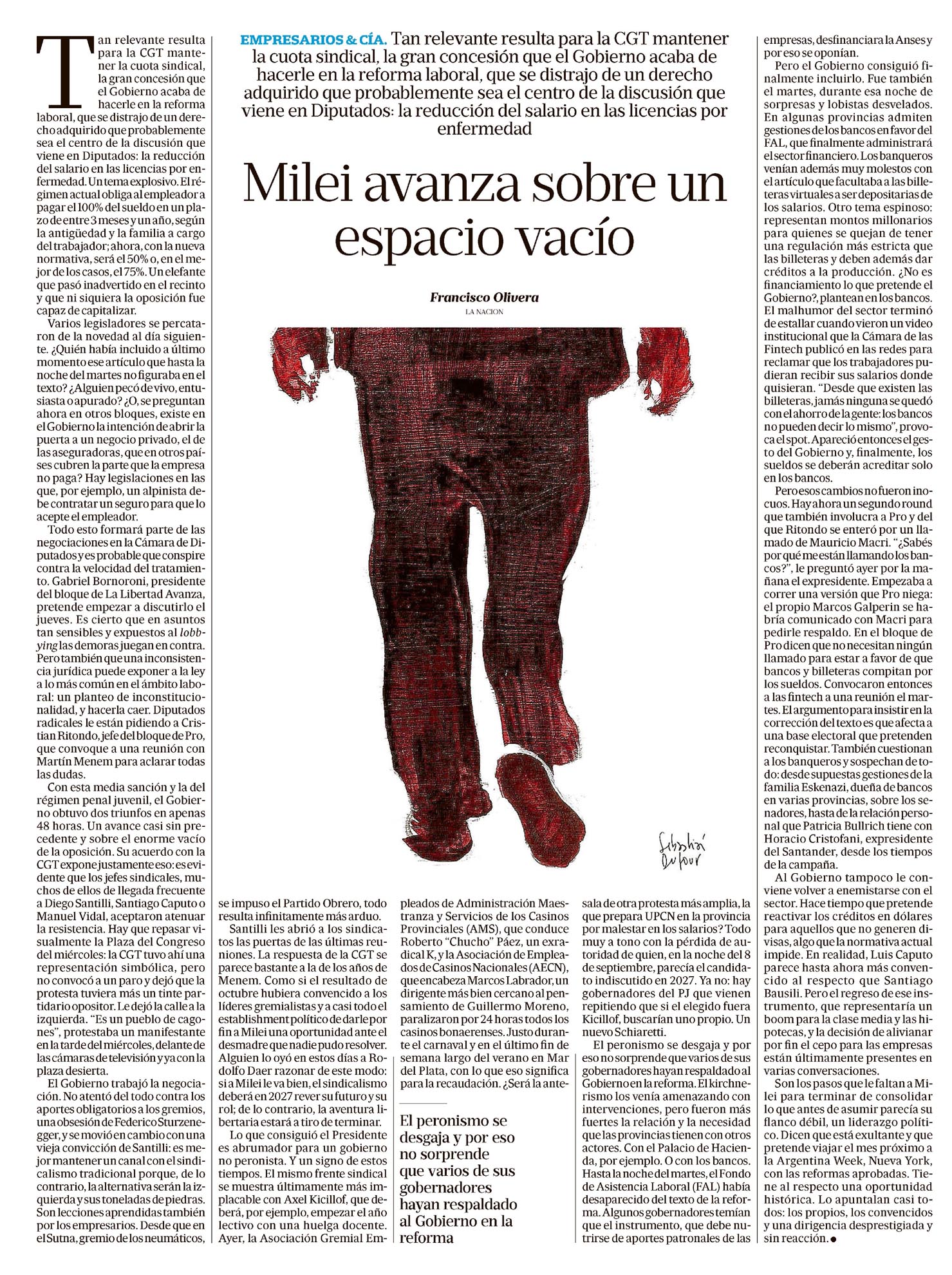 Milei avanza sobre un espacio vacío Francisco Olivera Tan relevante resulta para la CGT mantener la cuota sindical, la gran concesión que el Gobierno acaba de hacerle en la reforma laboral, que se distrajo de un derecho adquirido que probablemente sea el centro de la discusión que tiene en Diputados: la reducción del salario en las licencias por enfermedad. Un tema explosivo. El régimen actual obliga al empleador a pagar el 100% del sueldo en un plazo de entre 3 meses y un año, según la antigüedad y la familia a cargo del trabajador; ahora, con la nueva normativa, será el 50% o, en el mejor de los casos, el 75%. Un elefante que pasó inadvertido en el recinto y que ni siquiera la oposición fue capaz de capitalizar. Varios legisladores se percataron de la novedad al día siguiente. ¿Quién había incluido a último momento ese artículo que hasta la noche del martes no figuraba en el texto? ¿Alguien pecó de vivo, entusiasta o apurado? ¿O, se pregunta ahora en otros bloques, existe en el Gobierno la intención de abrir la puerta a un negocio privado, el de las aseguradoras, que en otros países cubren la parte que la empresa no paga? Hay legislaciones en las que, por ejemplo, un alpinista debe contratar un seguro para que acepte el empleador. Todo esto formará parte de las negociaciones en la Cámara de Diputados y es probable que conspire contra la velocidad del tratamiento. Gabriel Bornoroni, presidente del bloque de La Libertad Avanza, pretende empezar a discutirlo el jueves. Es cierto que en asuntos tan sensibles y expuestos al lobbying las demoras juegan en contra. Pero también que una inconsistencia jurídica puede exponer a la ley, a lo más común en el ámbito laboral: un planteo de inconstitucionalidad, y hacerla caer. Diputados radicales le están pidiendo a Cristian Ritondo, jefe del bloque de Pro, que convoque a una reunión con Martín Menem para aclarar todas las dudas. Con esta media sanción y la del régimen penal juvenil, el Gobierno obtuvo dos triunfos en apenas 48 horas. Un avance casi sin precedente y sobre el enorme vacío de la oposición. Su acuerdo con la CGT expone justamente eso: es evidente que los jefes sindicales, muchos de ellos de llegada frecuente a Diego Santilli, Santiago Caputo o Manuel Vidal, aceptaron atenuar la resistencia. Hay que repasar visualmente la Plaza del Congreso el miércoles: la CGT tuvo ahí una representación simbólica, pero no convocó a un paro y dejó que la protesta tuviera más un tinte partidario opositor. Le dejó la calle a la izquierda. "Es un pueblo de cagones", protestaba un manifestante en la tarde del miércoles, delante de las cámaras de televisión y ya con la plaza desierta. El Gobierno trabajó la negociación. No atentó del todo contra los aportes obligatorios a los gremios, una obsesión de Federico Sturzenegger, y se movió en cambio con una vieja convicción de Santilli: es mejor mantener un canal con el sindicalismo tradicional porque, de lo contrario, la alternativa será la izquierda y sus toneladas de piedras. Son lecciones aprendidas también por los empresarios. Desde que el Sutna, gremio de los neumáticos, se impuso el Partido Obrero, todo resulta infinitamente más arduo. Santilli les abrió a los sindicatos las puertas de las últimas reuniones. La respuesta de la CGT se parece bastante a la de los años de Menem. Como si el resultado de octubre hubiera convencido a los líderes gremialistas y a casi todo el establishment político de darle por fin a Milei una oportunidad ante el desmadre que nadie pudo resolver. Alguien lo oyó en estos días a Rodolfo Daer razonar de este modo: si a Milei le va bien, el sindicalismo deberá en 2027 rever su futuro y su rol; de lo contrario, la aventura libertaria estará a tiro de terminar. Lo que consiguió el Presidente es abrumador para un gobierno no peronista. Y un signo de estos tiempos. El mismo frente sindical se muestra últimamente más implacable con Axel Kicillof, que deberá, por ejemplo, empezar el año lectivo con una huelga docente. Ayer, la Asociación Gremial Empleados de Administración Maestranza y Servicios de los Casinos Provinciales (AMS), que conduce Roberto "Chucho" Páez, un exradical K, y la Asociación de Empleados de Casinos Nacionales (AECN), que encabeza Marcos Labrador, un dirigente más bien cercano al pensamiento de Guillermo Moreno, paralizaron por 24 horas todos los casinos bonaerenses. Justo durante el carnaval y en el último fin de semana largo del verano en Mar del Plata, con lo que eso significaba para la recaudación. ¿Será la ante-sala de otra protesta más amplia, la que prepara UPCN en la provincia por malestar en los salarios? Todo muy a tono con la pérdida de autoridad de quien, en la noche del 8 de septiembre, parecía el candidato indiscutido en 2027. Ya no: hay gobernadores del PJ que vienen repitiendo que si el elegido fuera Kicillof, buscarían uno propio. Un nuevo Schiaretti. El peronismo se desgaja y por eso no sorprende que varios de sus Gobernadores hayan respaldado al Gobierno en la reforma. El kirchnerismo los venía amenazando con intervenciones, pero fueron más fuertes la relación y la necesidad que las provincias tienen con otros actores. Con el Palacio de Hacienda, por ejemplo. O con los bancos. Hasta la noche del martes, el Fondo de Asistencia Laboral (FAL) había desaparecido del texto de la reforma. Algunos gobernadores temían que el instrumento, que debe nutrirse de aportes patronales de las empresas, desfinanciara la Anses y por eso se oponían. Pero el Gobierno consiguió finalmente incluirlo. Fue también el martes, durante esa noche de sorpresas y lobistas desvelados. En algunas provincias admiten gestiones de los bancos en favor del FAL, que finalmente administrará el sector financiero. Los banqueros venían además muy molestos con el artículo que facultaba a las billeteras virtuales a ser depositarias de los salarios. Otro tema espinoso: representan montos millonarios par
