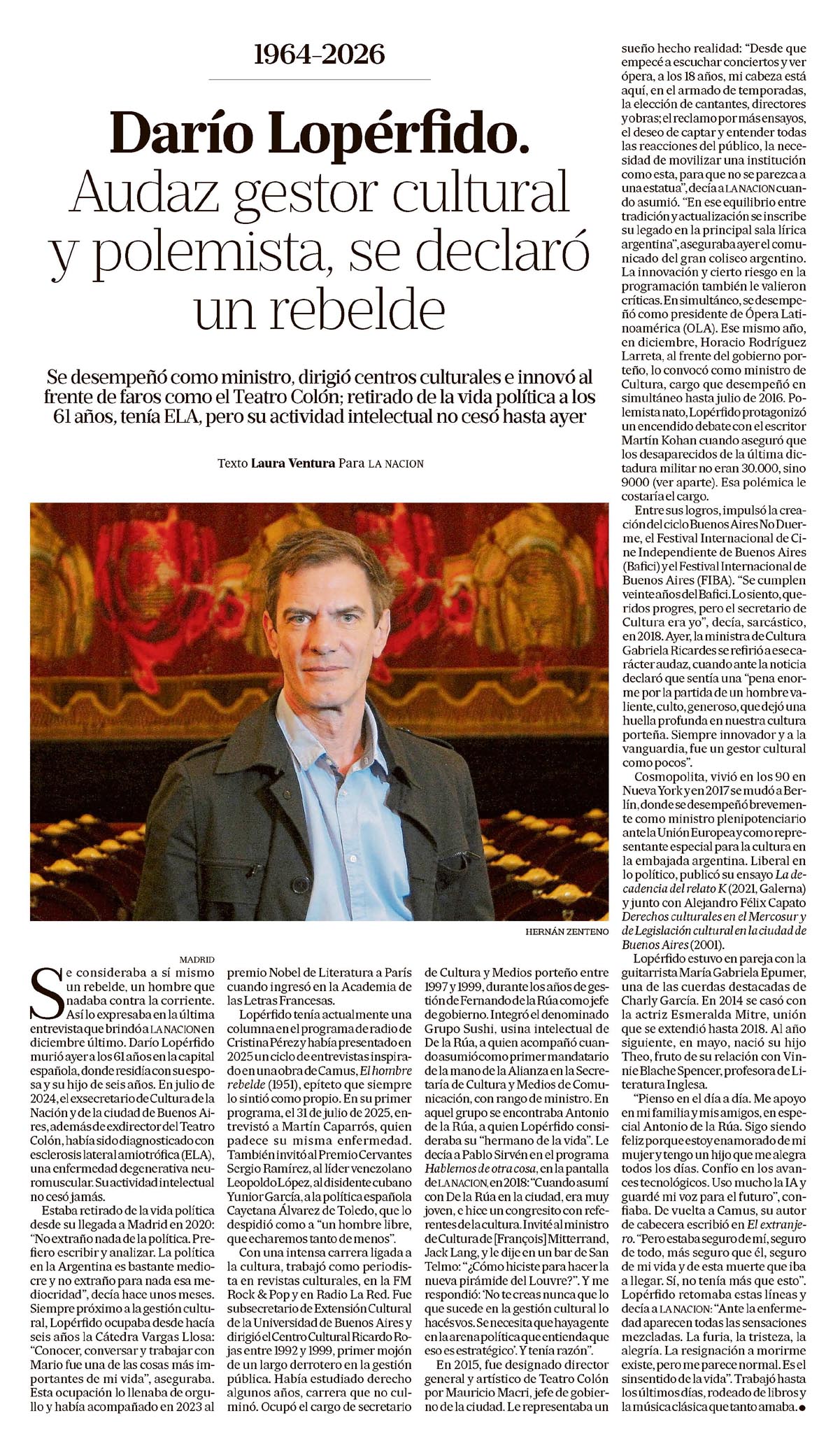 Darío Lopérfido. Audaz gestor cultural y polemista, se declaró un rebelde Laura Ventura 1964-2026 Darío Lopérfido. Audaz gestor cultural y polemista, se declaró un rebelde Se desempeñó como ministro, dirigió centros culturales e innovó al frente de faros como el Teatro Colón; retirado de la vida política a los 61 años, tenía ELA, pero su actividad intelectual no cesó hasta ayer. Texto Laura Ventura Para LA NACION HERNÁN ZENTENO MADRID Se consideraba a sí mismo un rebelde, un hombre que nadaba contra la corriente. Así lo expresaba en la última entrevista que brindó a LA NACION en diciembre último. Darío Lopérfido murió ayer a los 61 años en la capital española, donde residía con su esposa y su hijo de seis años. En julio de 2024, el exsecretario de Cultura de la Nación y de la ciudad de Buenos Aires, además de exdirector del Teatro Colón, había sido diagnosticado con esclerosis lateral amiotrófica (ELA), una enfermedad degenerativa neuromuscular. Su actividad intelectual no cesó jamás. Estaba retirado de la vida política desde su llegada a Madrid en 2020: “No extraño nada de la política. Prefiero escribir y analizar. La política en la Argentina es bastante mediocre y no extraño para nada esa mediocridad”, decía hace unos meses. Siempre próximo a la gestión cultural, Lopérfido ocupaba desde hacía seis años la Cátedra Vargas Llosa: “Conocer, conversar y trabajar con Mario fue una de las cosas más importantes de mi vida”, aseguraba. Esta ocupación lo llenaba de orgullo y había acompañado en 2023 al premio Nobel de Literatura a París cuando ingresó en la Academia de las Letras Francesas. Lopérfido tenía actualmente una columna en el programa de radio de Cristina Pérez y había presentado en 2025 un ciclo de entrevistas inspirado en una obra de Camus, El hombre rebelde (1951), epíteto que siempre lo sintió como propio. En su primer programa, el 31 de julio de 2025, entrevistó a Martín Caparrós, quien padece su misma enfermedad. También invitó al Premio Cervantes Sergio Ramírez, al líder venezolano Leopoldo López, al disidente cubano Yunior García, a la política española Cayetana Álvarez de Toledo, que lo despidió como a “un hombre libre, que echaremos tanto de menos”. Con una intensa carrera ligada a la cultura, trabajó como periodista en revistas culturales, en la FM Rock & Pop y en Radio La Red. Fue subsecretario de Extensión Cultural de la Universidad de Buenos Aires y dirigió el Centro Cultural Ricardo Rojas entre 1992 y 1999, primer mojón de un largo derrotero en la gestión pública. Había estudiado derecho algunos años, carrera que no culminó. Ocupó el cargo de secretario de Cultura y Medios porteño entre 1997 y 1999, durante los años de gestión de Fernando de la Rúa como jefe de gobierno. Integró el denominado Grupo Sushi, usina intelectual de De la Rúa, a quien acompañó cuando asumió como primer mandatario de la mano de la Alianza en la Secretaría de Cultura y Medios de Comunicación, con rango de ministro. En aquel grupo se encontraba Antonio de la Rúa, a quien Lopérfido consideraba su “hermano de la vida”. Le decía a Pablo Sirvén en el programa Hablemos de otra cosa, en la pantalla de LA NACION en 2018: “Cuando asumí con De la Rúa en la ciudad, era muy joven, e hice un congresito con referentes de la cultura. Invité al ministro de Cultura de [Francois] Mitterrand, Jack Lang, y le dije en un bar de San Telmo: “¿Cómo hiciste para hacer la nueva pirámide del Louvre?”. Y me respondió: “No te creas nunca que lo que sucede en la gestión cultural lo hacés vos. Se necesita que haya gente en la arena política que entienda que eso es estratégico”. Y tenía razón”. En 2015, fue designado director general y artístico de Teatro Colón por Mauricio Macri, jefe de gobierno de la ciudad. Le representaba un sueño hecho realidad: “Desde que empecé a escuchar conciertos y ver ópera, a los 18 años, mi cabeza está aquí, en el armado de temporadas, la elección de cantantes, directores y obras; el reclamo por más ensayos, el deseo de captar y entender todas las reacciones del público, la necesidad de movilizar una institución como esta, para que no se parezca a una estatua” decía a LA NACION cuando asumió. “En ese equilibrio entre tradición y actualización se inscribe su legado en la principal sala lírica argentina”, aseguraba ayer el comunicado del gran coliseo argentino. La innovación y cierto riesgo en la programación también le valieron críticas. En simultáneo, se desempeñó como presidente de Ópera Latinoamérica (OLA). Ese mismo año, en diciembre, Horacio Rodríguez Larreta, al frente del gobierno porteño, lo convocó como ministro de Cultura, cargo que desempeñó en simultáneo hasta julio de 2016. Polemista nato, Lopérfido protagonizó un encendido debate con el escritor Martín Kohan cuando aseguró que los desaparecidos de la última dictadura militar no eran 30.000, sino 9000 (ver aparte). Esa polémica lo costaría el cargo. Entre sus logros, impulsó la creación del ciclo Buenos Aires No Duerme, el Festival Internacional de Cine Independiente de Buenos Aires (Bafici) y el Festival Internacional de Buenos Aires (FIBA). “Se cumplen veinticinco años del Bafici. Los siento, queridos progres, pero el secretario de Cultura era yo”, decía, sarcástico, en 2018. Ayer, la ministra de Cultura Gabriela Ricardes se refirió a ese carácter audaz, cuando ante la noticia declaró que sentía una “pena enorme por la partida de un hombre valiente, culto, generoso, que dejó una huella profunda en nuestra cultura porteña. Siempre innovador y a la vanguardia, fue un gestor cultural como pocos”. Cosmopolita, vivió en los 90 en Nueva York y en 2017 se mudó a Berlín, donde se desempeñó brevemente como ministro plenipotenciario ante la Unión Europea y como representante especial para la cultura de la embajada argentina. Liberal en 