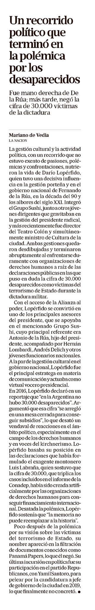 Un recorrido político que terminó en la polémica por los desaparecidos Mariano de Vedia Fue mano derecha de De la Rúa; más tarde, negó la cifra de 30.000 víctimas de la dictadura Mariano de Vedia LA NACION La gestión cultural y la actividad política, con un recorrido que no estuvo exento de pasiones, polémicas y confrontaciones, nutrieron la vida de Darío Lopérfido, quien tuvo una decisiva influencia en la gestión porteña y en el gobierno nacional de Fernando de la Rúa, en la década del 90 y los albores del siglo XXI. Integró el Grupo Sushi, junto a otros jóvenes dirigentes que gravitaban en la gestión del presidente radical, y más recientemente fue director del Teatro Colón y simultáneamente ministro de Cultura de la ciudad. Ambas gestiones quedaron desdibujadas y terminaron abruptamente al enfrentarse duramente con organizaciones de derechos humanos a raíz de las declaraciones públicas en las que puso en duda la cifra de 30.000 desaparecidos como víctimas del terrorismo de Estado durante la dictadura militar. Con el acceso de la Alianza al poder, Lopérfido se convirtió en uno de los principales asesores del presidente, que se apoyaba en el mencionado Grupo Sushi, cuyo principal referente era Antonio de la Rúa, hijo del presidente, acompañado por Hernán Lombardi, Andrés Delich y otros jóvenes funcionarios nacionales. A la par de la gestión cultural en el gobierno nacional, Lopérfido fue el principal estratega en materia de comunicación y actuaba como virtual vocero presidencial. En 2016, Lopérfido declaró en un reportaje que "en la Argentina no hubo 30.000 desaparecidos". Argumentó que esa cifra "se arregló en una mesa cerrada para conseguir subsidios", lo que desató un vendaval de reacciones en el ámbito político, especialmente en el campo de los derechos humanos y en voces del kirchnerismo. Lopérfido basaba su posición en las declaraciones que había formulado el exagente montonero Luis Labraña, quien sostuvo que la cifra de 30.000, que triplica los casos incluidos en el informe de la Conadep, había sido creada artificialmente por las organizaciones de derechos humanos para conseguir financiamiento internacional. Desatada la polémica, Lopérfido sostenía que "la memoria no puede reemplazar a la historia". Poco después de la polémica por su visión sobre las víctimas del terrorismo de Estado, su nombre apareció en la filtración de documentos conocidos como Panamá Papers, lo que él negó. Su última incursión en política fue su participación en el partido Republicanos, con Yamil Santoro, para pelear por la candidatura a jefe de gobierno de la ciudad en 2019, lo que finalmente no concretó. Menciones: Fernando de la Rúa, Darío Lopérfido, Grupo Sushi, Antonio de la Rúa, Hernán Lombardi, Andrés Delich, Luis Labraña, Conadep, Yamil Santoro, Panamá Papers, Alianza